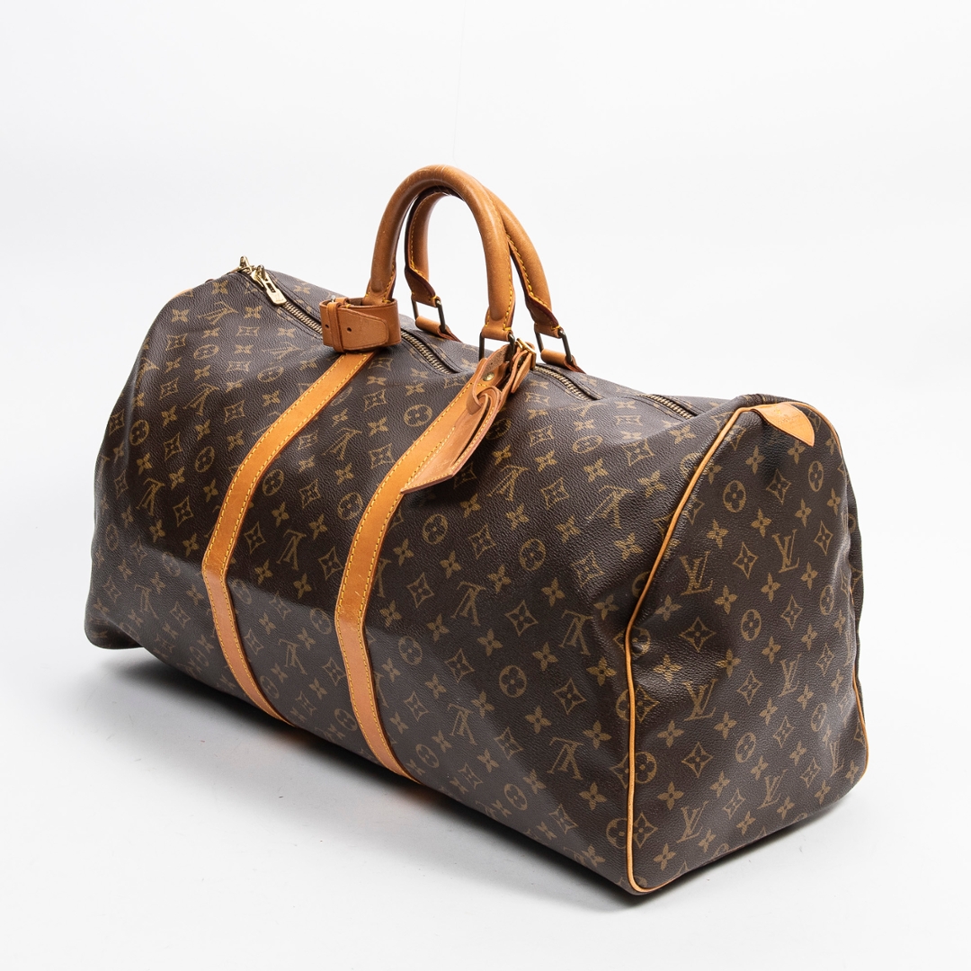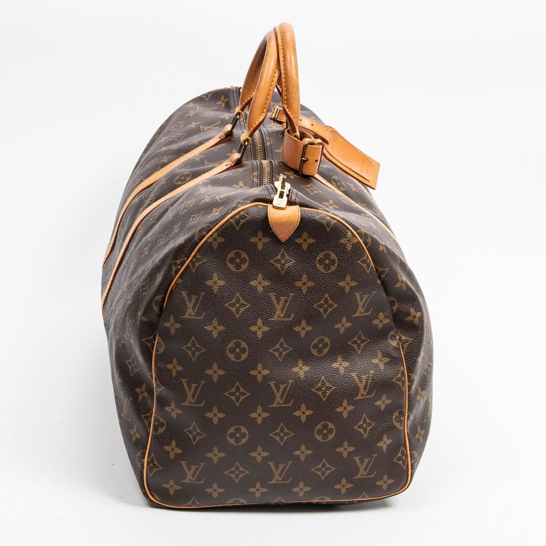 A vintage Louis Vuitton Keepall bag crafted in the iconic brown Monogram coated canvas, representing one of the house’s most celebrated and enduring travel designs. The classic silhouette is complemented by natural leather trim, rolled top handles, and signature detailing, delivering a timeless aesthetic that has defined luxury travel for decades.