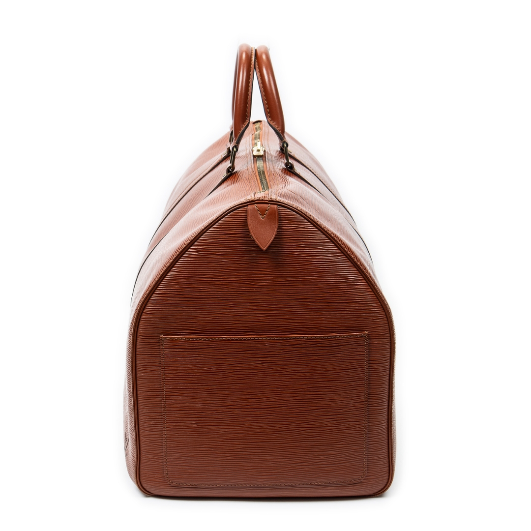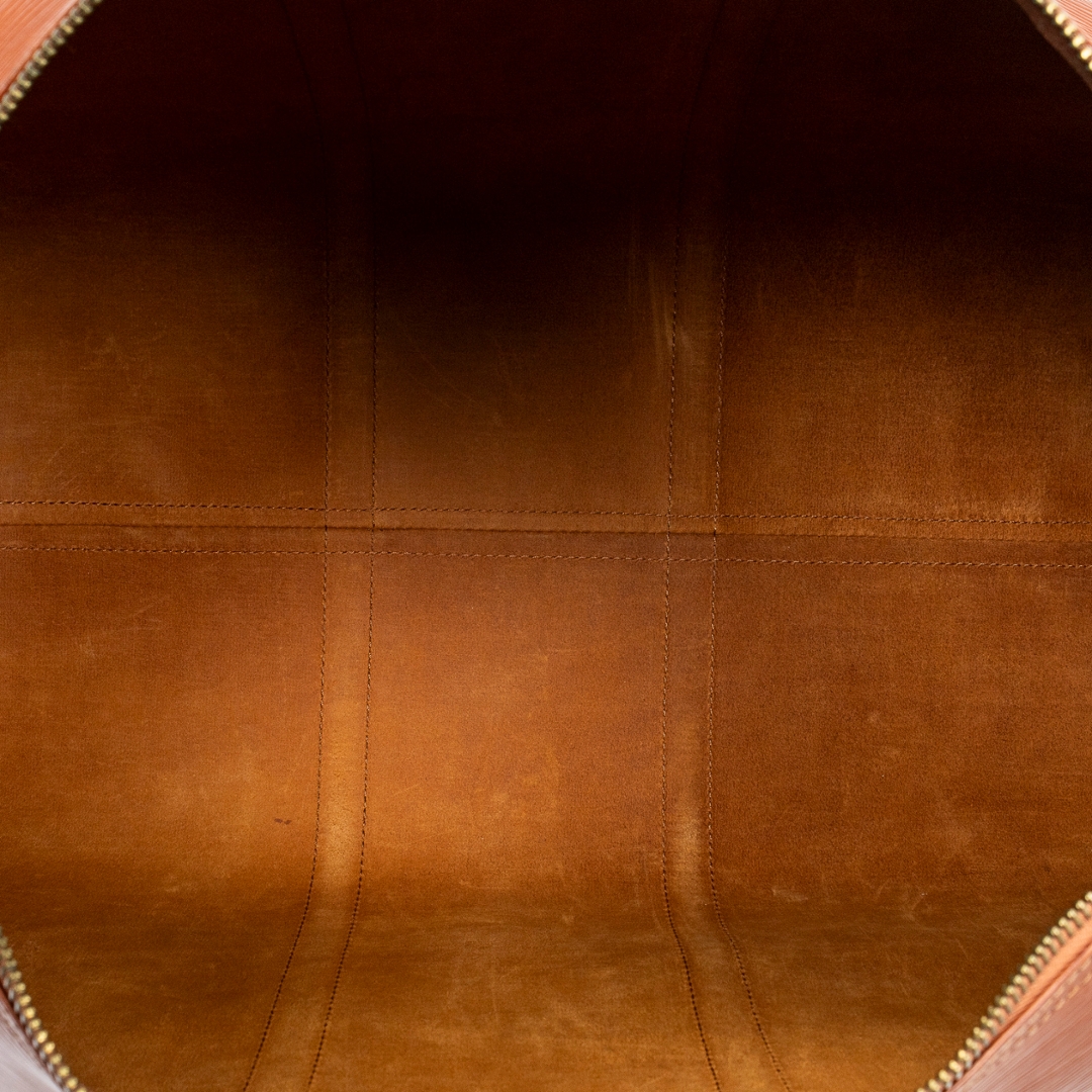 A vintage Louis Vuitton tan calf leather Keepall bag with a certificate of authenticity. Approximately 29cm height, 52cm width.