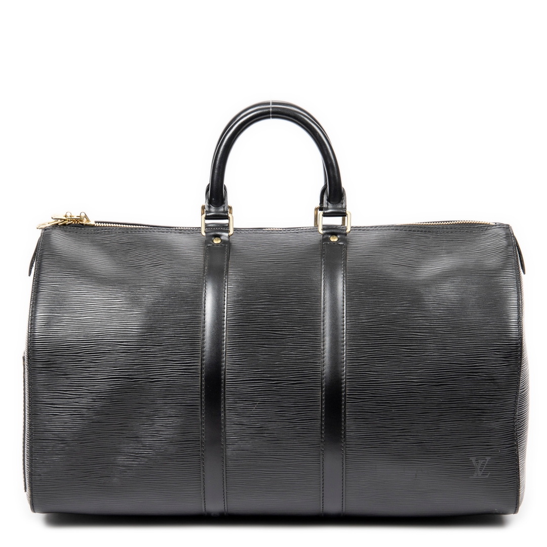 A vintage Louis Vuitton Keepall bag crafted in black calf leather, showcasing a refined interpretation of the house’s iconic travel silhouette. The textured leather exterior is complemented by matching rolled handles, structured strap detailing, and gold-tone hardware, delivering a sleek and understated aesthetic that reflects Louis Vuitton’s heritage of luxury craftsmanship.