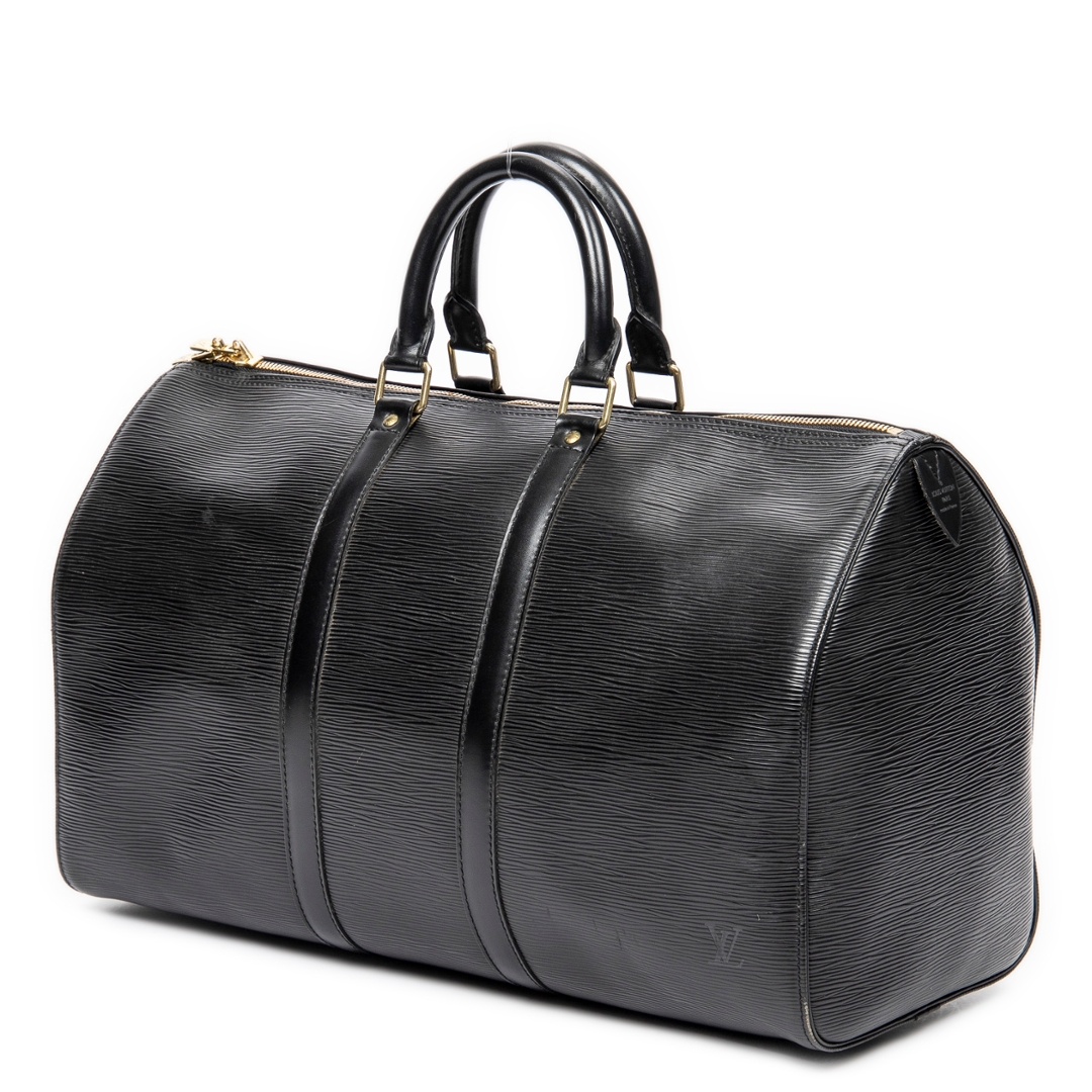 A vintage Louis Vuitton black calf leather Keepall bag with a certificate of authenticity. Approximately 28cm height, 48cm width.
