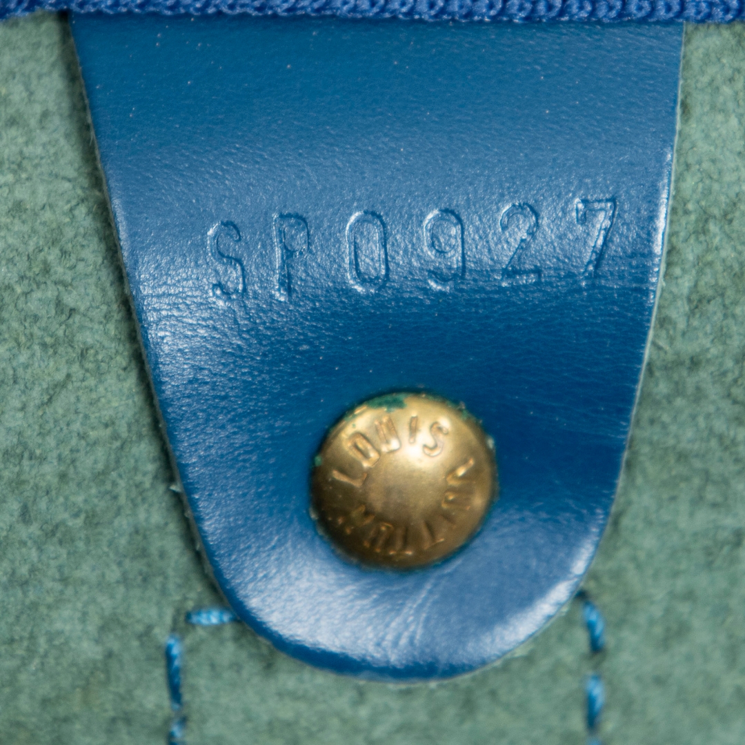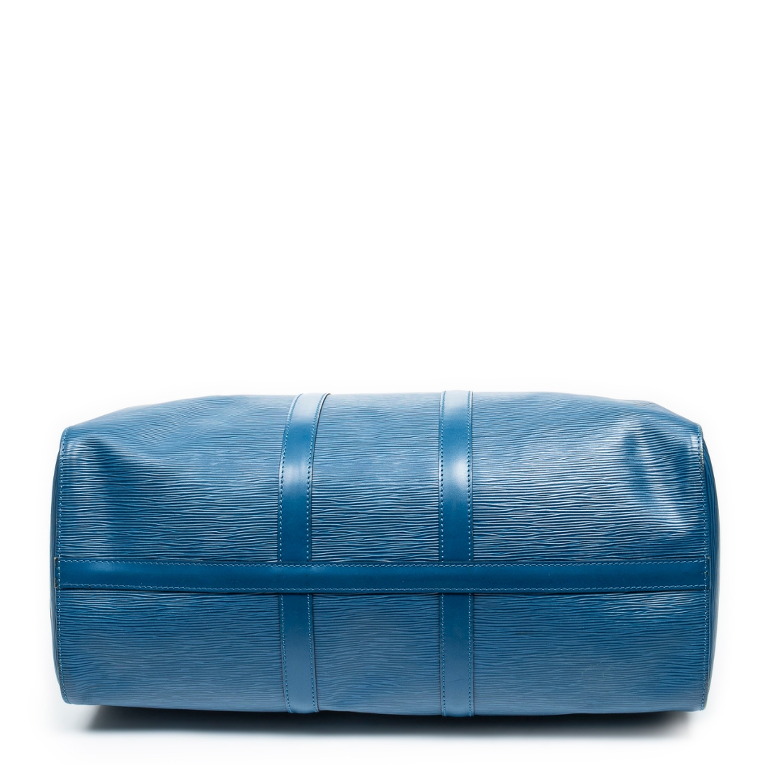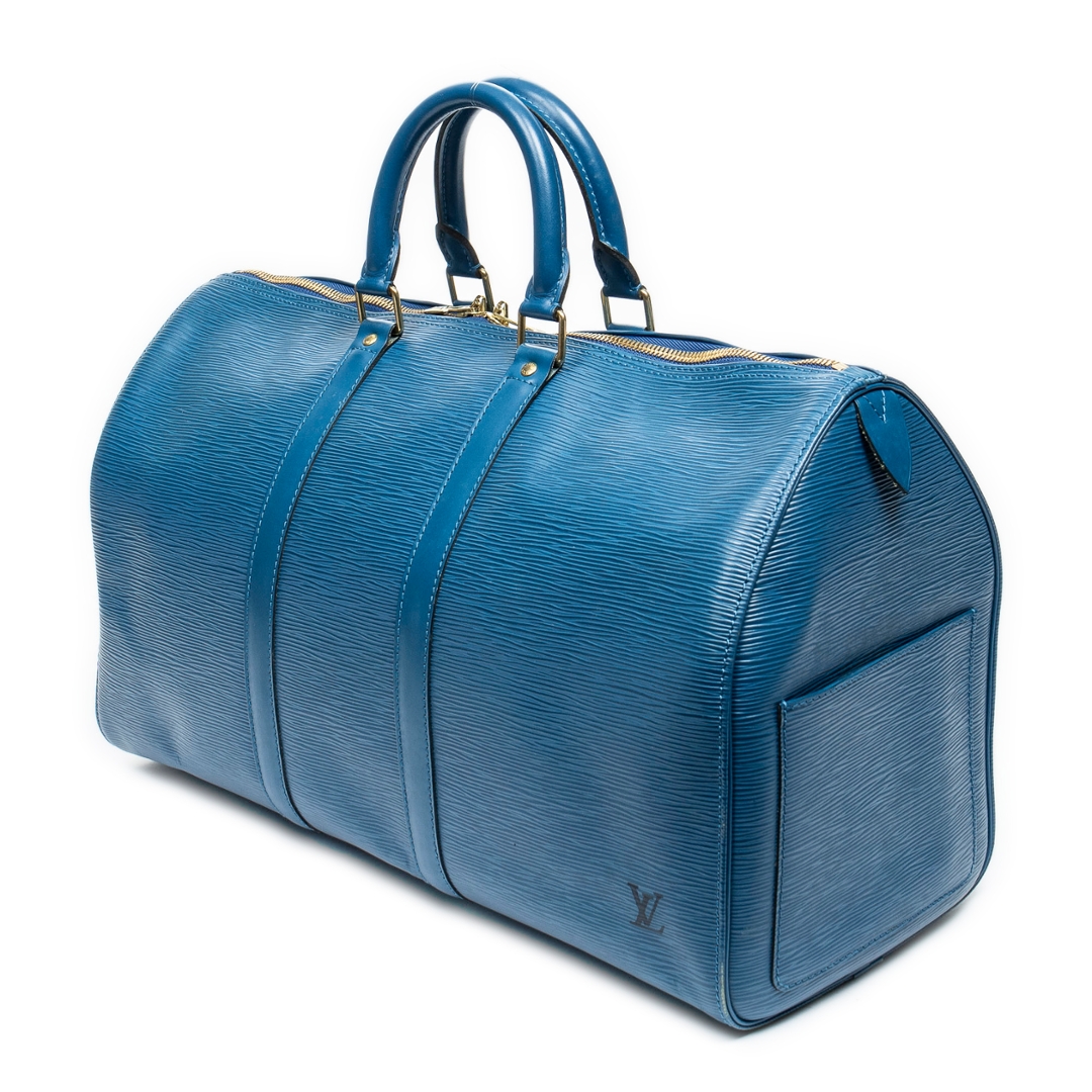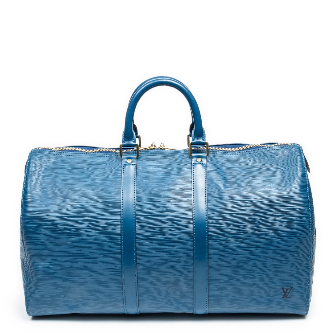 A vintage Louis Vuitton blue calf leather Keepall bag with a certificate of authenticity. Approximately 28cm height, 48cm width.