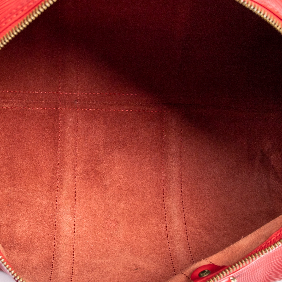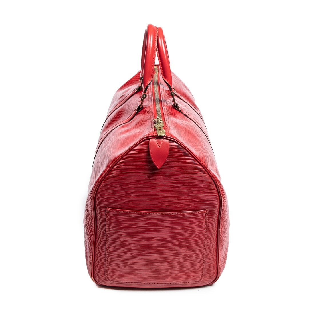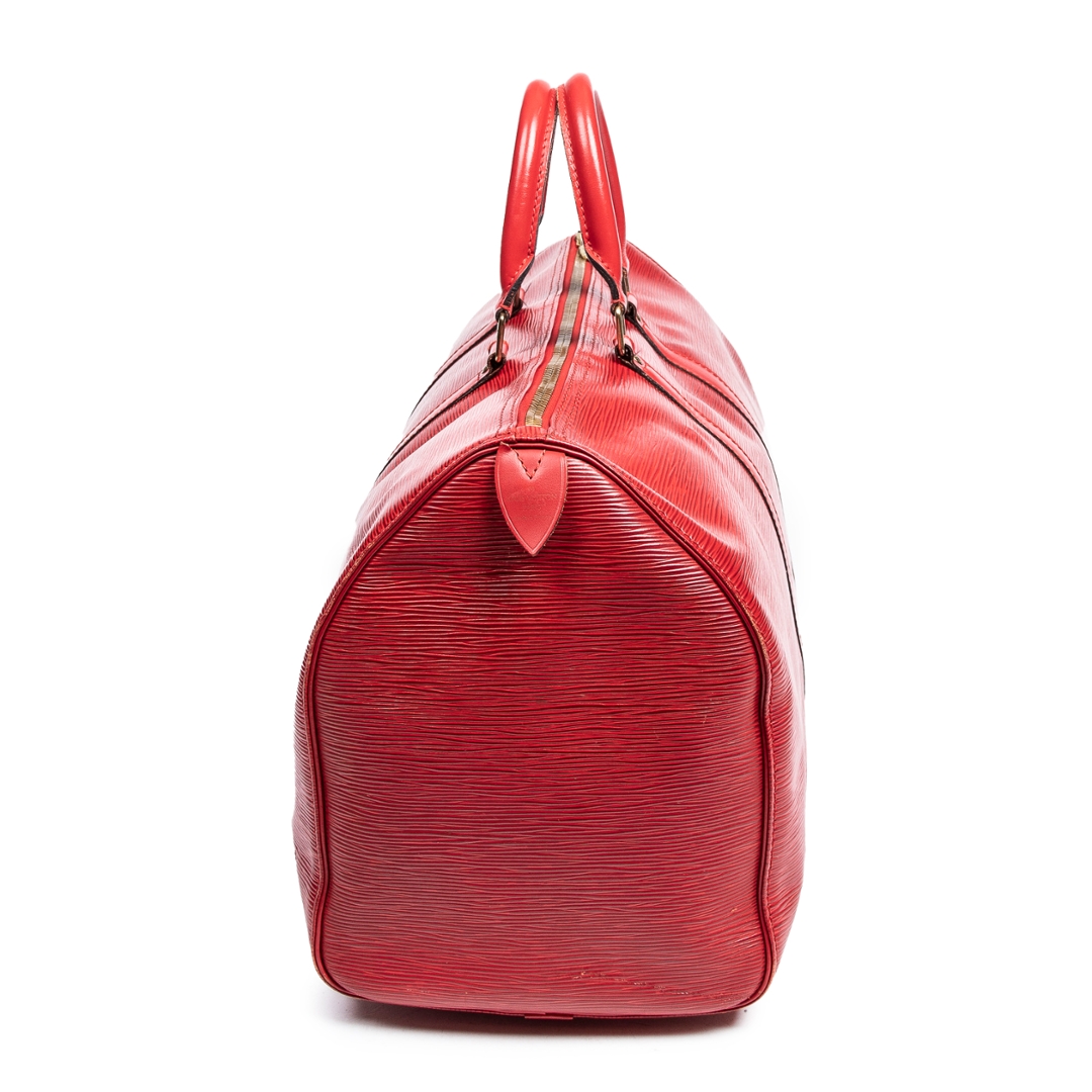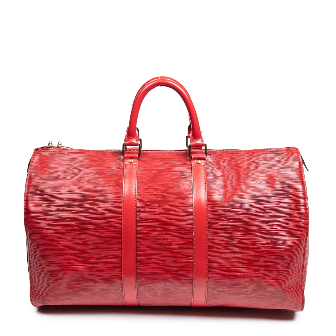 A vintage Louis Vuitton red calf leather Keepall bag, offering a bold and refined interpretation of one of the brand’s most iconic travel designs. Crafted from textured calf leather, the rich red finish is complemented by matching leather trims, structured rolled handles, and subtle LV detailing, creating a striking yet timeless aesthetic.