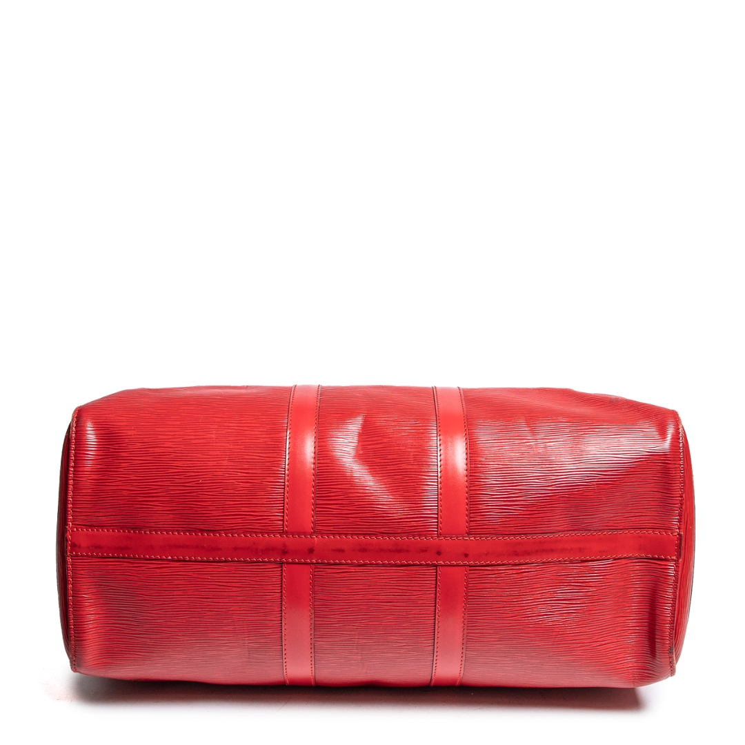 A vintage Louis Vuitton red calf leather Keepall bag with a certificate of authenticity. Approximately 28cm height, 48cm width.