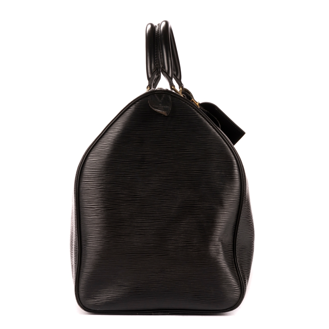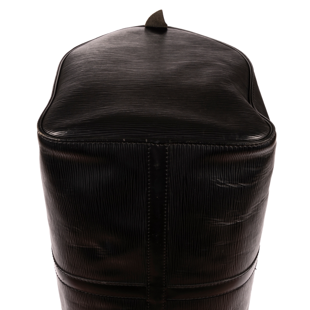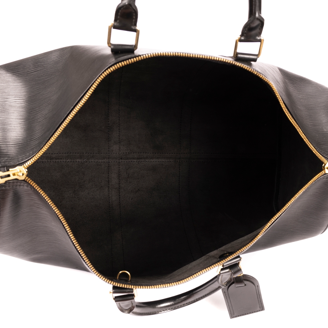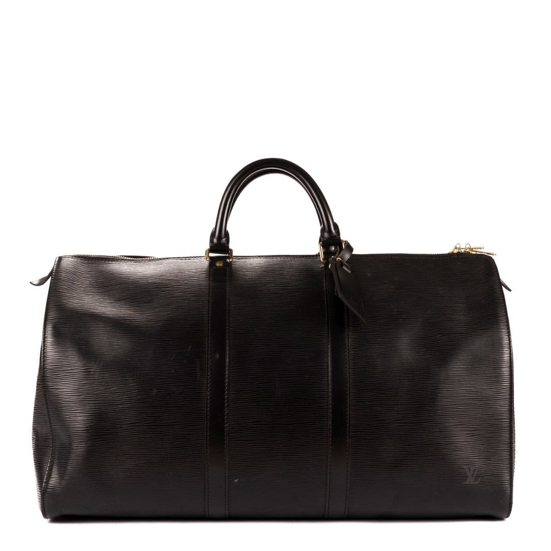 A vintage Louis Vuitton black calf leather Keepall bag with a certificate of authenticity. Approximately 29cm height, 52cm width.
