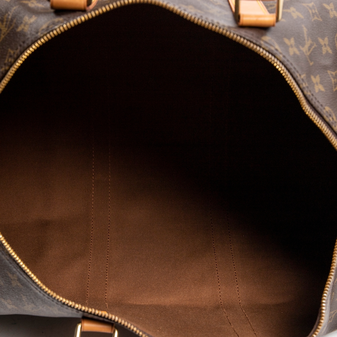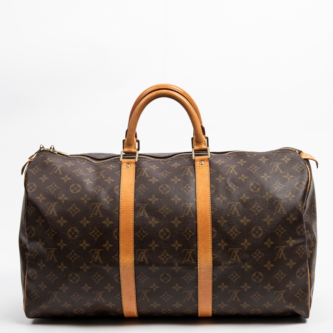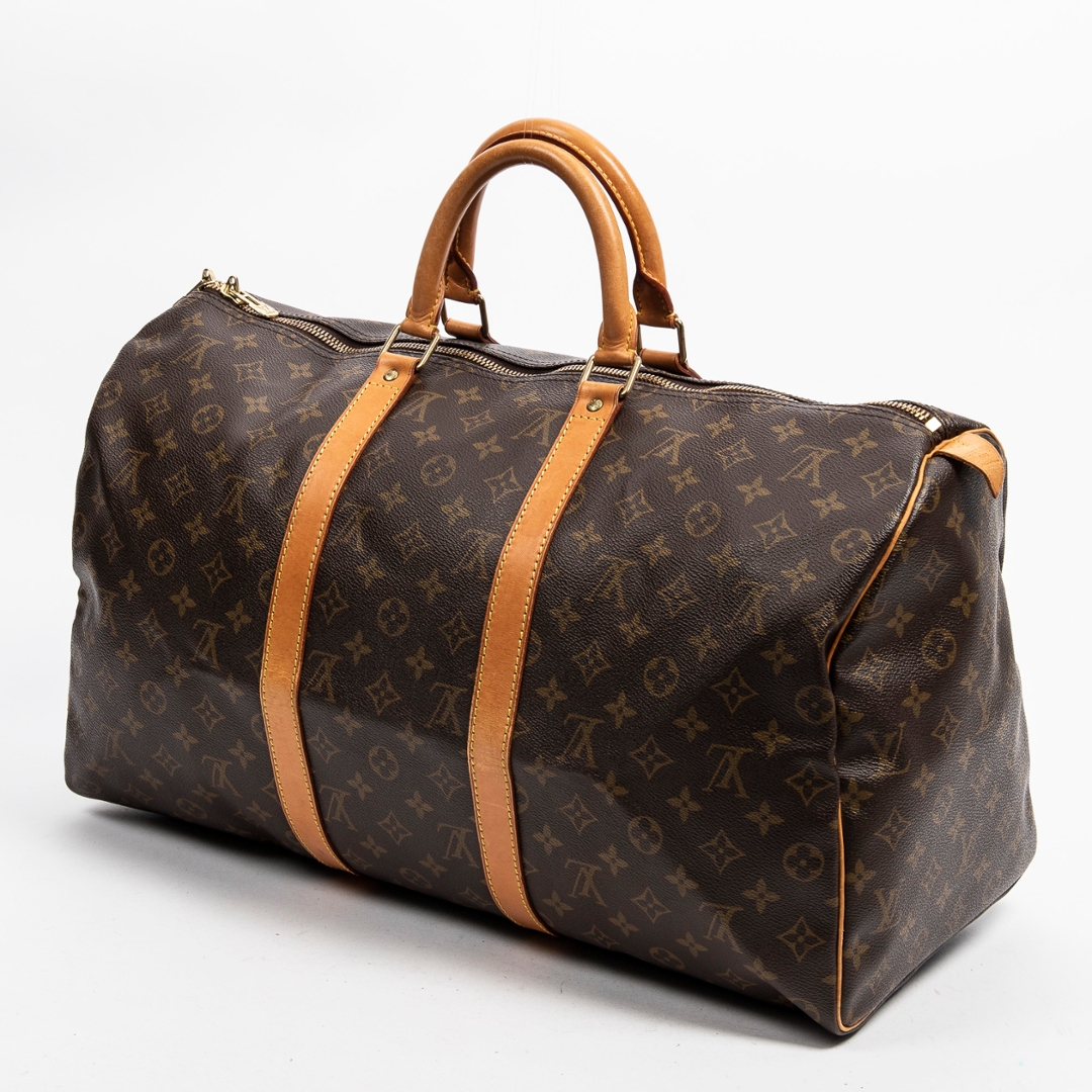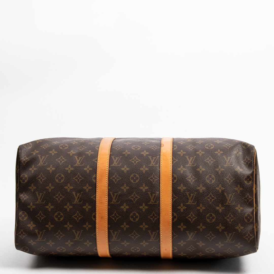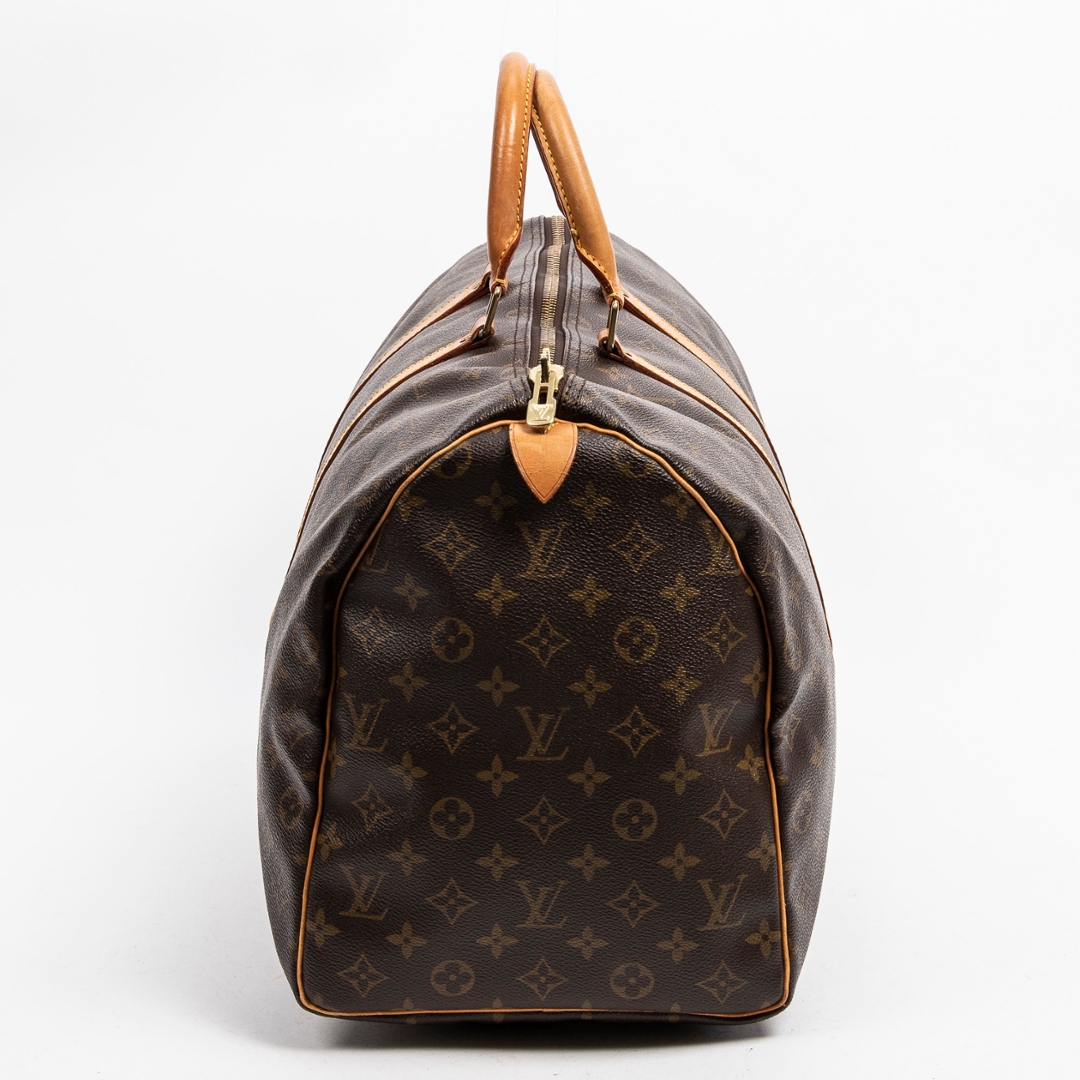 A vintage Louis Vuitton monogram coated canvas Keepall bag, showcasing one of the most recognisable and enduring travel designs in luxury fashion. Crafted from the iconic monogram canvas, it is complemented by natural leather trims, structured rolled handles, and signature gold-tone hardware, delivering a timeless and instantly recognisable aesthetic.