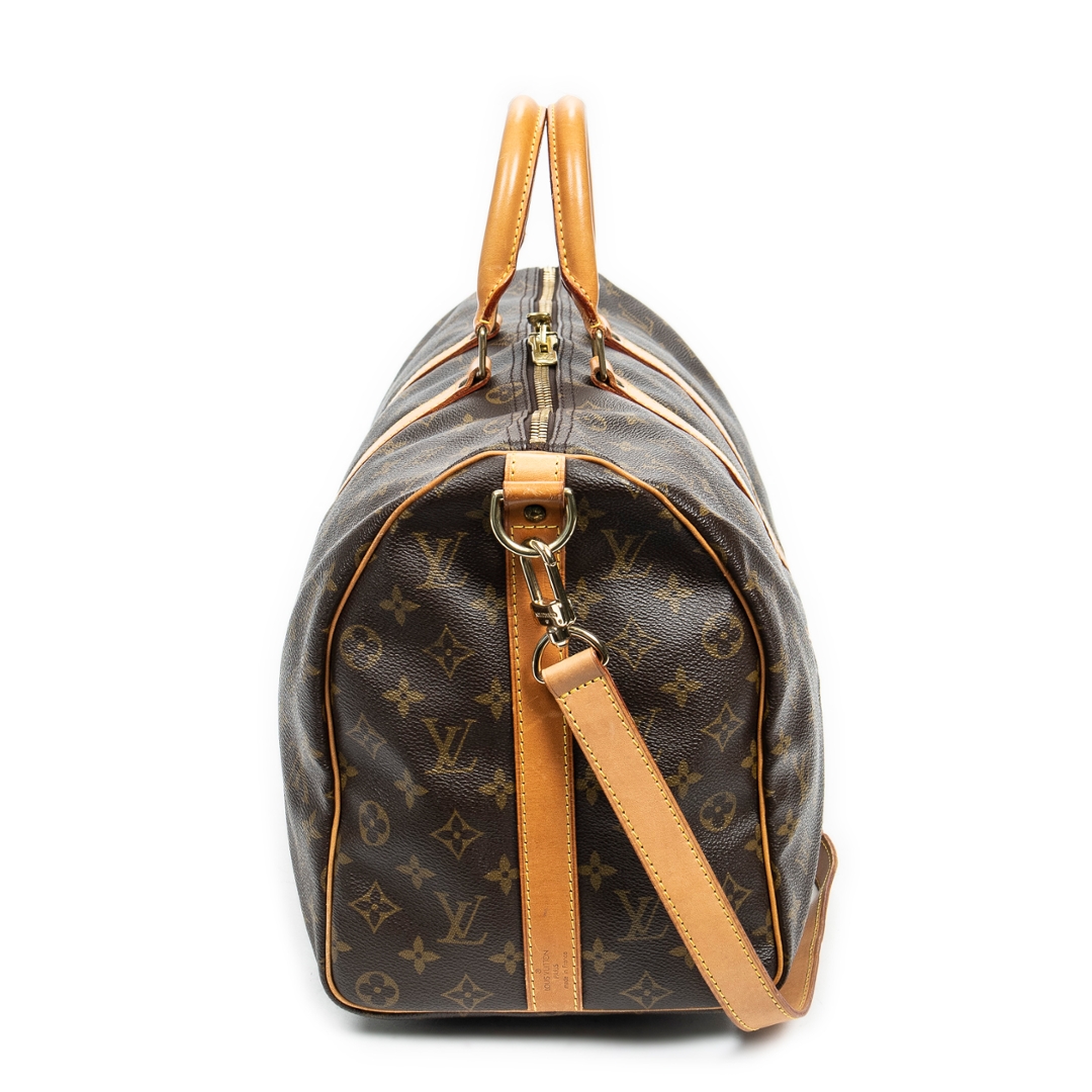 A vintage Louis Vuitton Keepall Bandoulière bag crafted in the iconic brown Monogram coated canvas, representing one of the house’s most celebrated travel designs. The classic silhouette is enhanced by natural leather trim, rolled top handles, and the addition of a detachable shoulder strap, offering both timeless style and versatile functionality.
