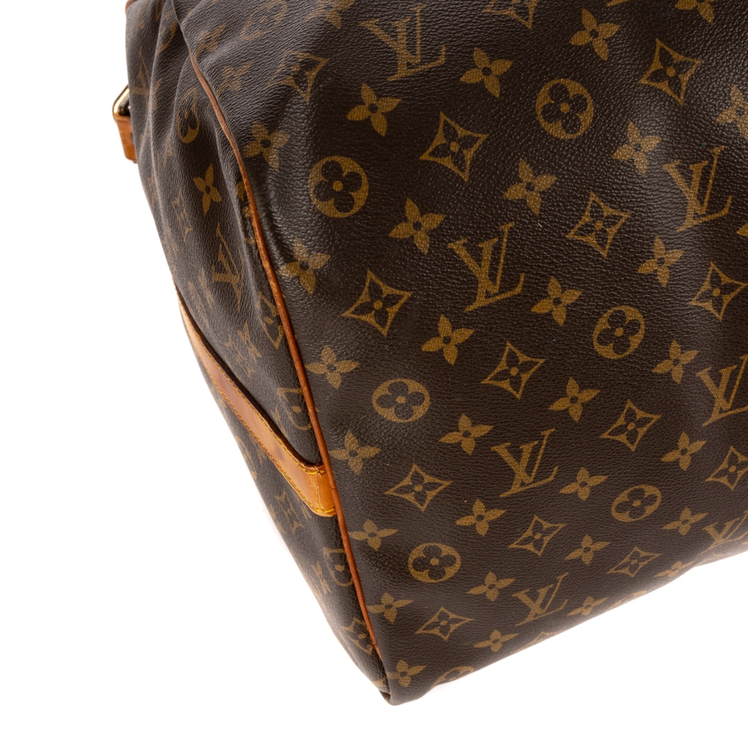 A vintage Louis Vuitton Keepall Bandoulière is a true symbol of timeless travel luxury. Crafted in Louis Vuitton’s iconic monogram coated canvas, it showcases the instantly recognizable LV pattern complemented by natural cowhide leather trim and handles that have aged beautifully. The addition of a detachable shoulder strap enhances its versatility, making it a perfect travel companion for both style and convenience.