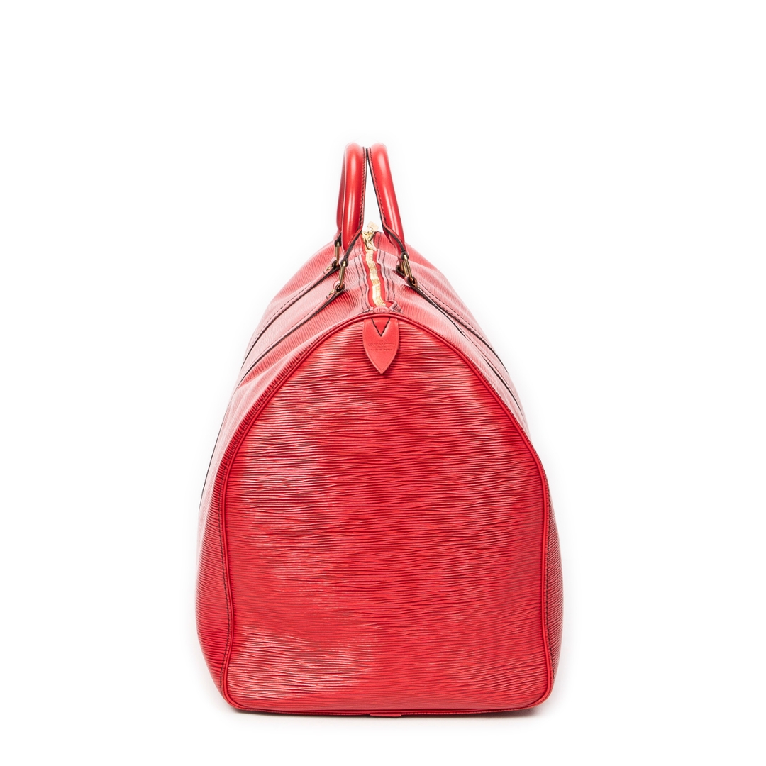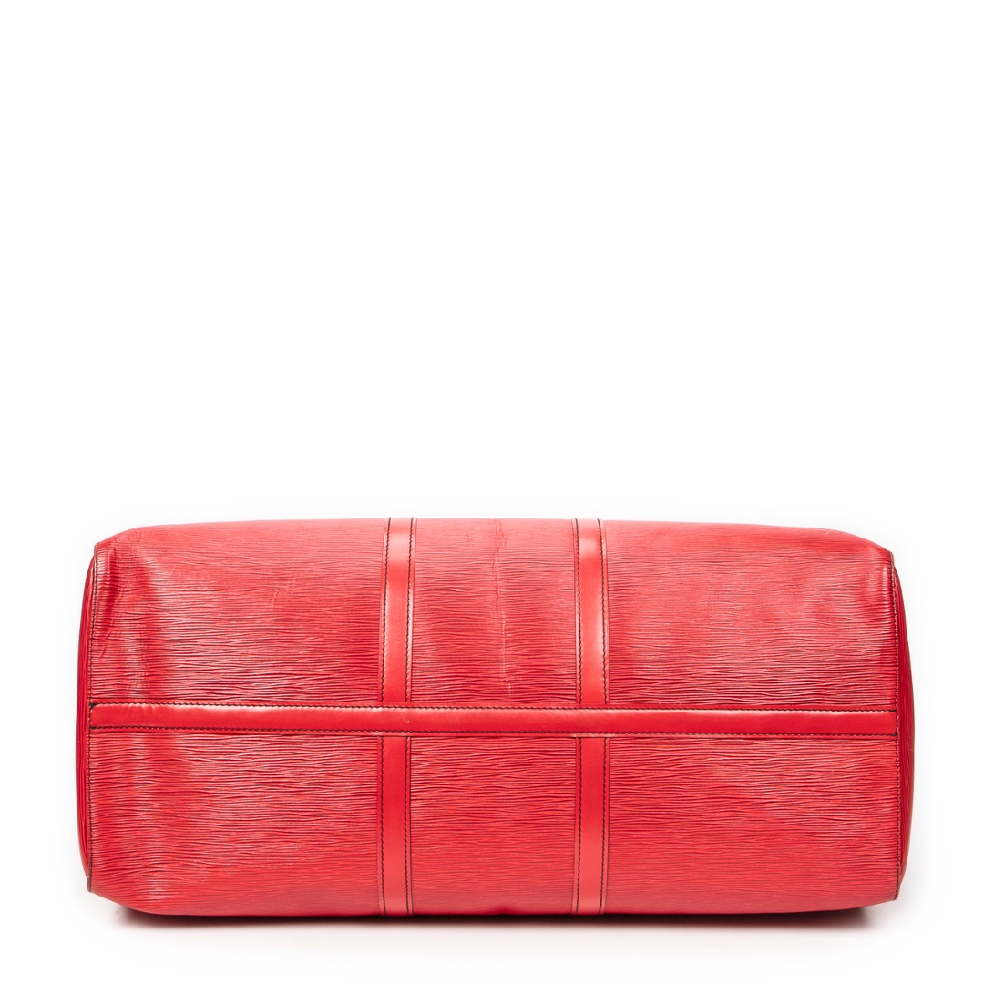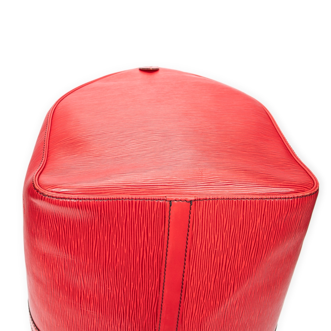 A vintage Louis Vuitton Keepall bag crafted in striking red calf leather, featuring the house’s signature textured finish and distinctive black contrast stitching. This bold interpretation of the classic travel silhouette is complemented by matching rolled handles and gold-tone hardware, delivering a statement piece that blends heritage design with a contemporary edge.