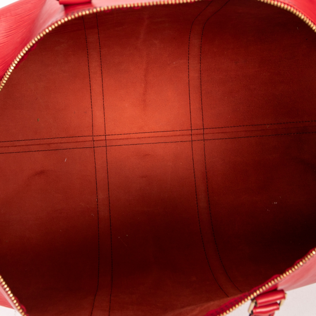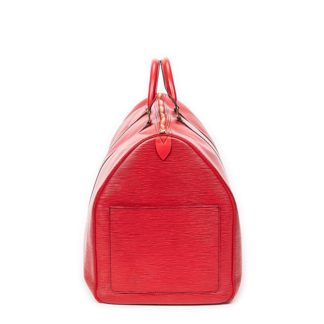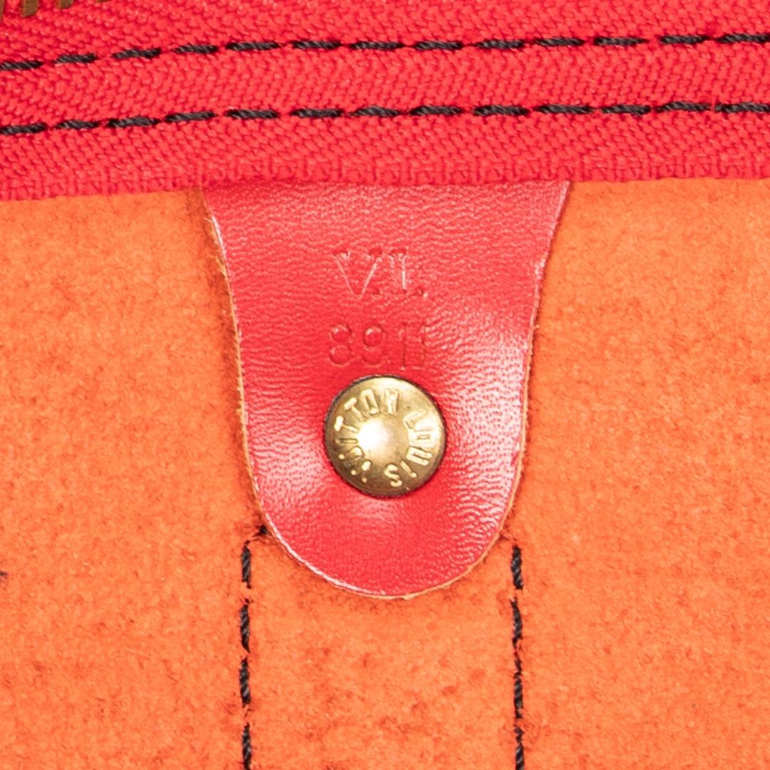 A vintage Louis Vuitton Keepall bag crafted in striking red calf leather, featuring the house’s signature textured finish and distinctive black contrast stitching. This bold interpretation of the classic travel silhouette is complemented by matching rolled handles and gold-tone hardware, delivering a statement piece that blends heritage design with a contemporary edge.