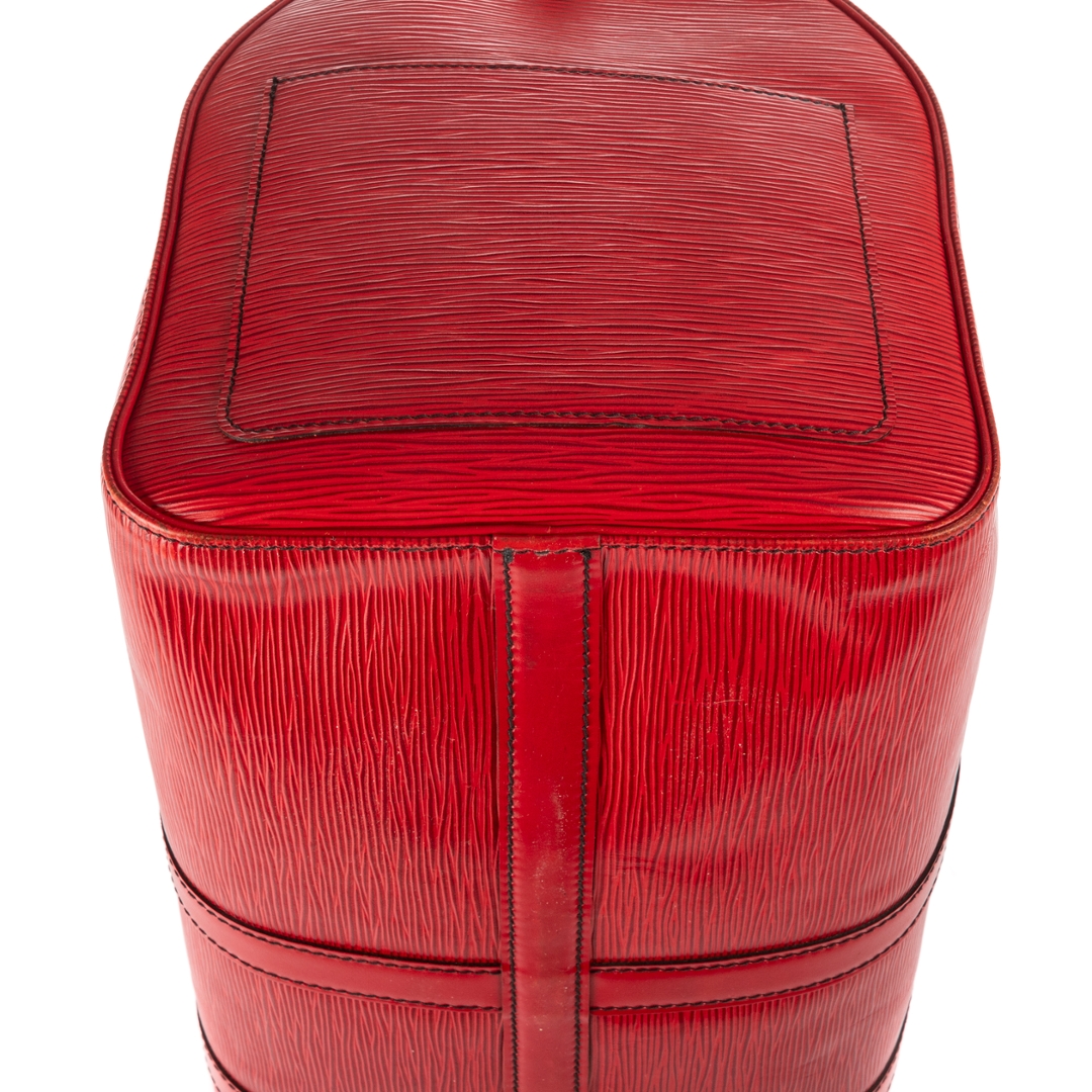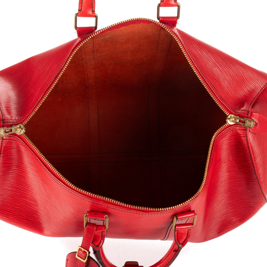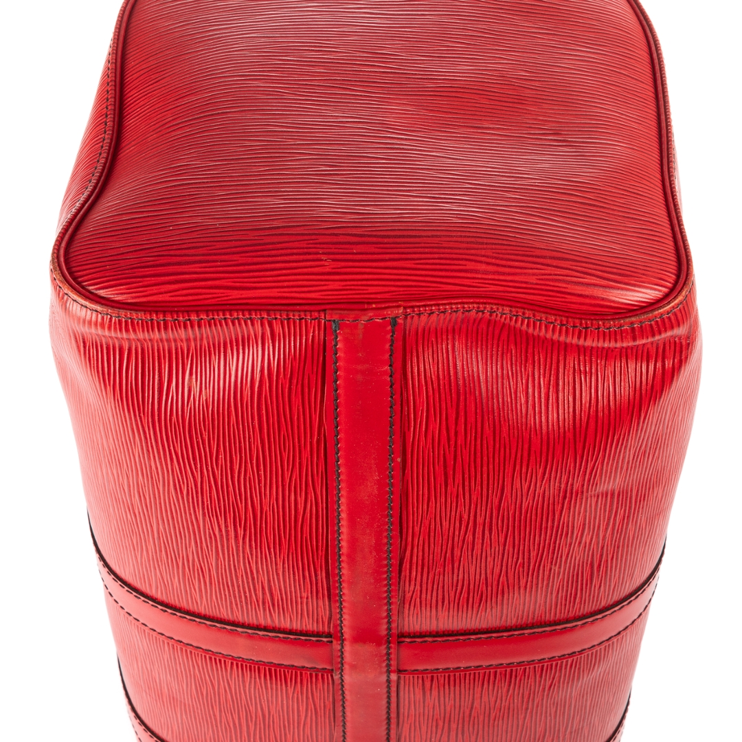 A vintage Louis Vuitton red calf leather Keepall Black Stitchings bag with a certificate of authenticity. Approximately 28cm height, 46cm width.