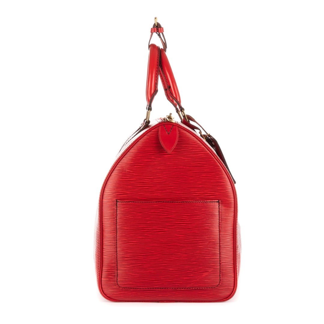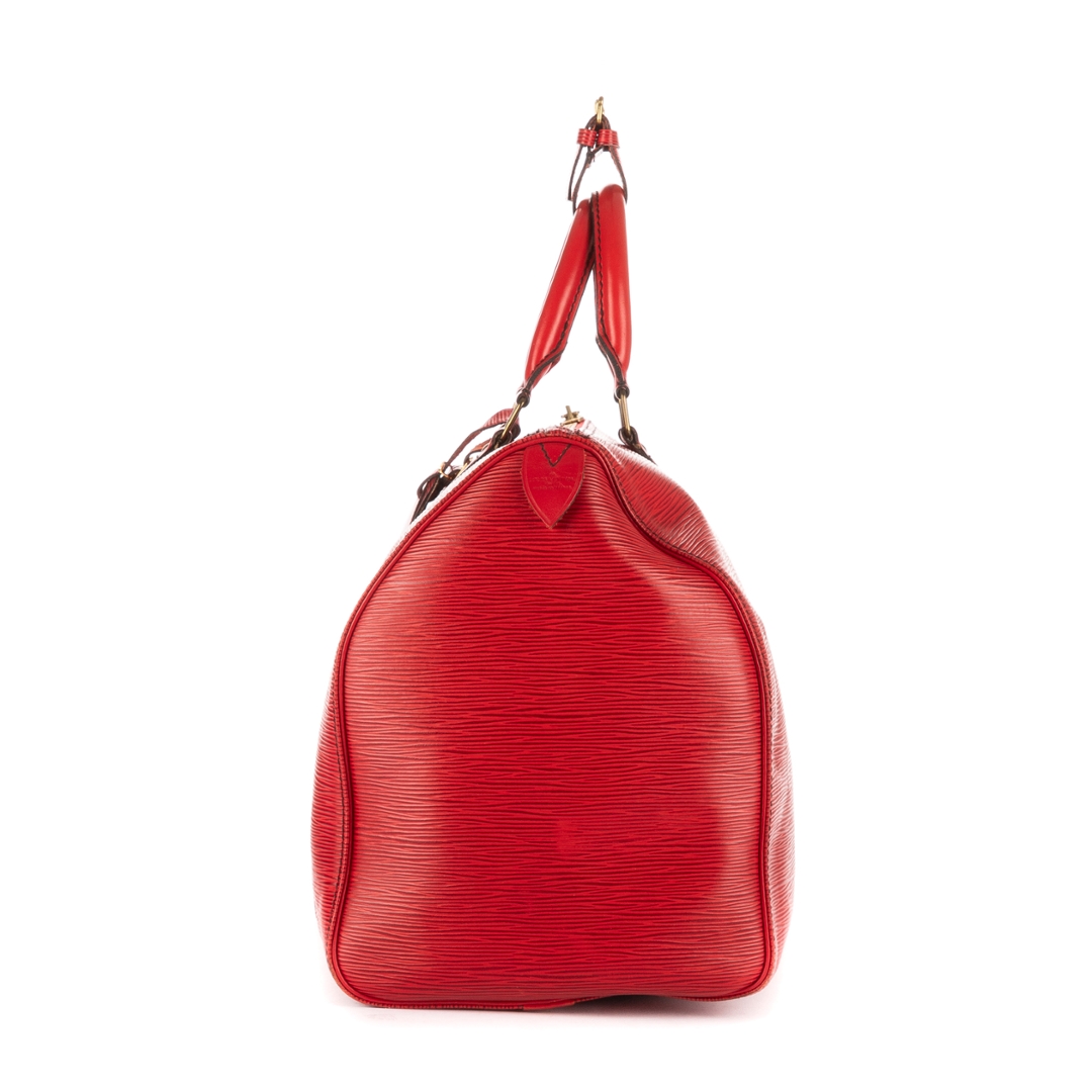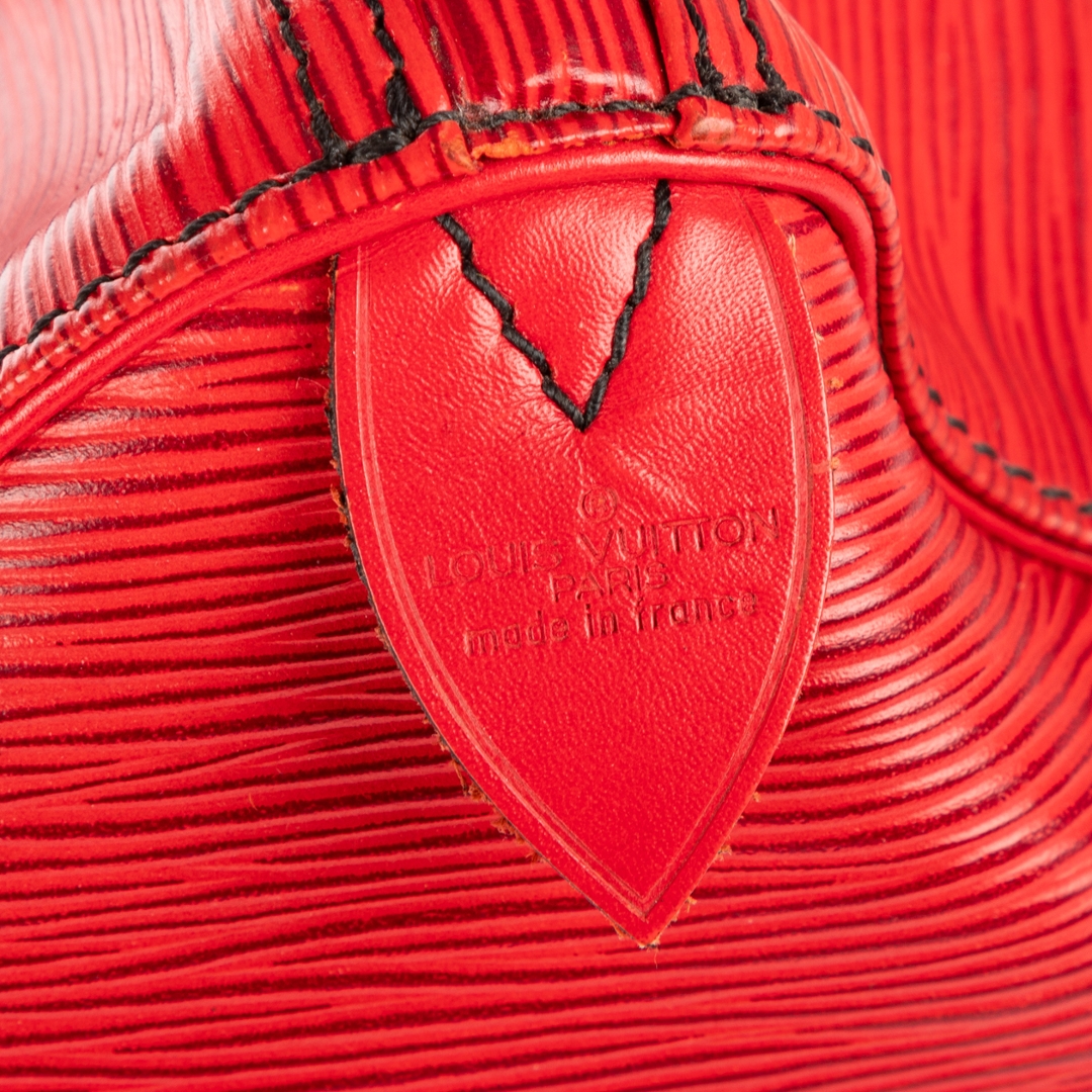 A vintage Louis Vuitton red calf leather Keepall Black Stitchings bag with a certificate of authenticity. Approximately 28cm height, 46cm width.