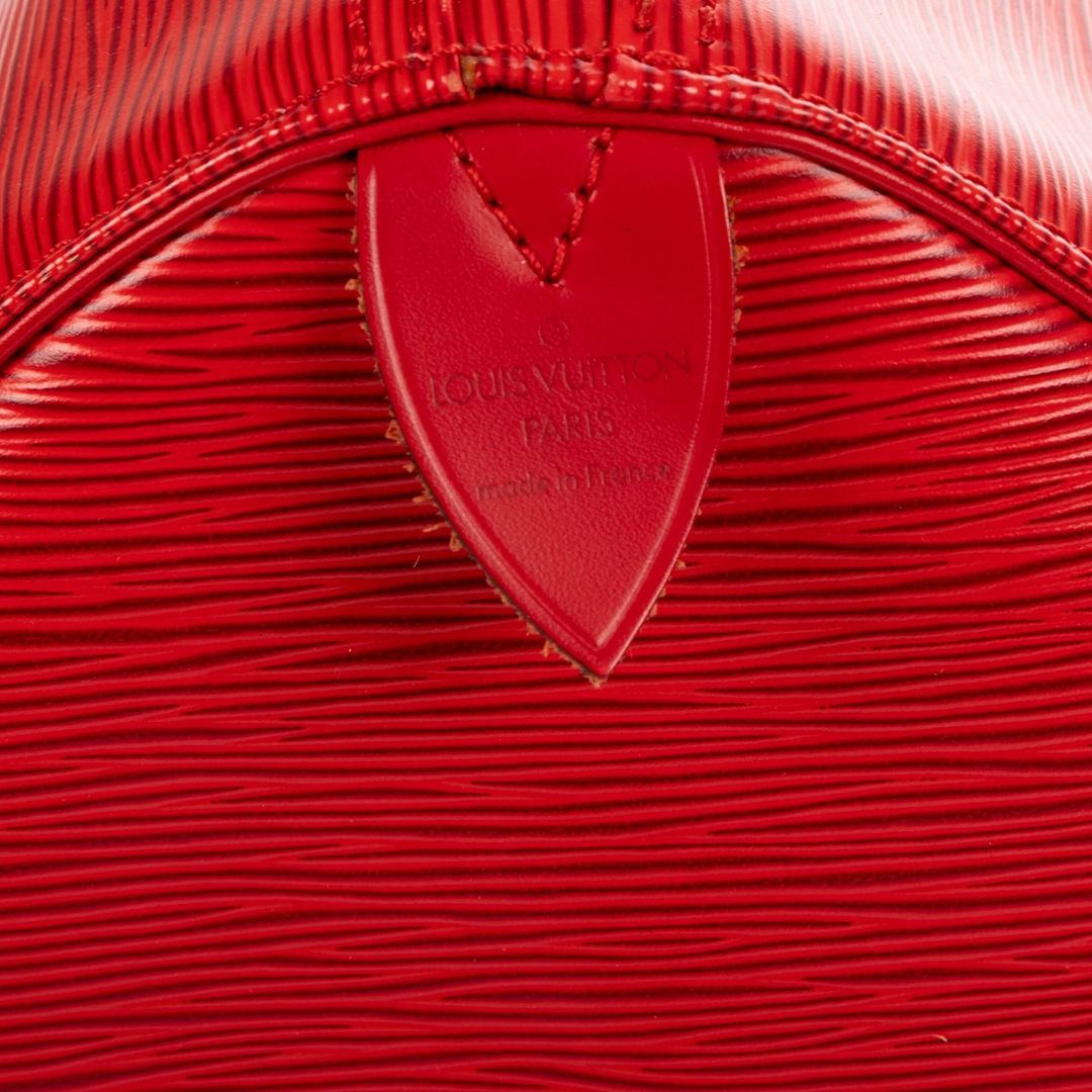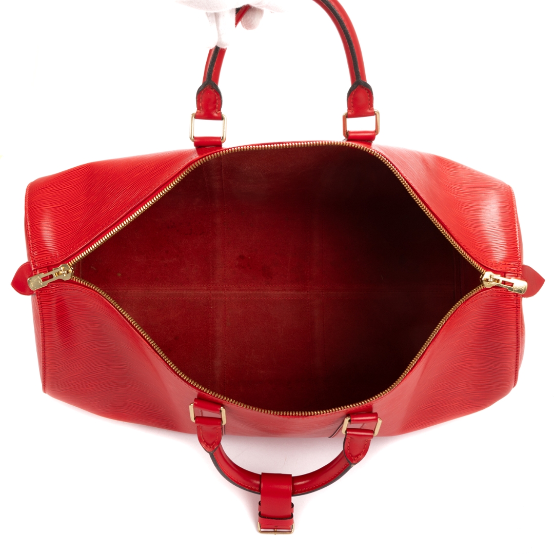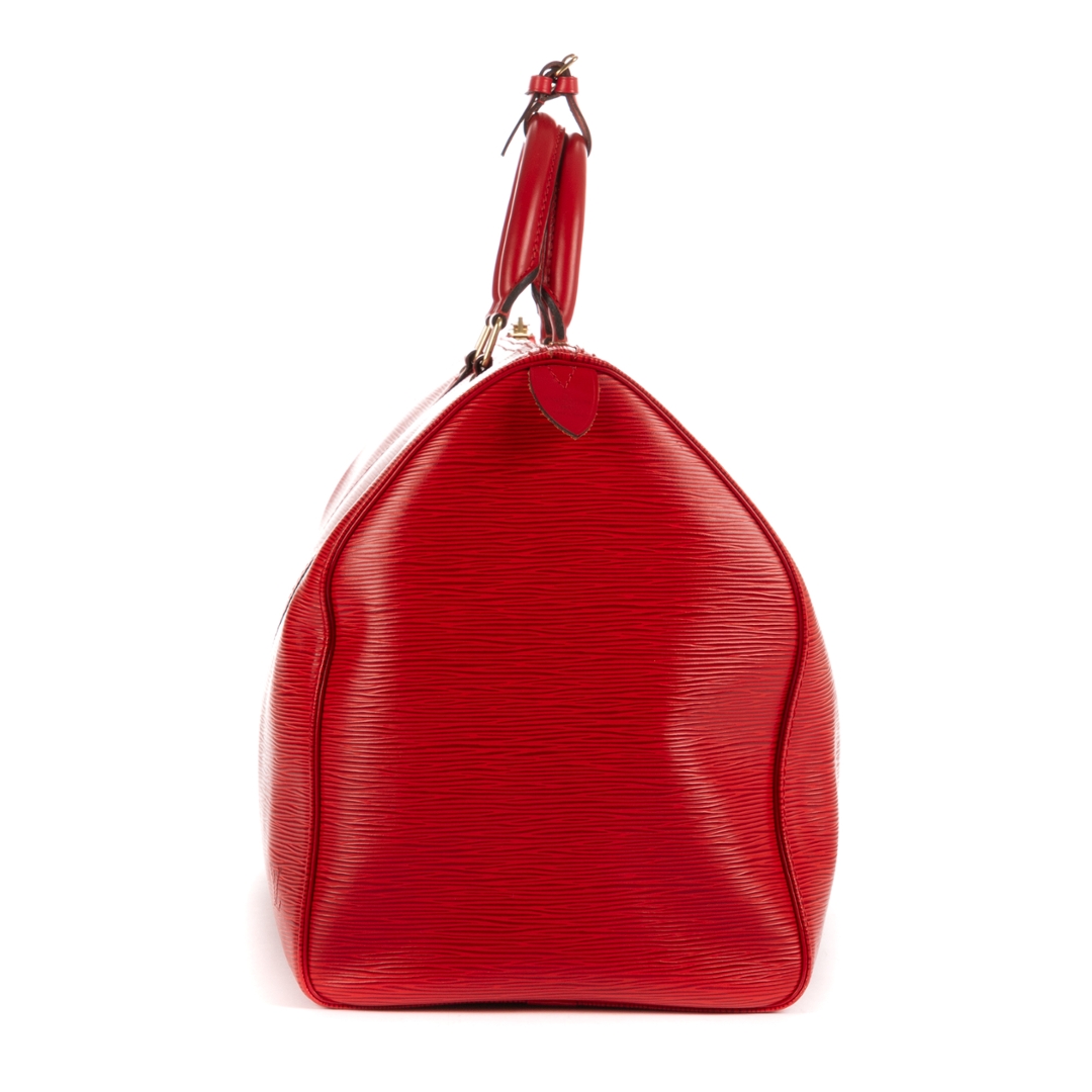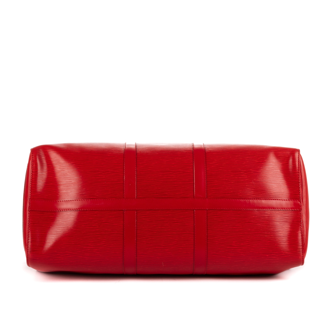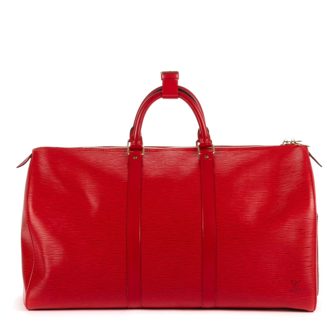 A vintage Louis Vuitton red calf leather Keepall bag with a certificate of authenticity, Approximately 29cm height, 50cm width.