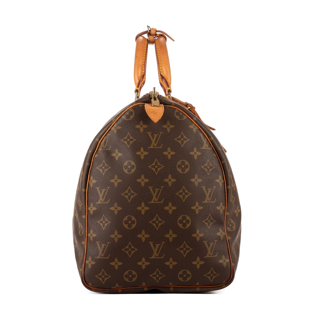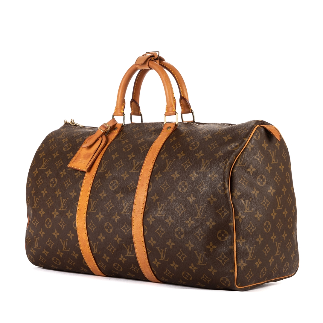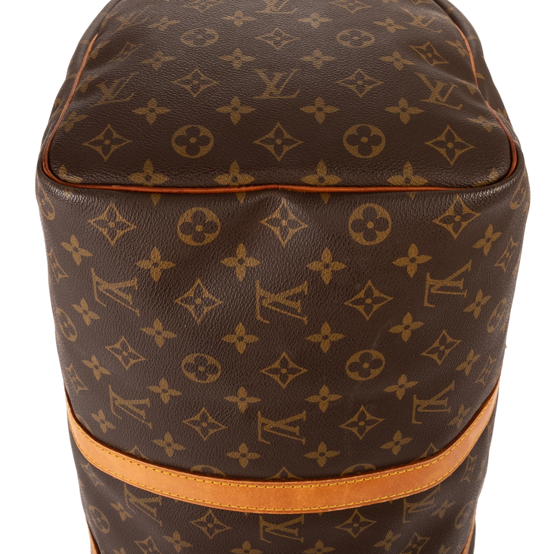 A vintage Louis Vuitton monogram coated canvas Keepall bag with a certificate of authenticity. Approximately 26cm height, 50cm width.