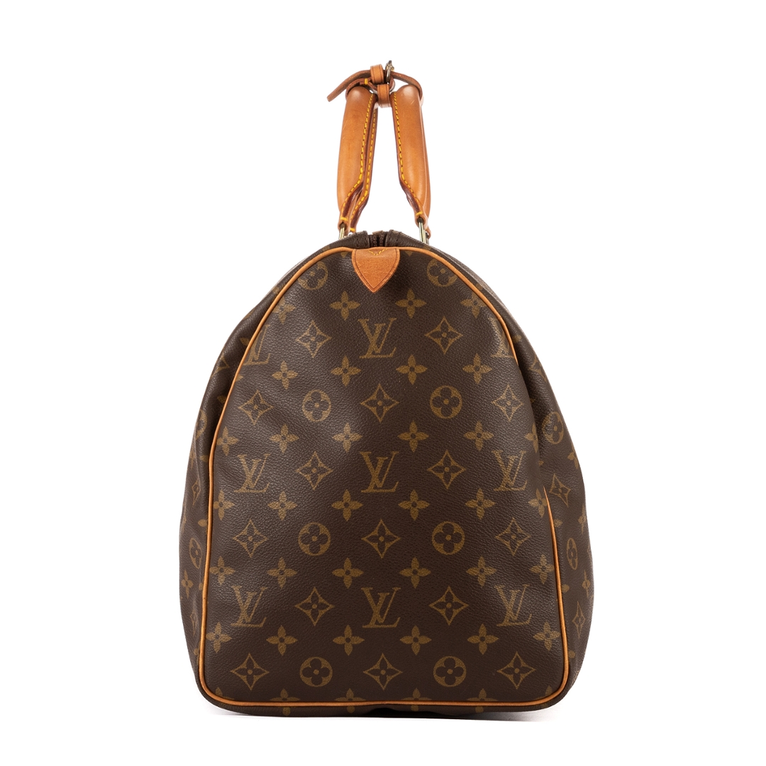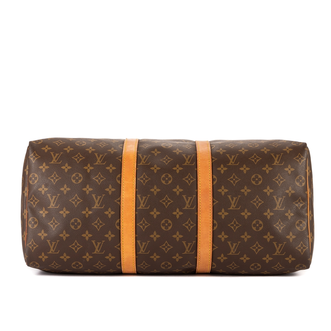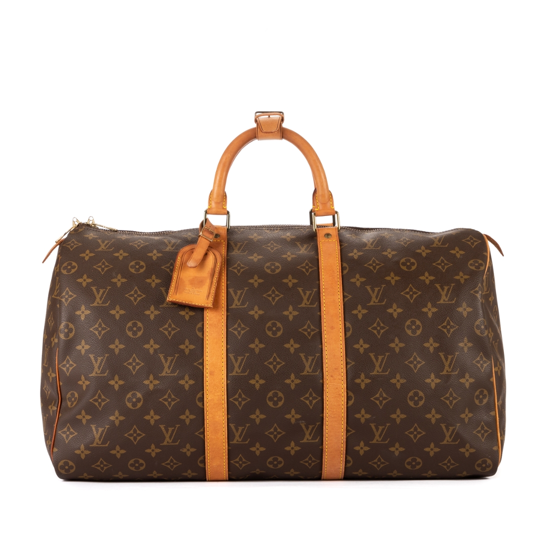 A vintage Louis Vuitton monogram coated canvas Keepall bag with a certificate of authenticity. Approximately 26cm height, 50cm width.
