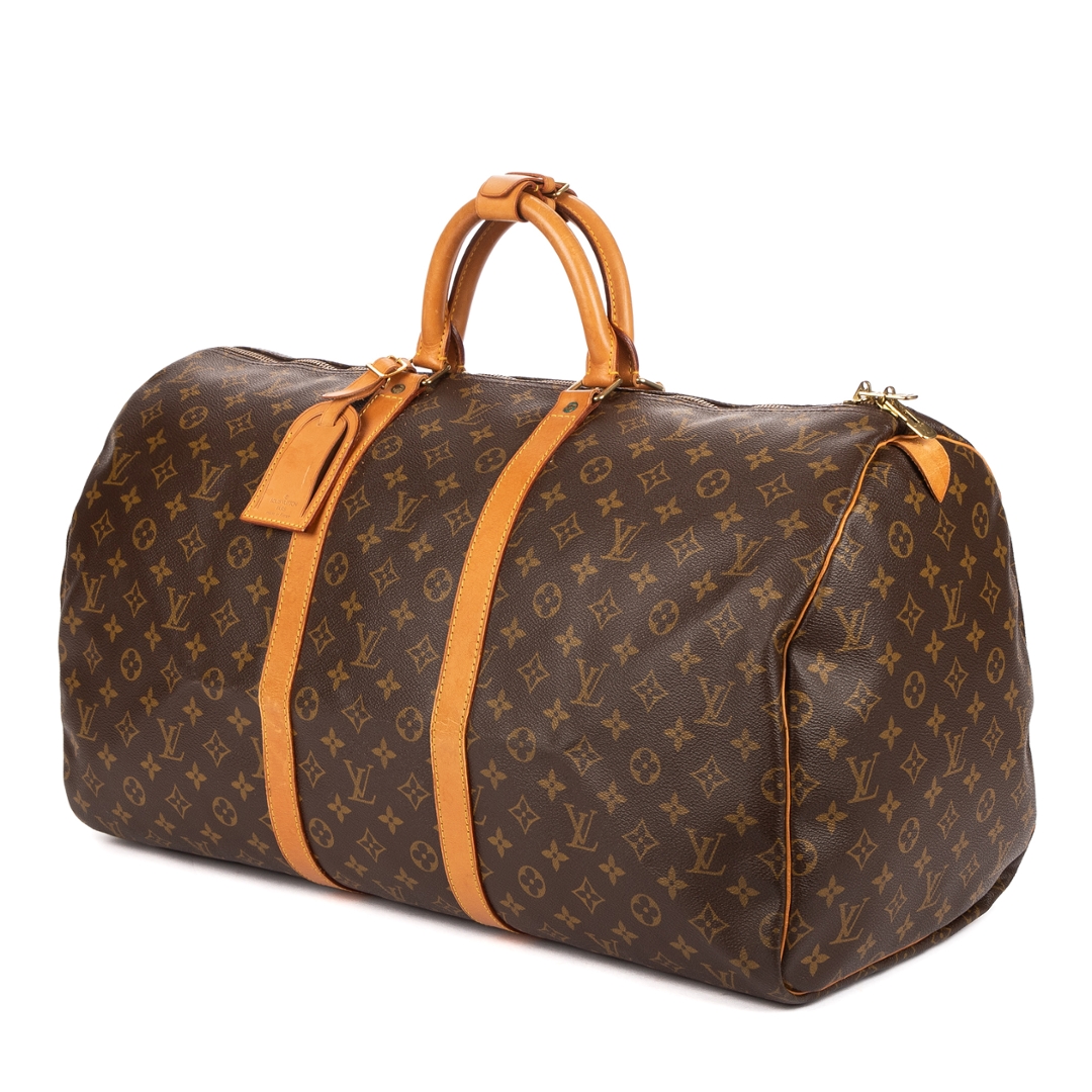 A vintage Louis Vuitton monogram coated canvas Keepall bag with a certificate of authenticity. Approximately 28cm height, 55cm width.
