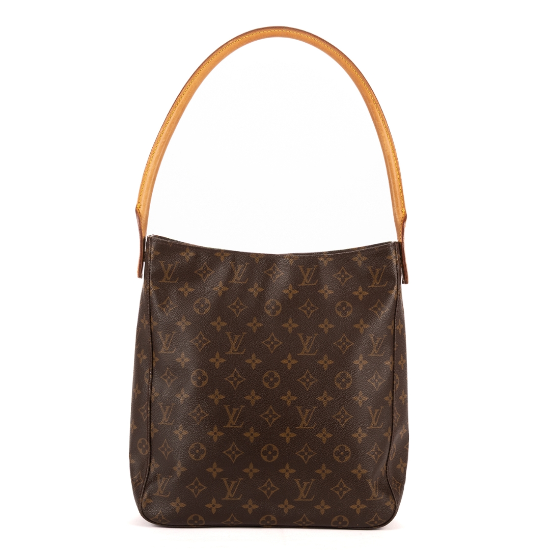 A vintage Louis Vuitton Looping bag crafted in the house’s iconic monogram coated canvas, defined by its clean, minimalist silhouette and signature curved shoulder strap. The structured rectangular body is complemented by natural leather trim, creating a timeless everyday piece that reflects Louis Vuitton’s enduring design heritage.