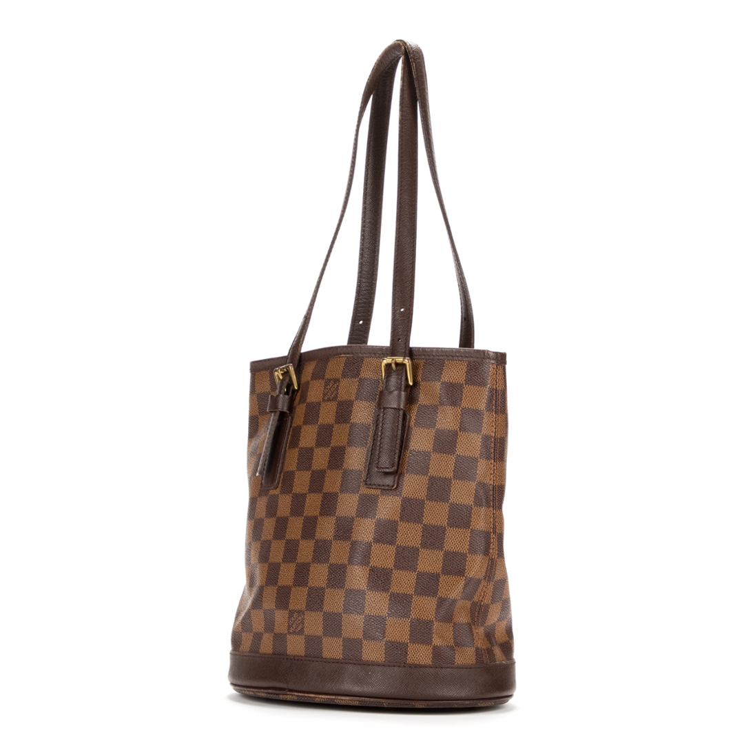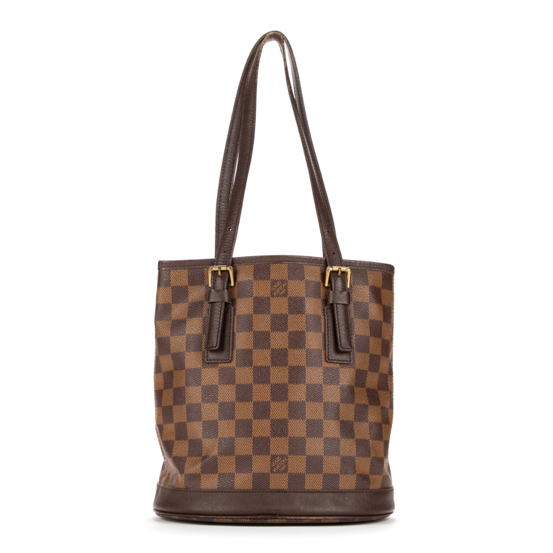 A vintage Louis Vuitton Marais bag crafted in the iconic brown Damier Ebene coated canvas, presenting a structured bucket-style silhouette that reflects the brand’s timeless and practical design ethos. The piece is finished with smooth leather trim, adjustable shoulder straps with buckle detailing, and subtle gold-tone hardware, offering a refined and versatile everyday bag.