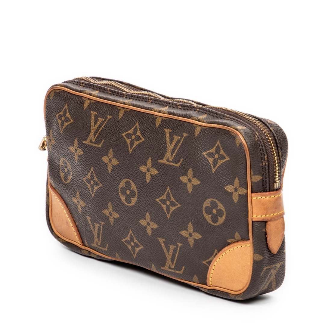 A vintage Louis Vuitton Marly Dragonne bag crafted in the iconic brown Monogram coated canvas, offering a sleek and compact design rooted in the brand’s timeless aesthetic. The piece is enhanced by natural leather trim and subtle detailing, delivering a refined accessory that perfectly reflects Louis Vuitton’s heritage craftsmanship.