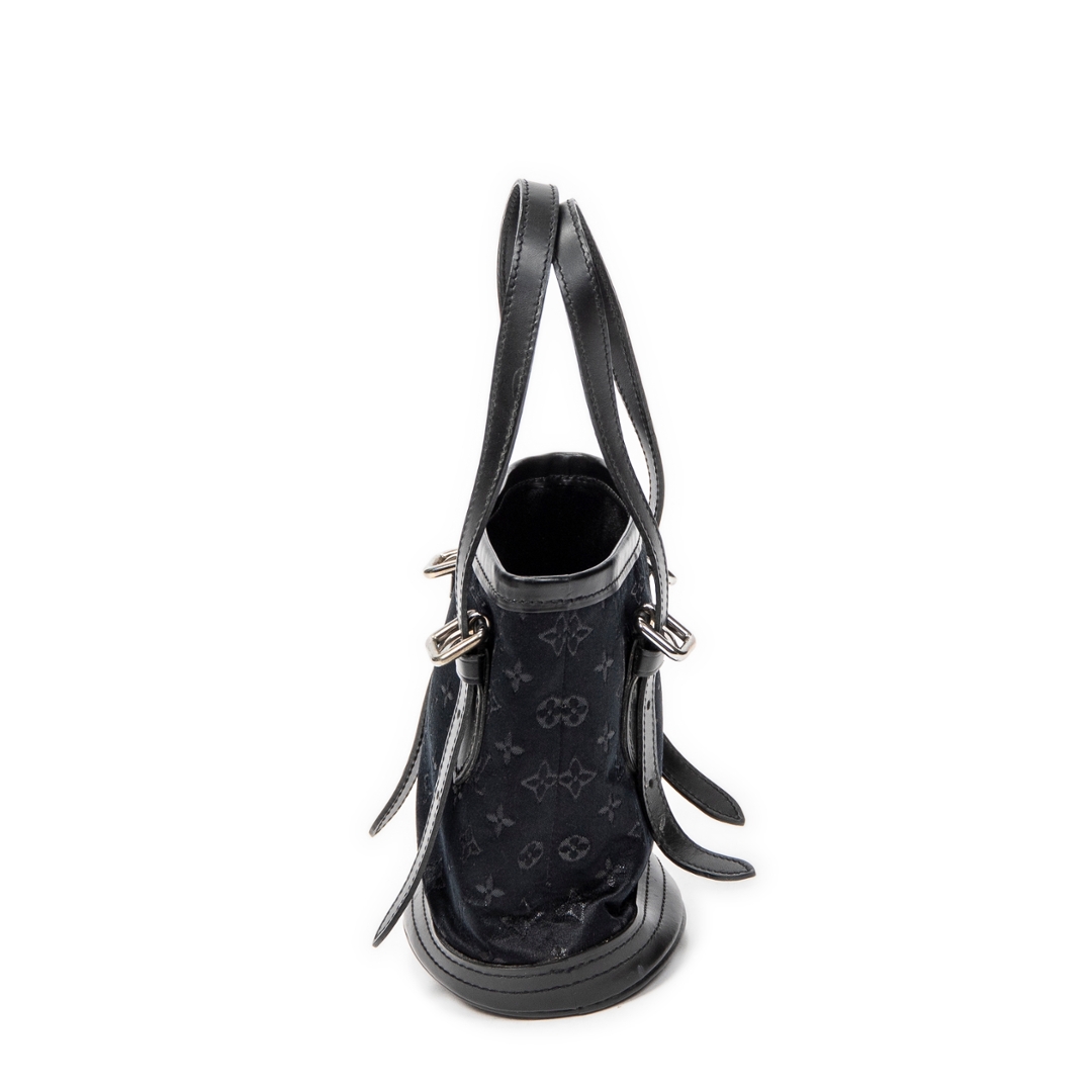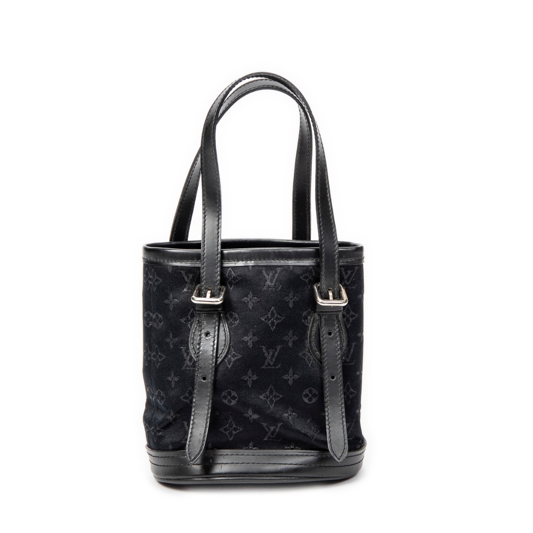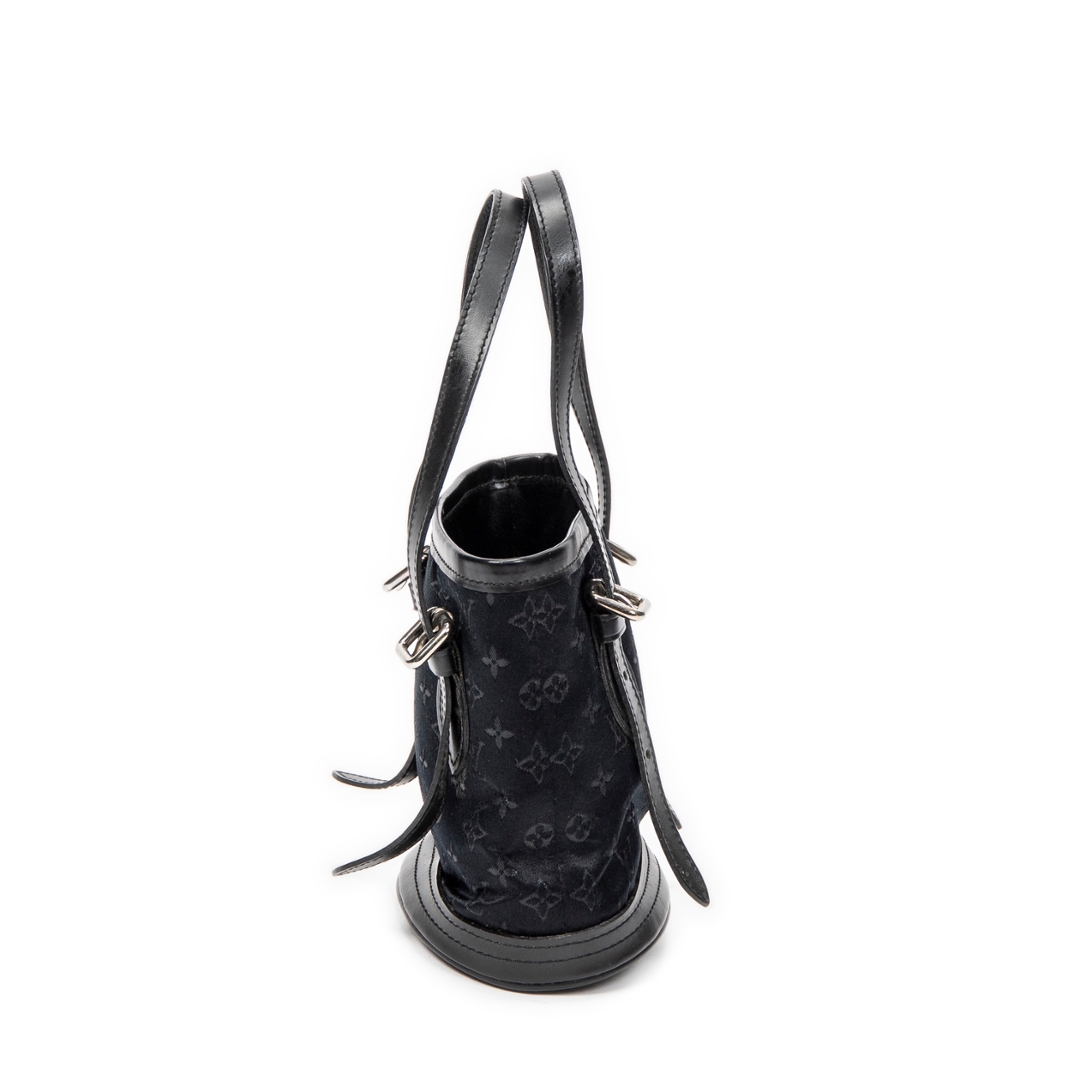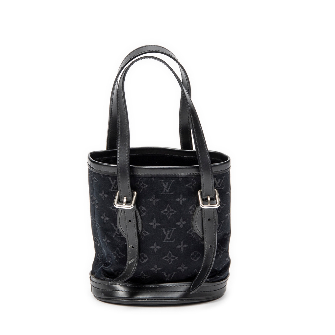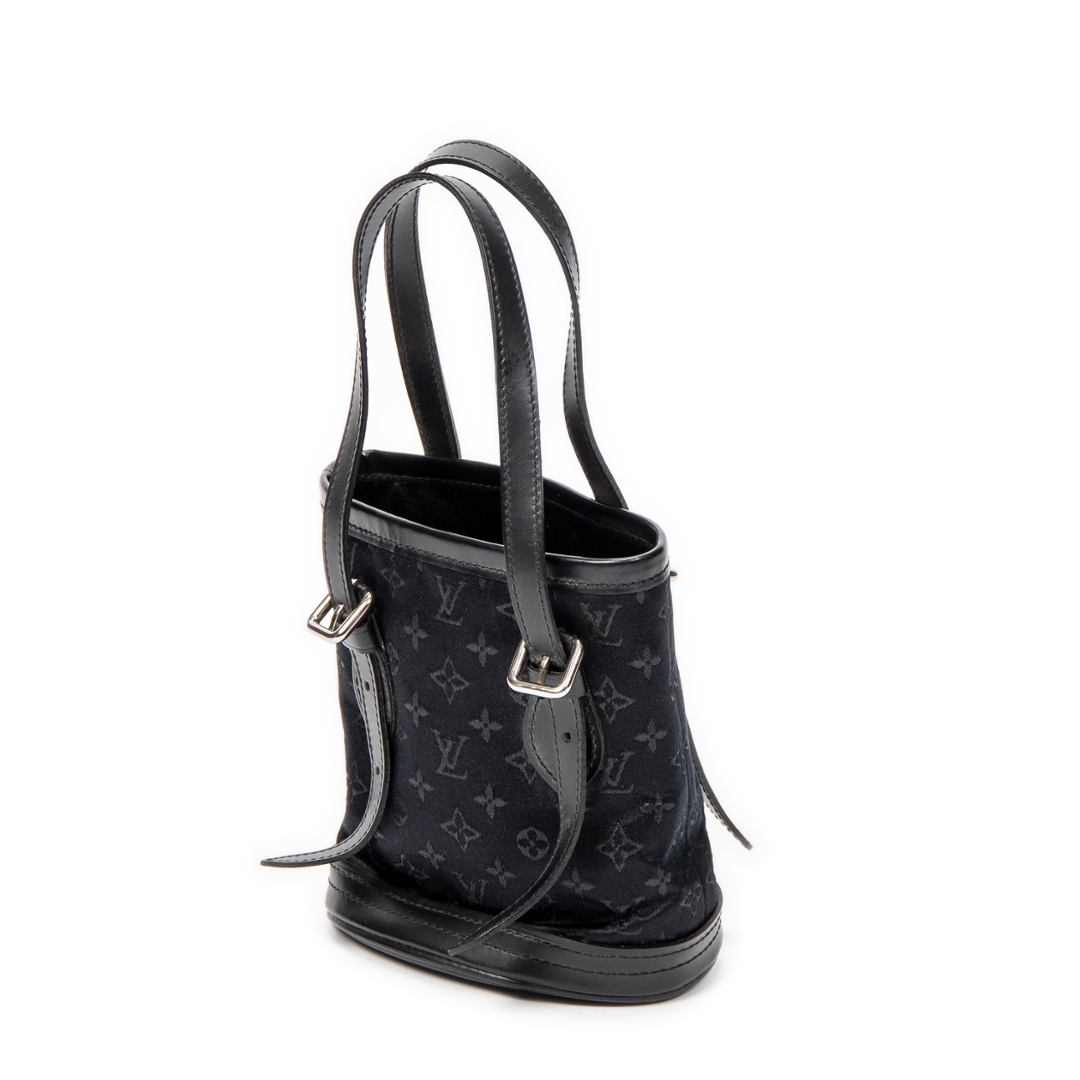 A vintage Louis Vuitton black canvas Micro Mini Bucket bag with a certificate of authenticity. Approximately 14cm height, 12cm width.