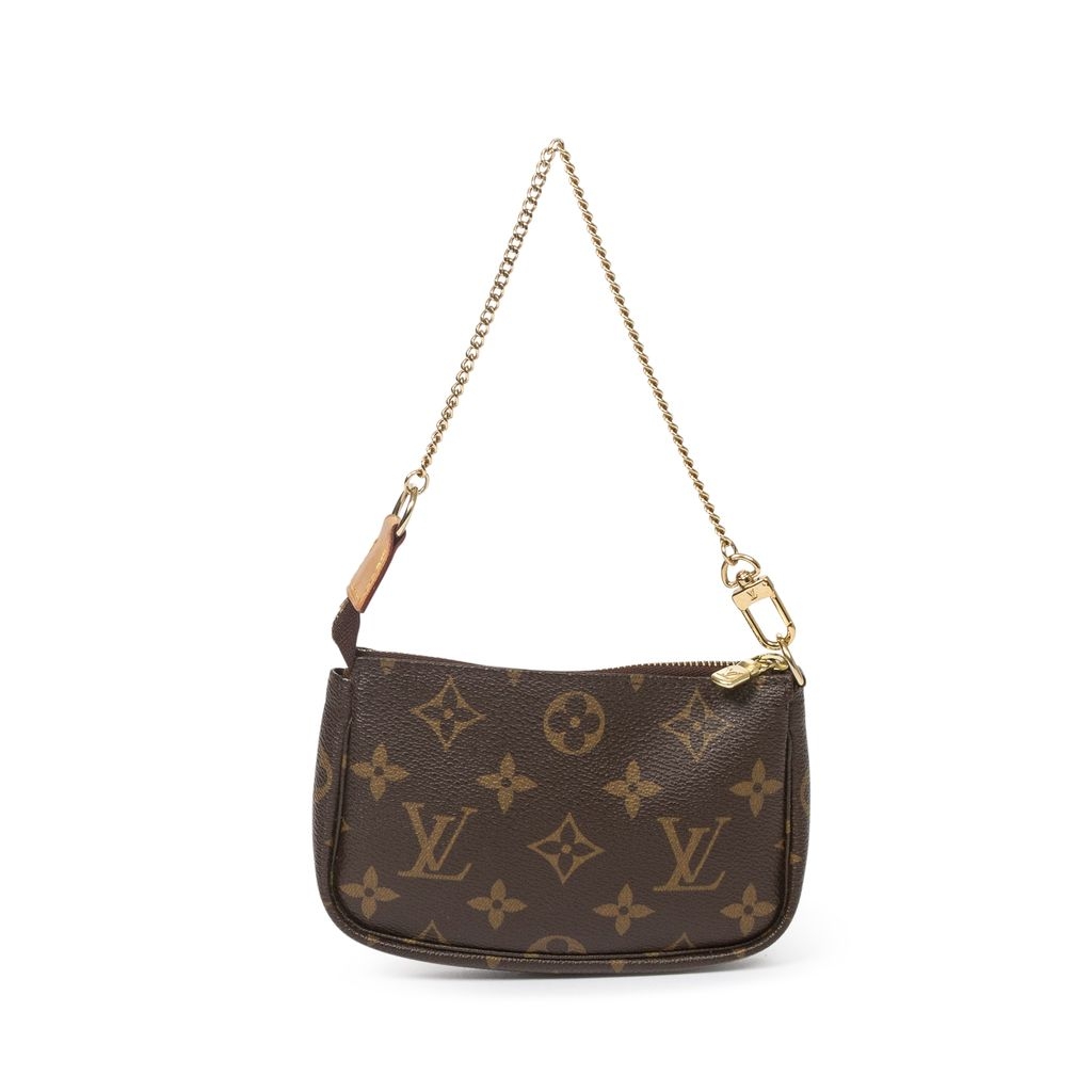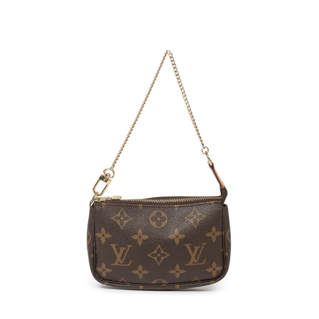 A Louis Vuitton Mini Pochette Accessoires bag, crafted in monogram-coated canvas with leather trim and gold-tone hardware. This vintage design is compact and versatile, featuring a secure zip closure and chain strap that allows it to be carried by hand, on the wrist, or attached to a larger bag. The Mini Pochette is highly sought after for its practicality and iconic style, making it a timeless accessory within the Louis Vuitton collection.