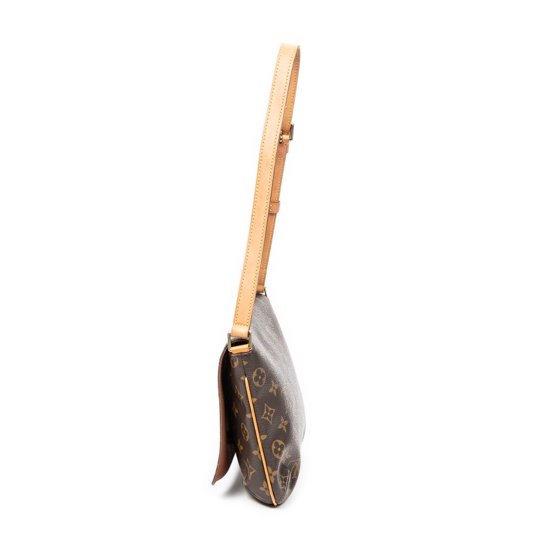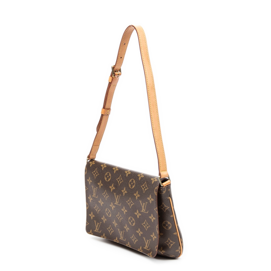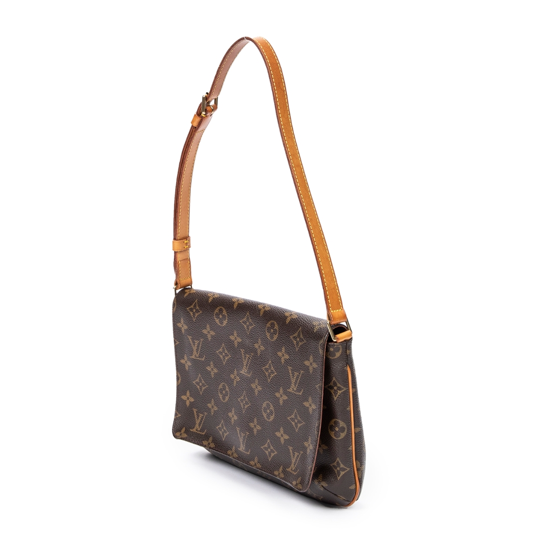 A vintage Louis Vuitton Musette Tango bag crafted in the iconic brown Monogram coated canvas, complemented by natural leather trim and gold-tone hardware. The compact, softly structured silhouette offers a refined take on everyday styling, with the adjustable strap allowing for a comfortable shoulder carry.