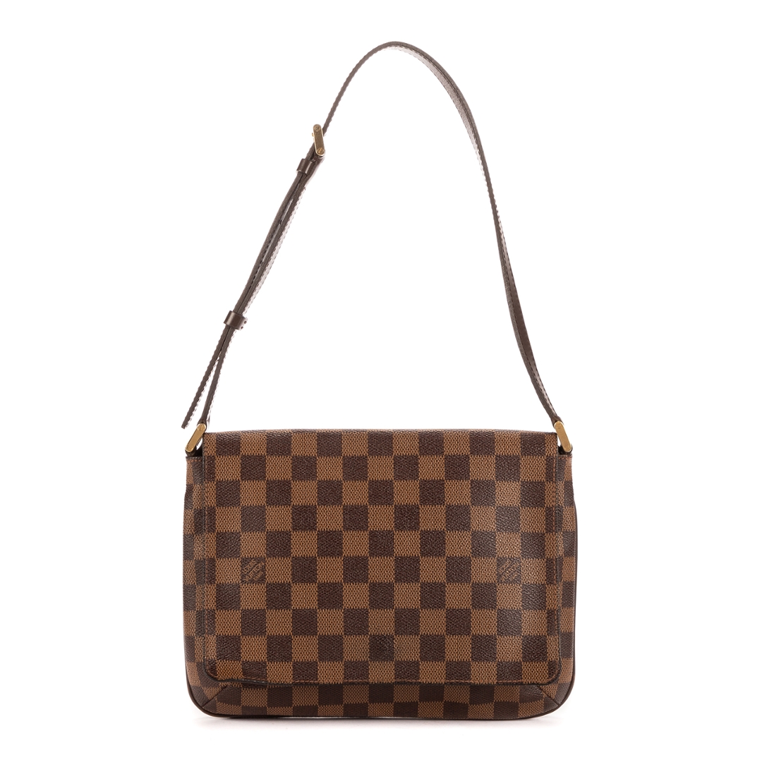 A vintage Louis Vuitton Musette Tango bag captures the perfect blend of timeless sophistication and everyday practicality. Crafted in Louis Vuitton’s iconic Damier Ebene coated canvas, it features the brand’s instantly recognizable checkerboard pattern paired with smooth chocolate-brown leather trim and gold-tone hardware for a refined finish.