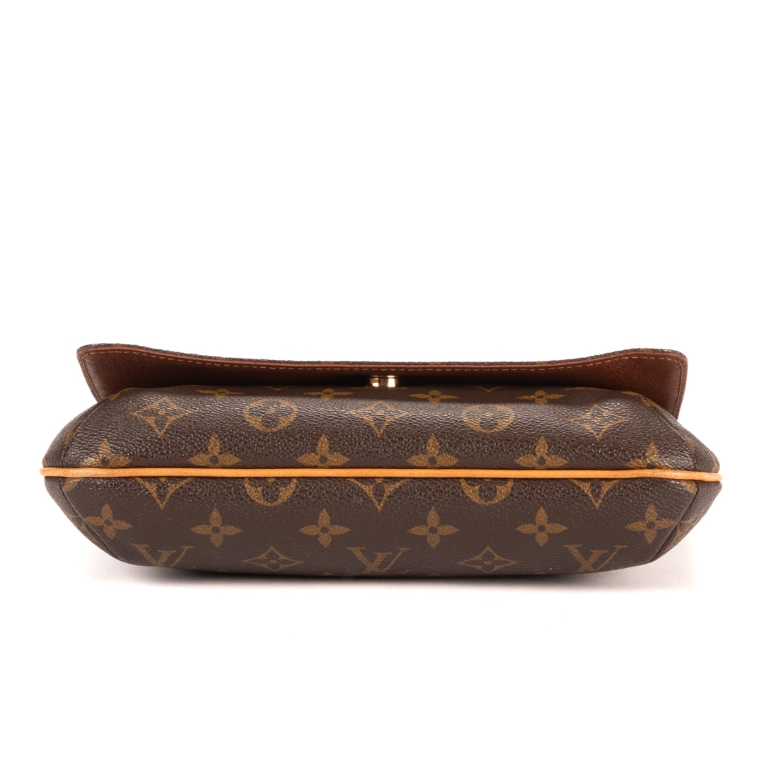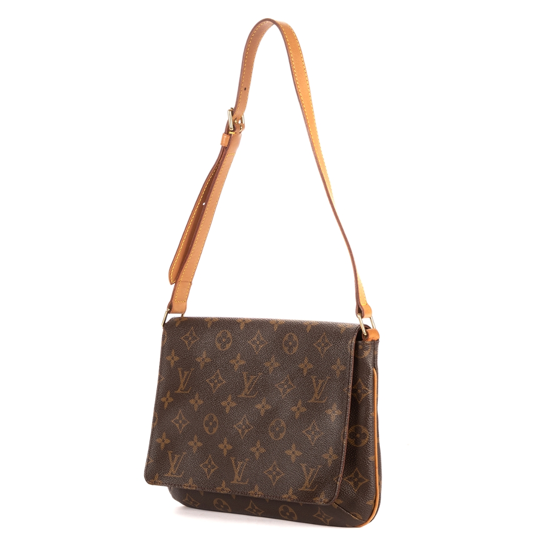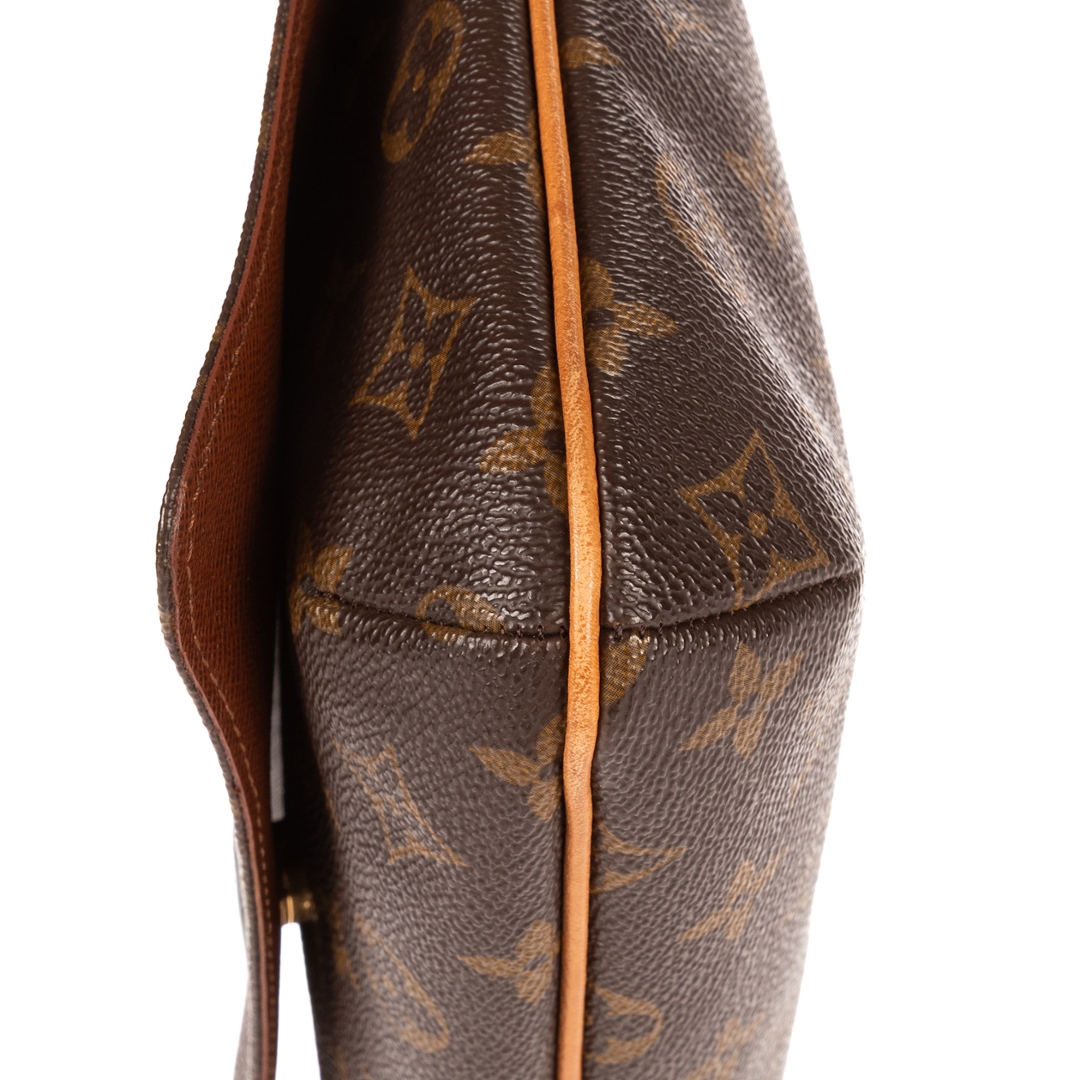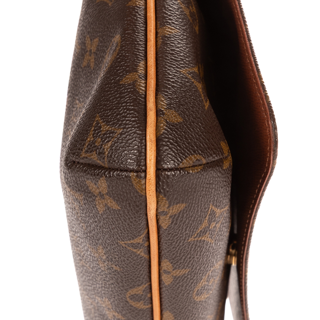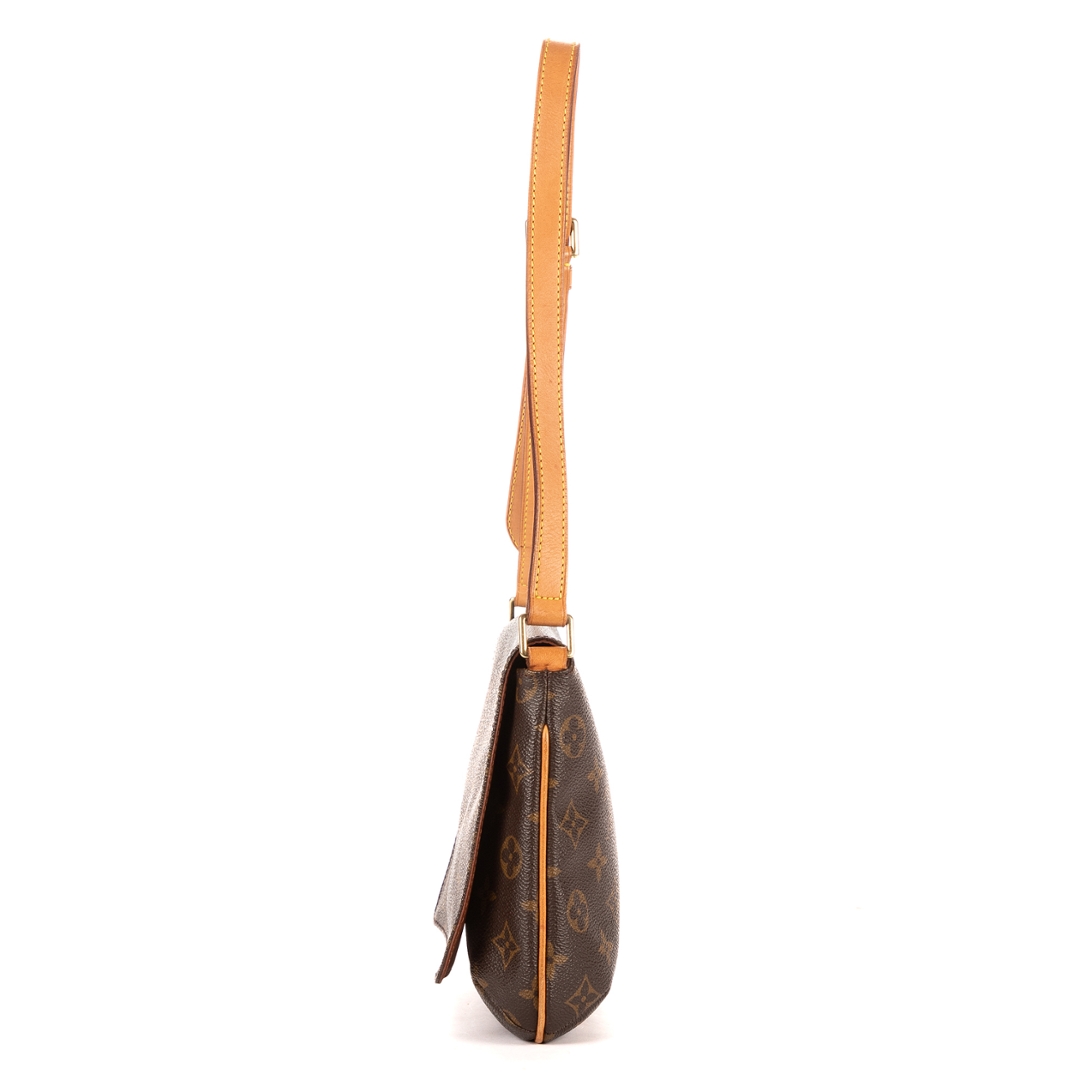 A vintage Louis Vuitton Musette Tango bag crafted in the iconic brown Monogram coated canvas, complemented by natural leather trim and gold-tone hardware. The clean, structured silhouette reflects the timeless appeal of this classic shoulder bag, with an adjustable strap that allows for a comfortable and adaptable fit.