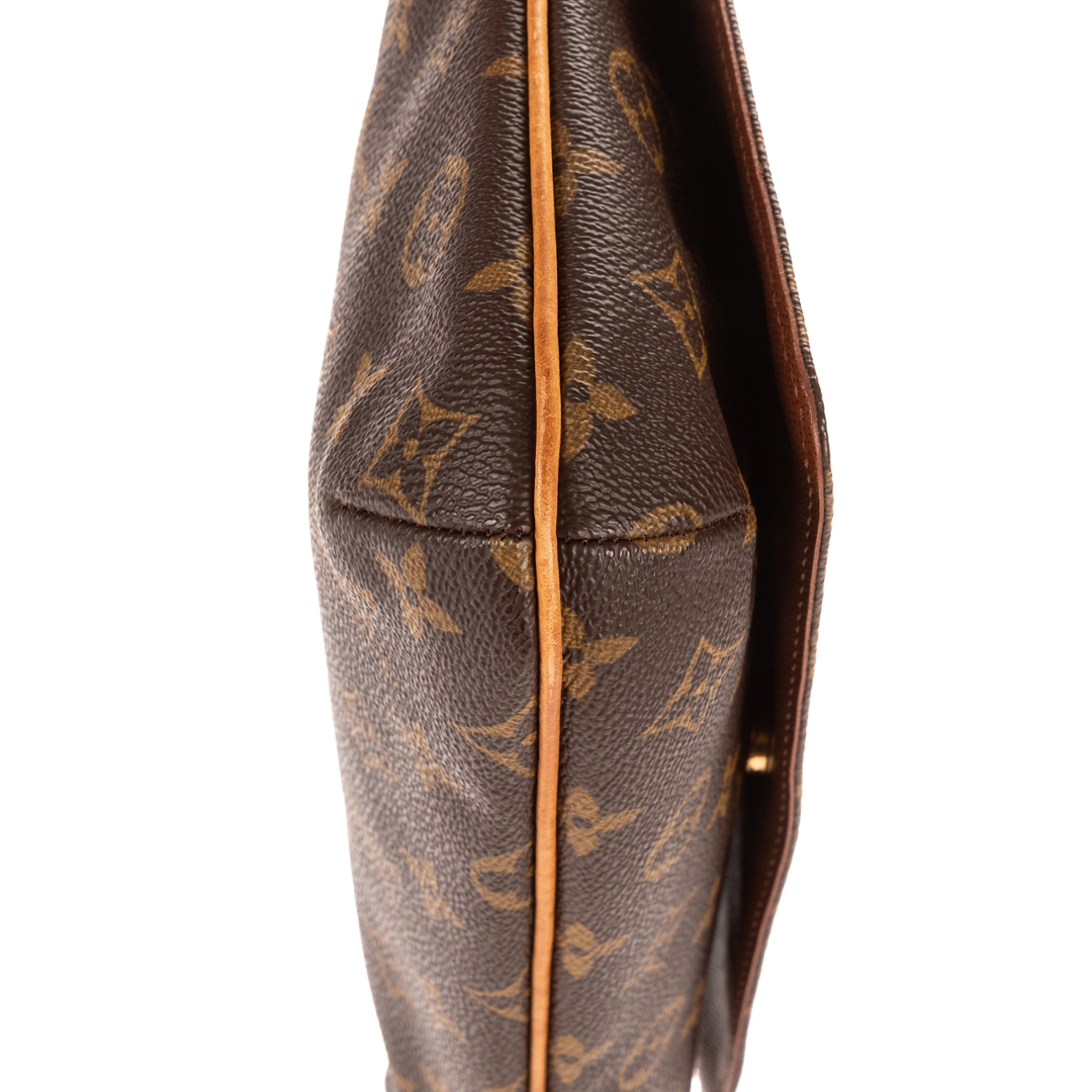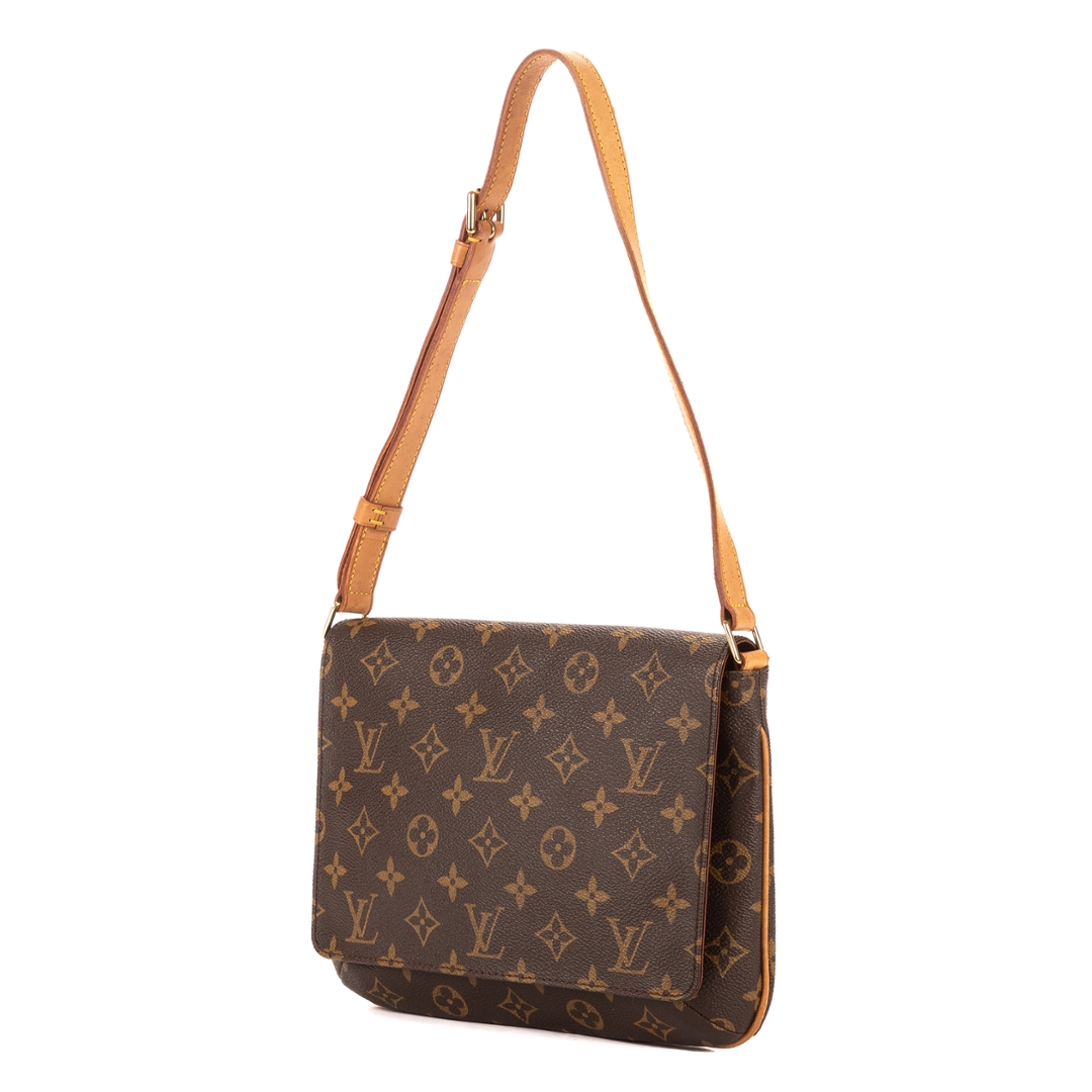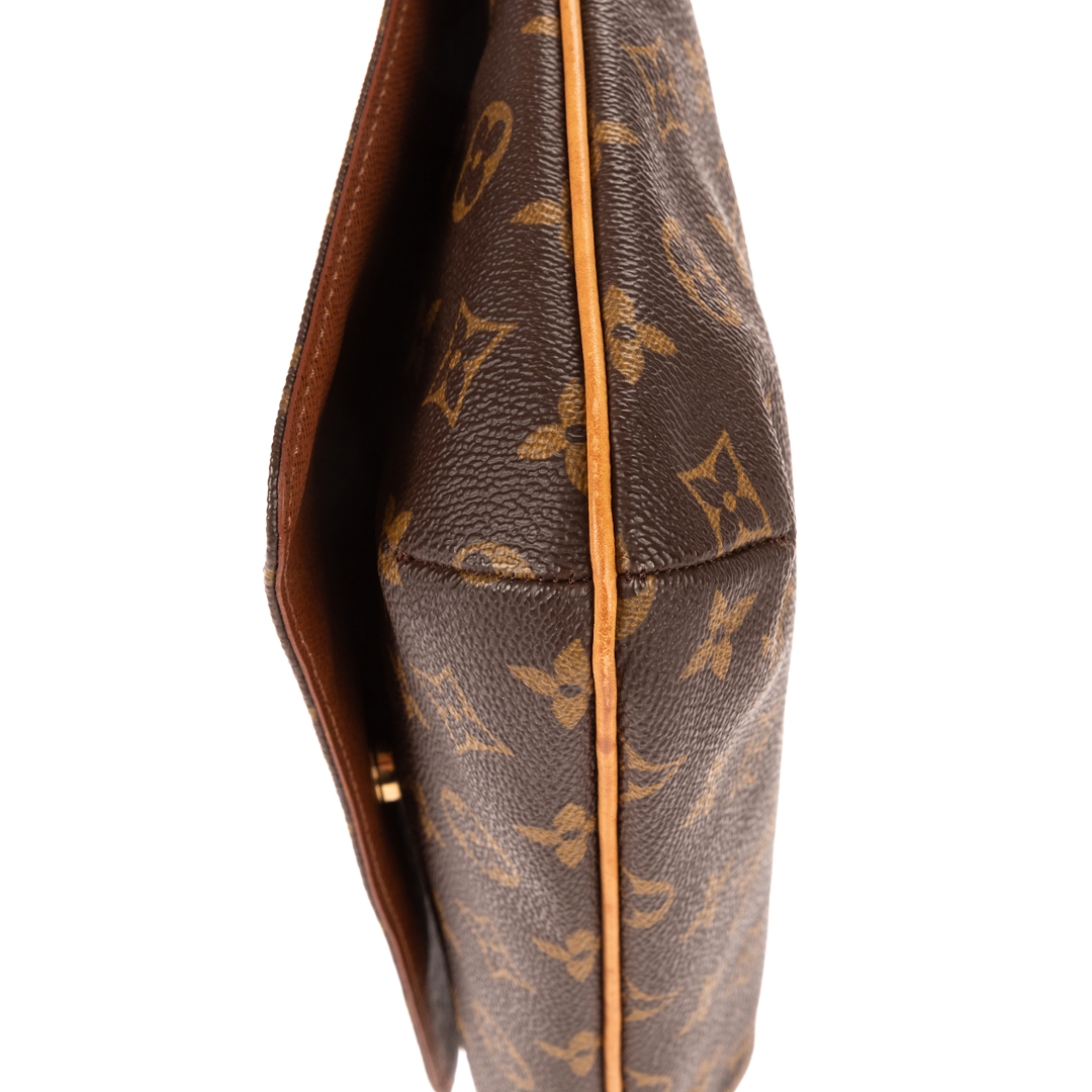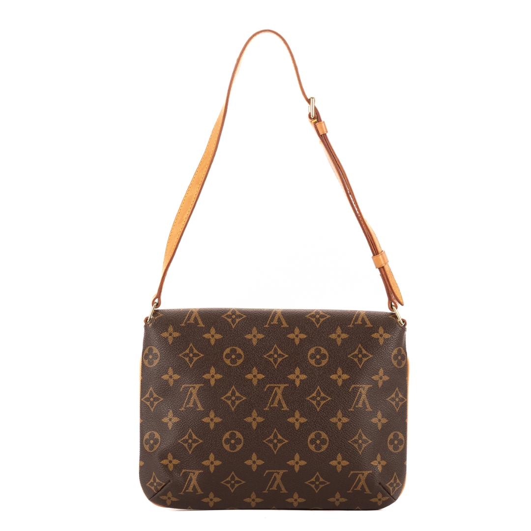 A vintage Louis Vuitton Musette Tango bag crafted in the iconic brown Monogram coated canvas, complemented by natural leather trim and gold-tone hardware. The structured yet lightweight design reflects the enduring appeal of this classic shoulder bag, finished with an adjustable strap for a comfortable and adaptable fit.
