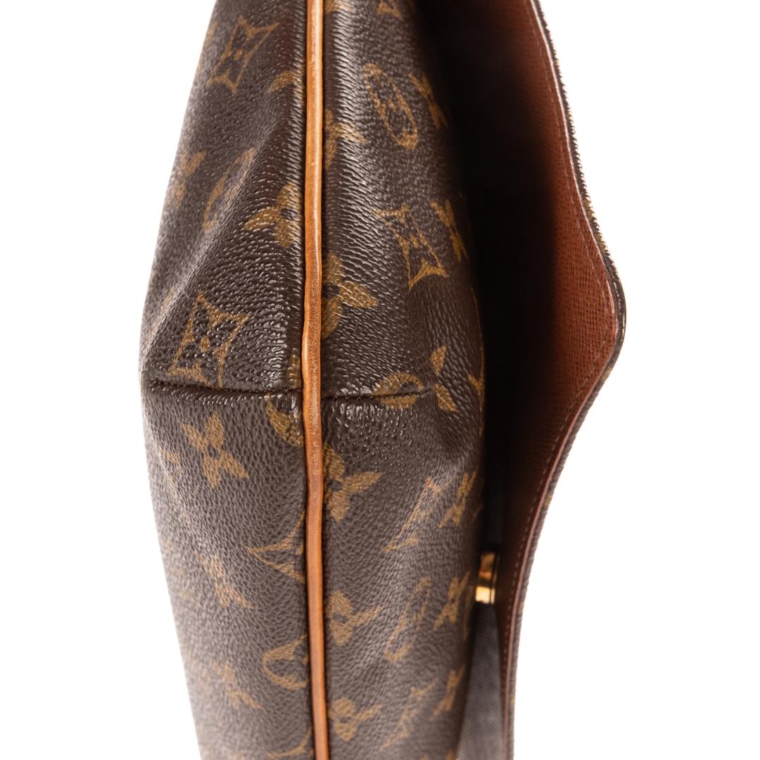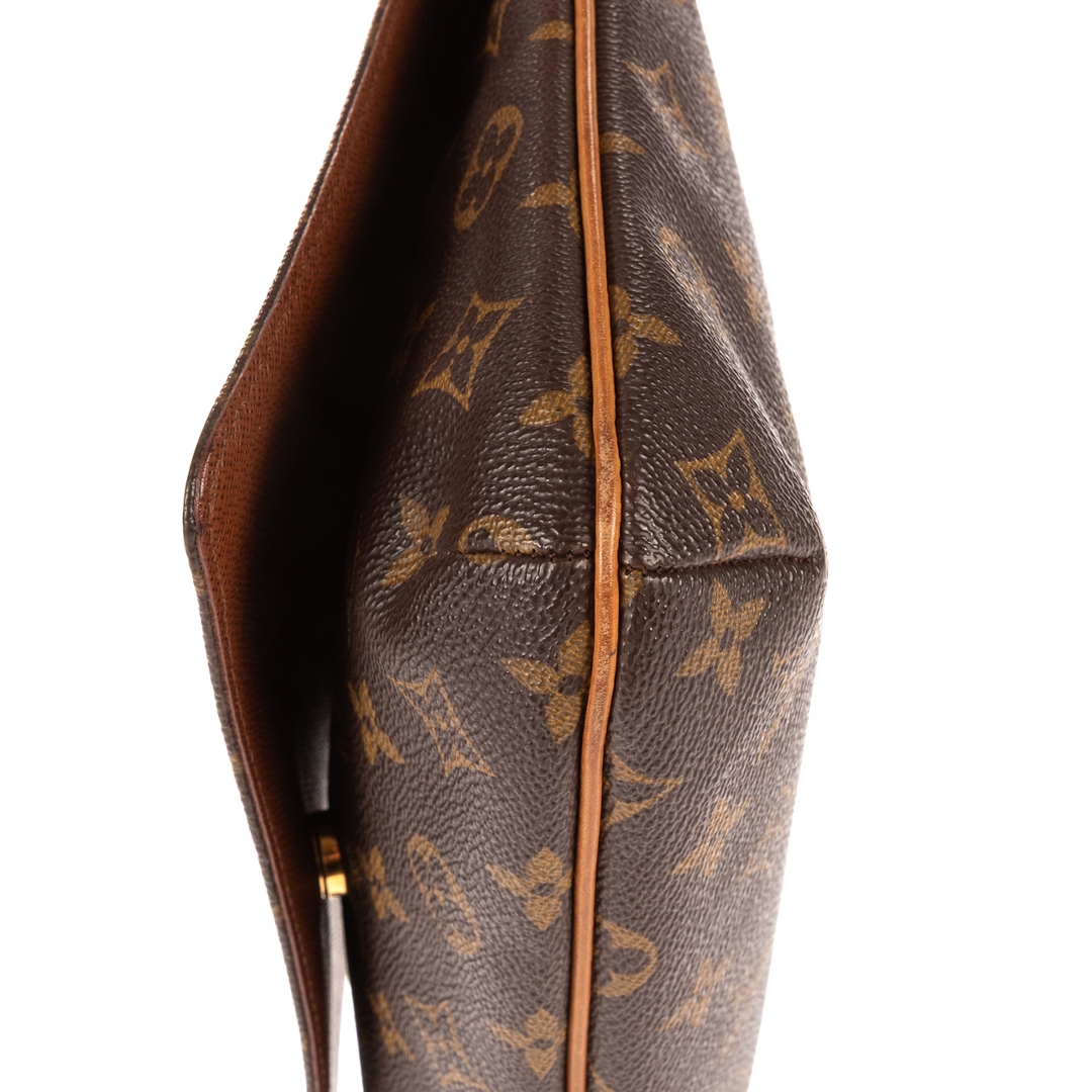 A vintage Louis Vuitton Musette Tango bag crafted in the iconic brown Monogram coated canvas, complemented by natural leather trim and gold-tone hardware. The refined, structured silhouette showcases the timeless appeal of this classic shoulder design, complete with an adjustable strap for comfortable everyday wear.