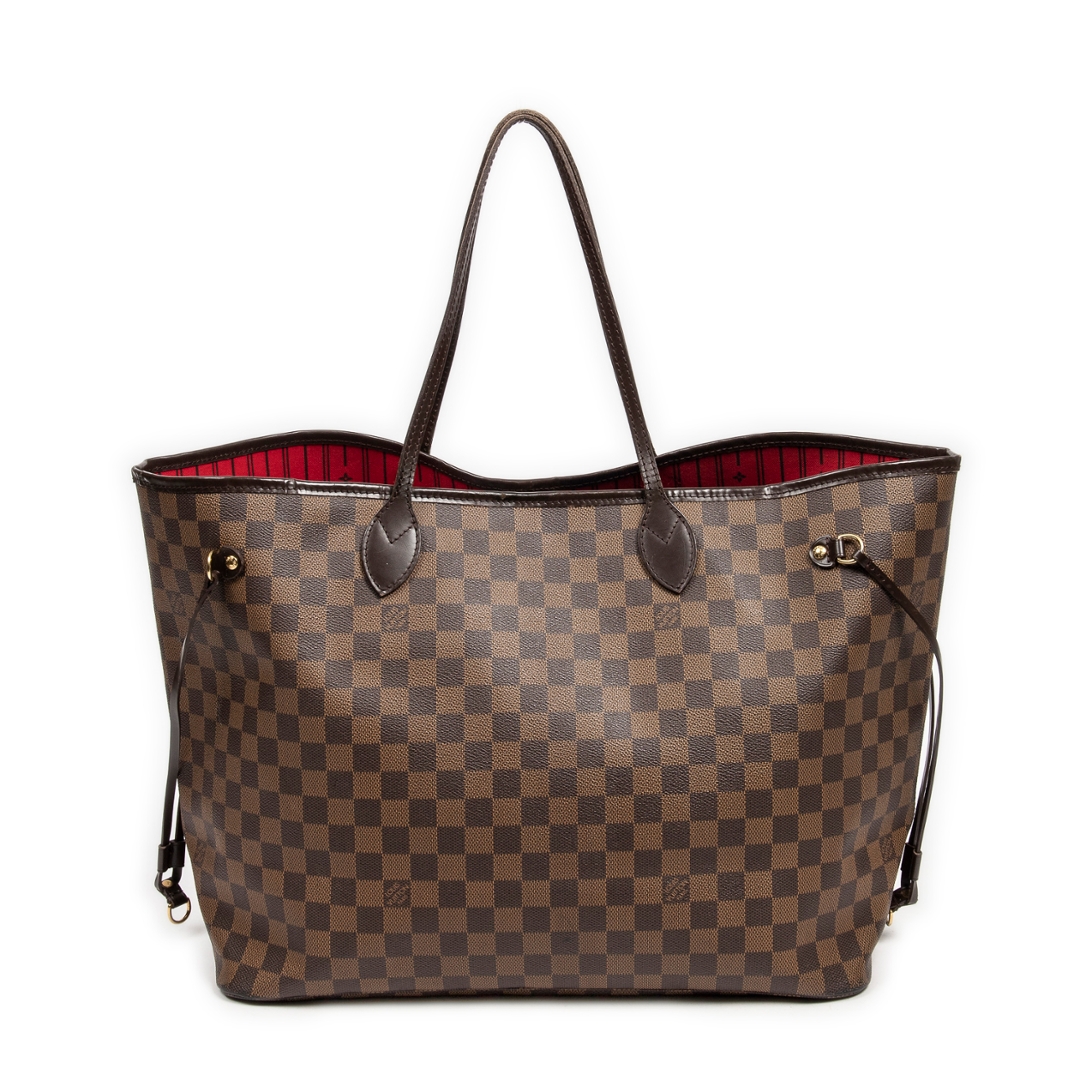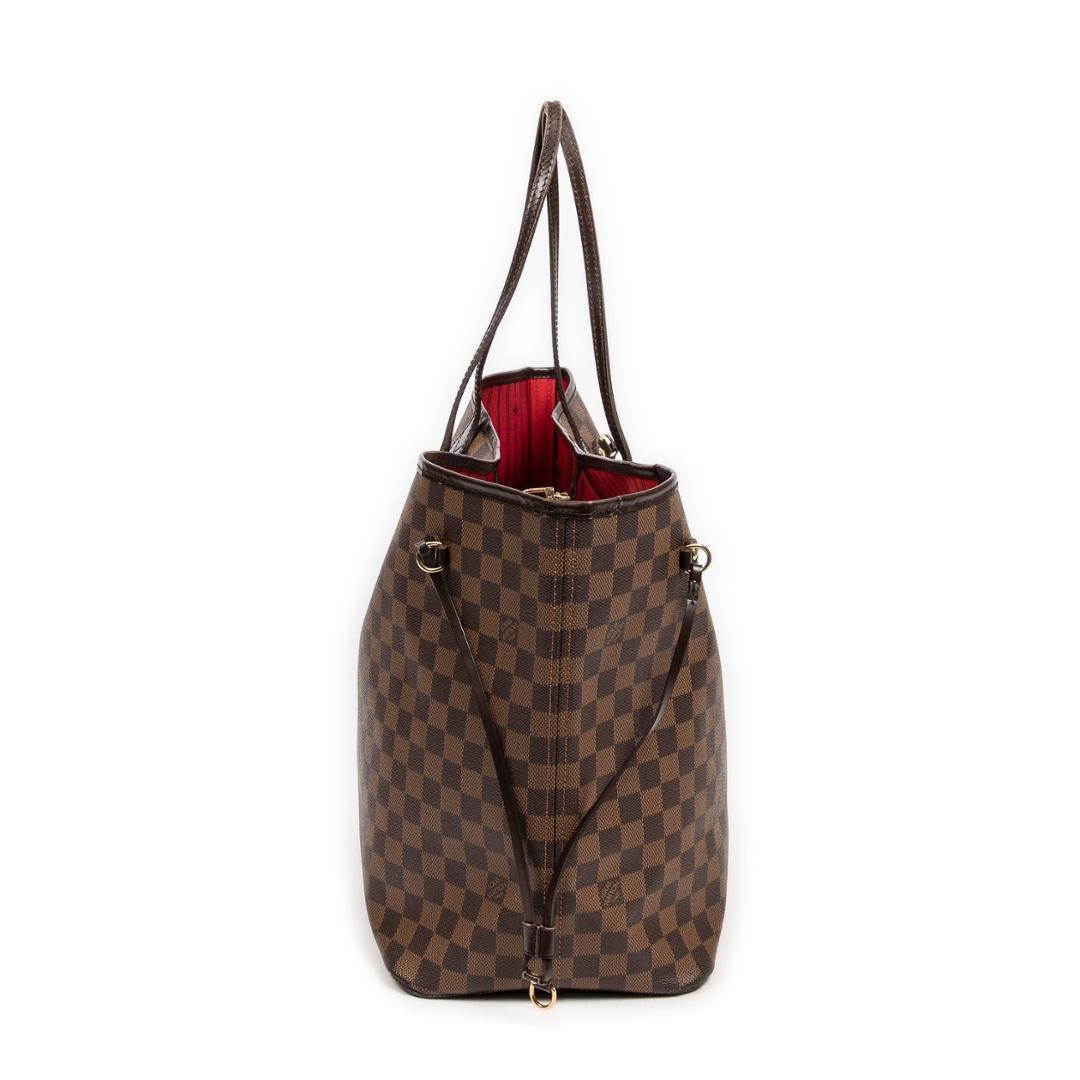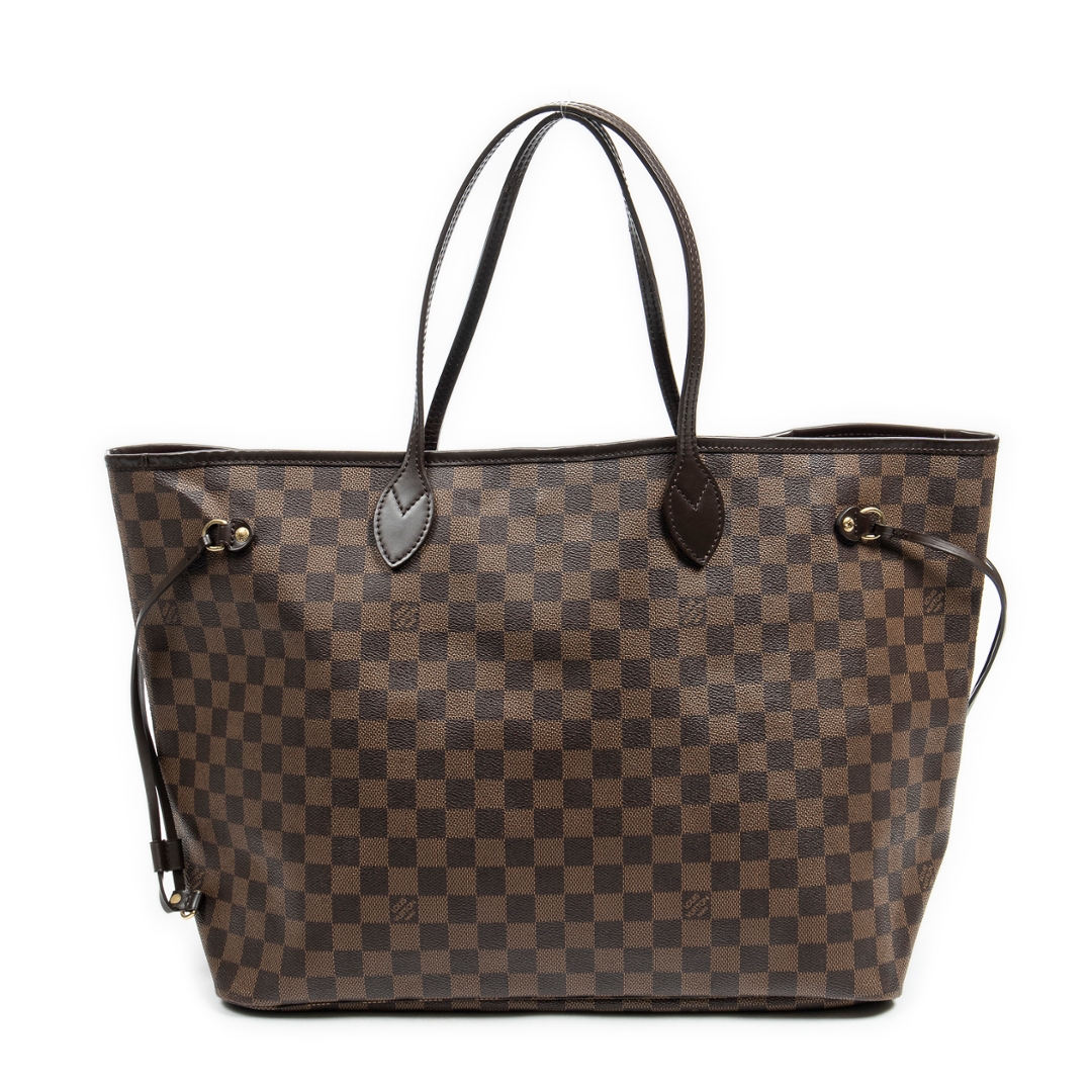 A vintage Louis Vuitton Neverfull bag crafted in the iconic brown Damier Ebene coated canvas, complemented by dark leather trim and gold-tone hardware. The instantly recognisable tote silhouette is both timeless and practical, with the signature checkerboard pattern offering a refined, understated luxury aesthetic.