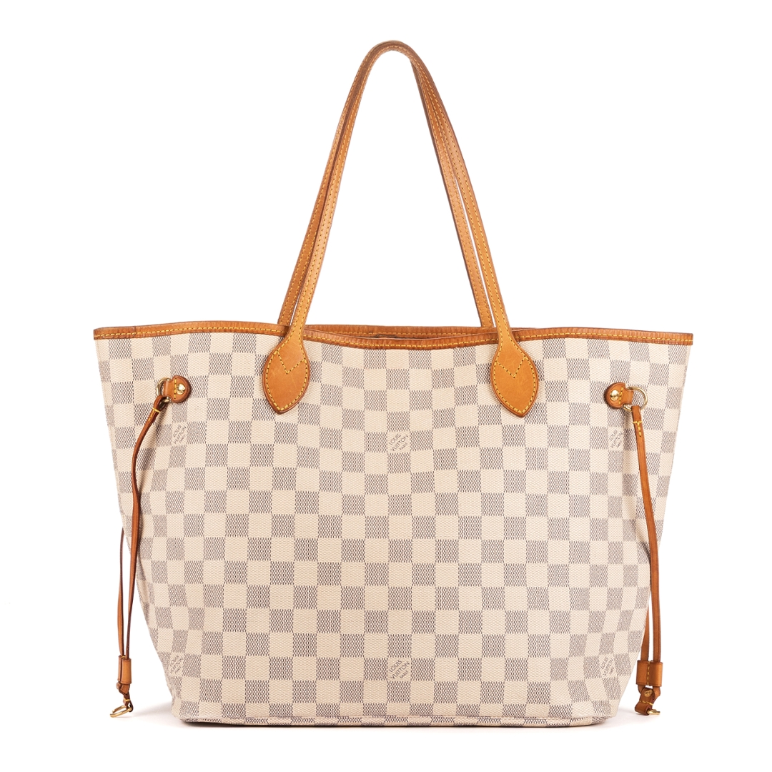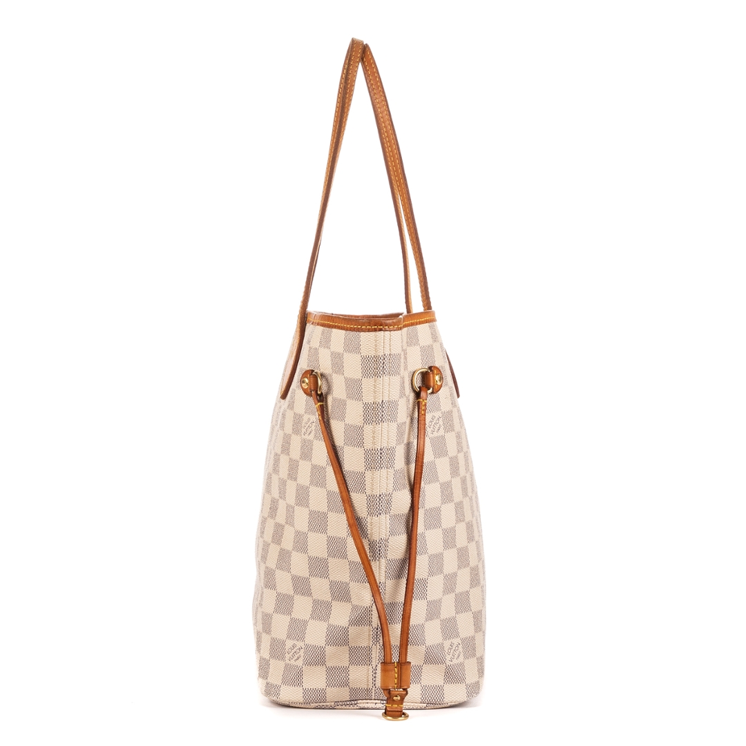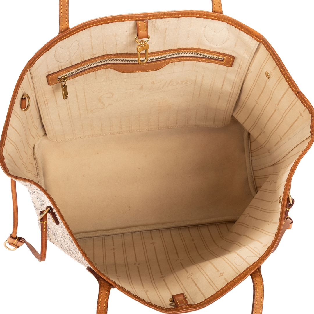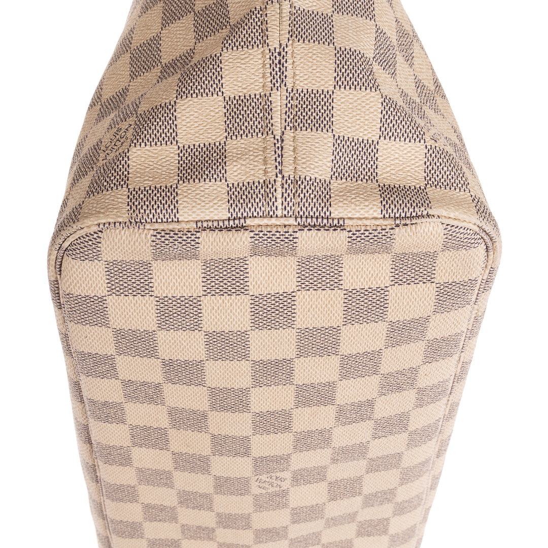 A vintage Louis Vuitton Neverfull is a timeless expression of effortless luxury and practicality. Crafted in white Damier Azur coated canvas, it features the signature checkerboard motif complemented by natural cowhide leather trim that has developed a rich patina, adding authentic vintage charm. The refined combination of light tones and golden accents embodies the classic elegance Louis Vuitton is renowned for.