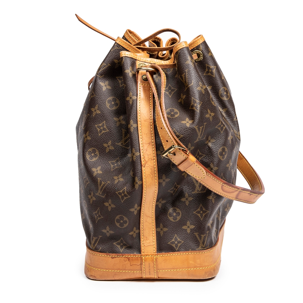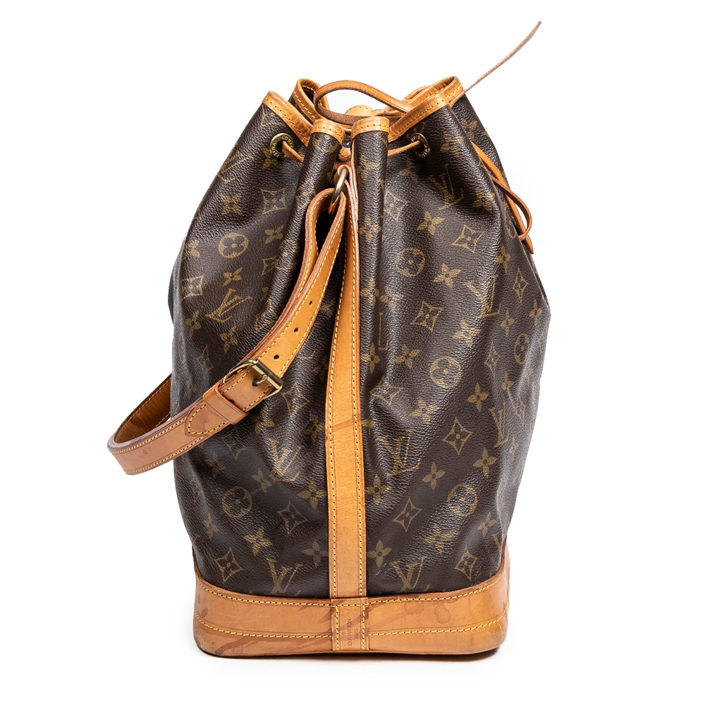 A vintage Louis Vuitton Noé bag crafted in the iconic brown Monogram coated canvas, finished with natural leather trim and gold-tone hardware. Originally designed to carry champagne bottles, this classic bucket silhouette has become one of the brand’s most recognisable and enduring styles, combining heritage design with effortless versatility.