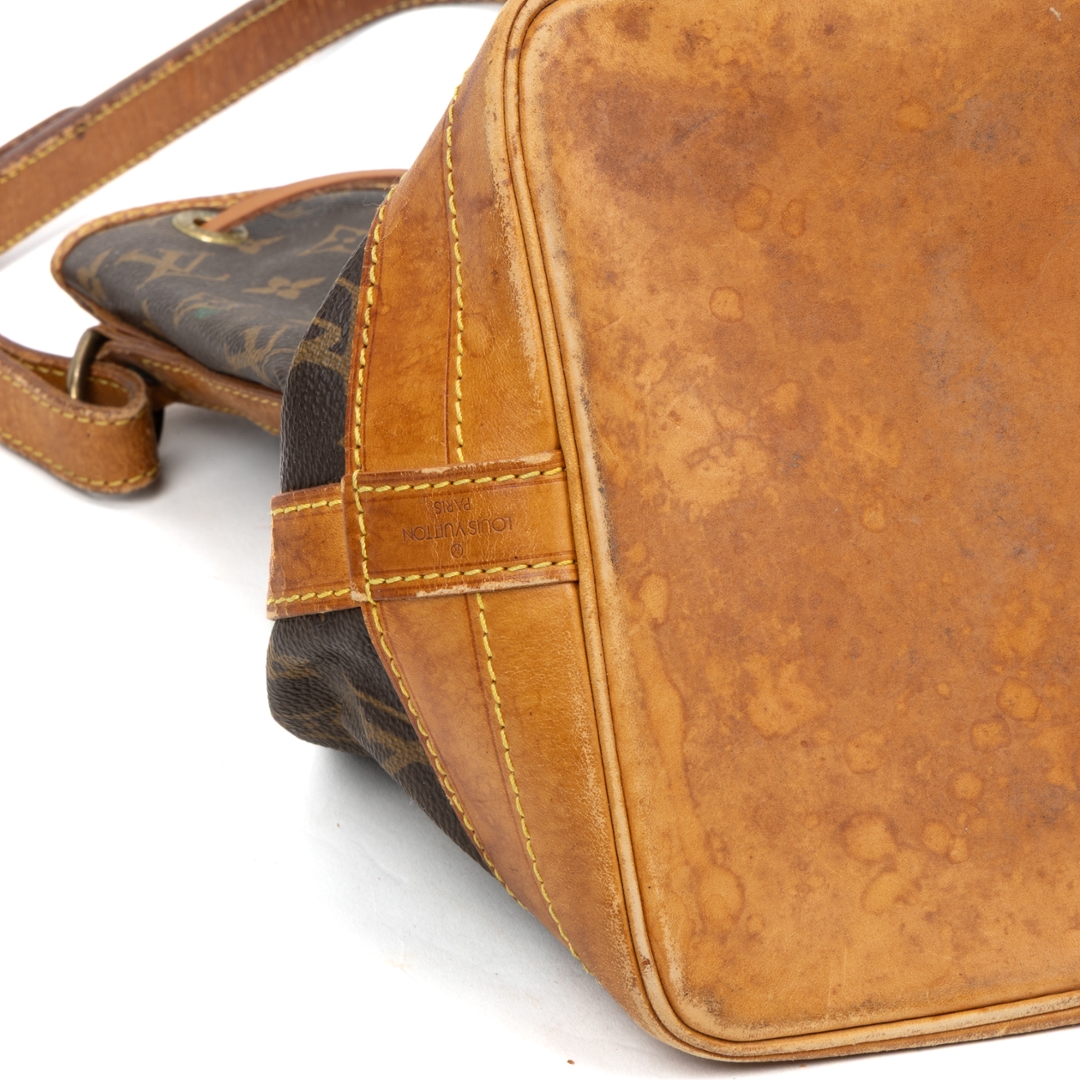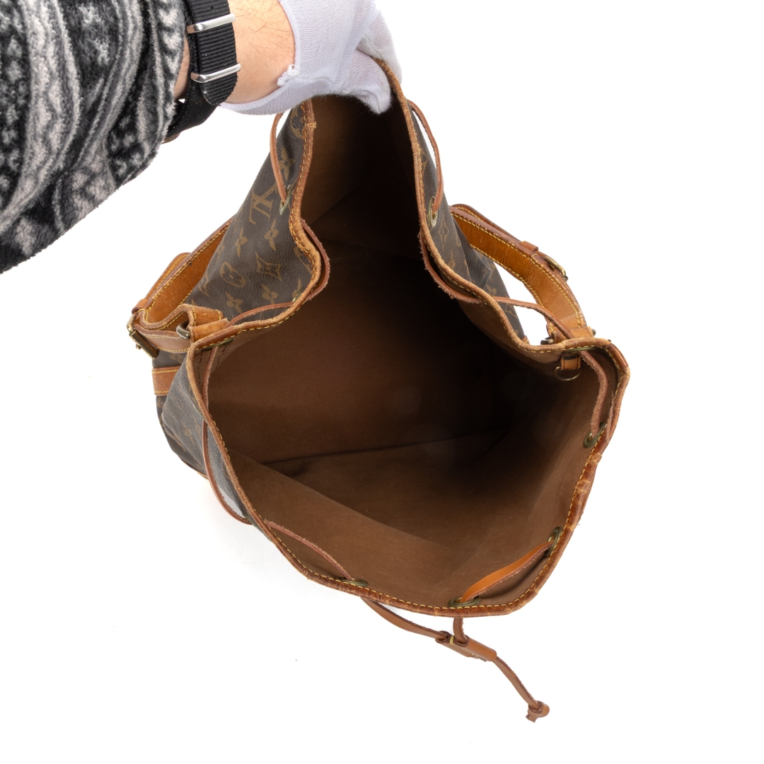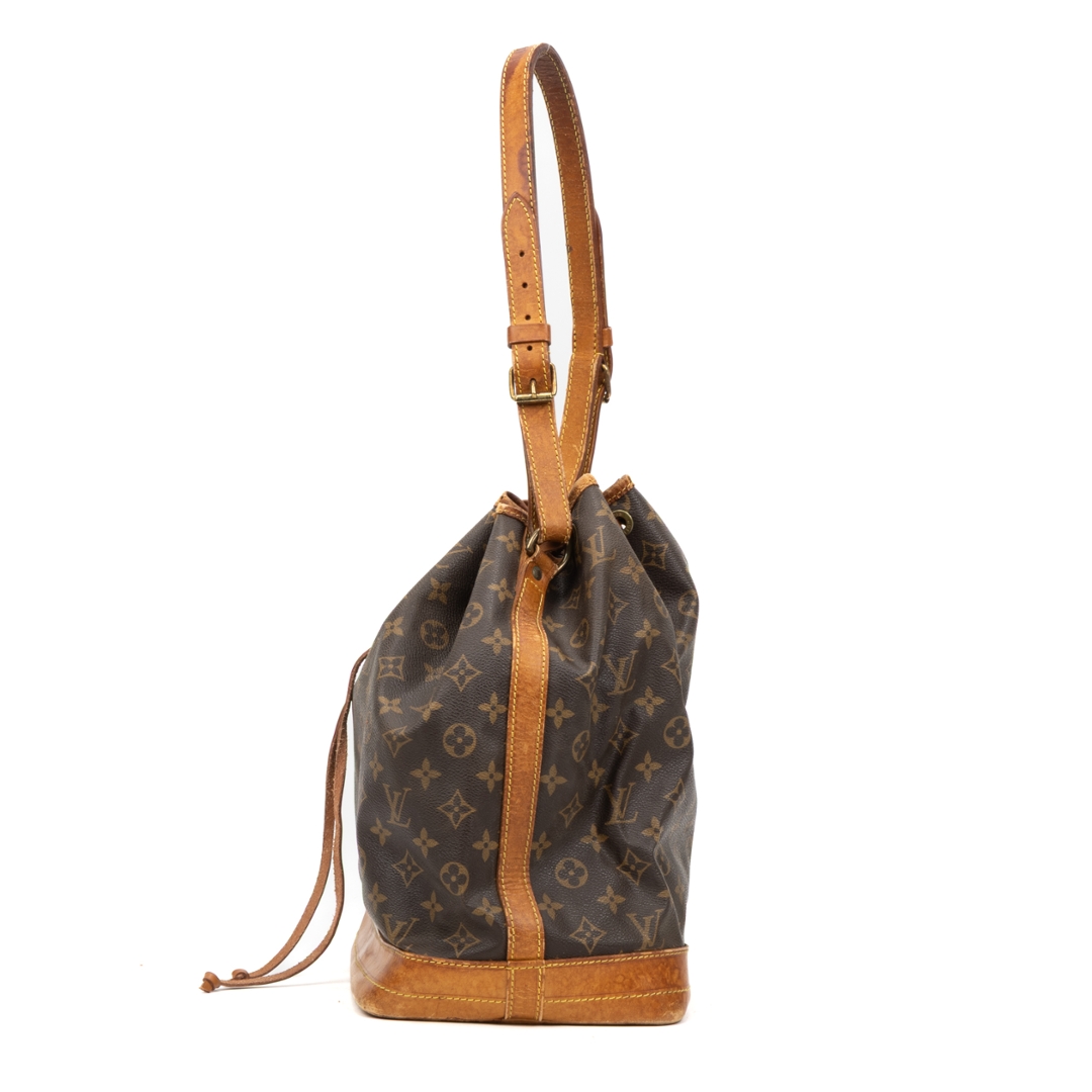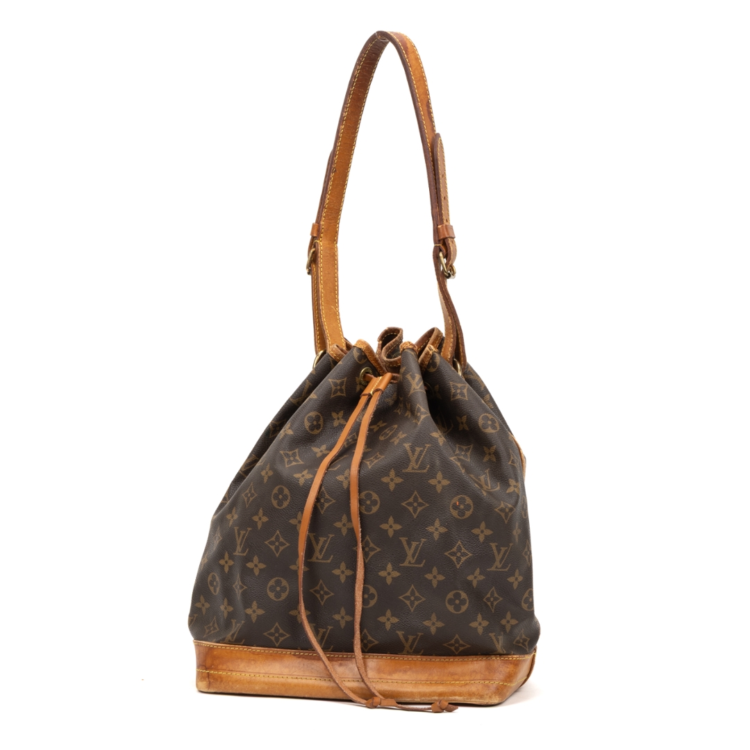 A vintage Louis Vuitton Noé bag crafted in the house’s iconic monogram coated canvas, showcasing a timeless silhouette originally designed for both function and style. The instantly recognisable pattern is complemented by natural leather trim, a structured base, and a classic drawstring closure, creating a relaxed yet refined bucket profile.