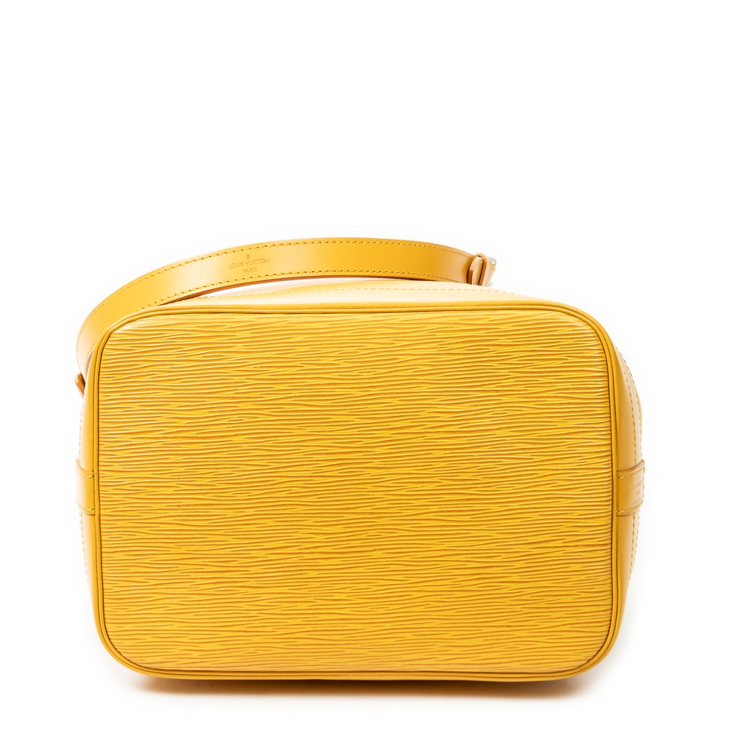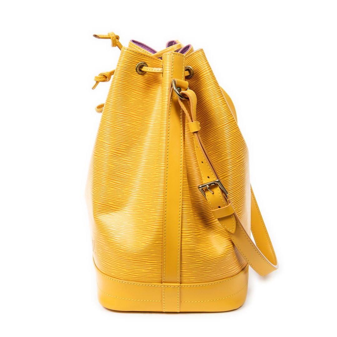 A vintage Louis Vuitton Noé bag crafted in vibrant yellow textured calf leather, offering a bold and distinctive take on one of the house’s most iconic silhouettes. The structured bucket design is enhanced by the signature drawstring closure and tonal leather trim, while the rich colourway adds a striking statement to this timeless piece.