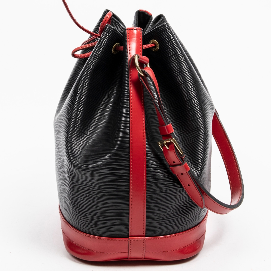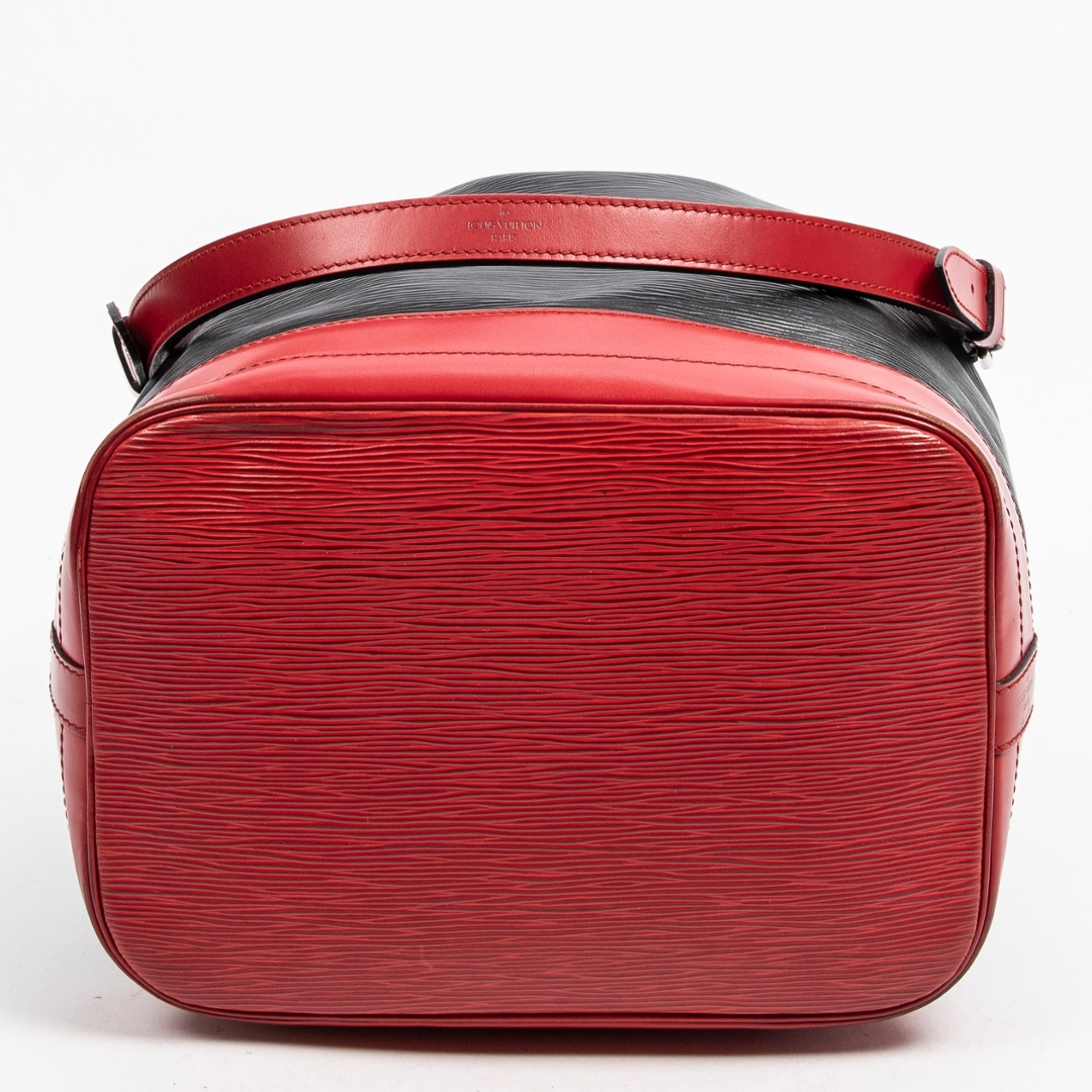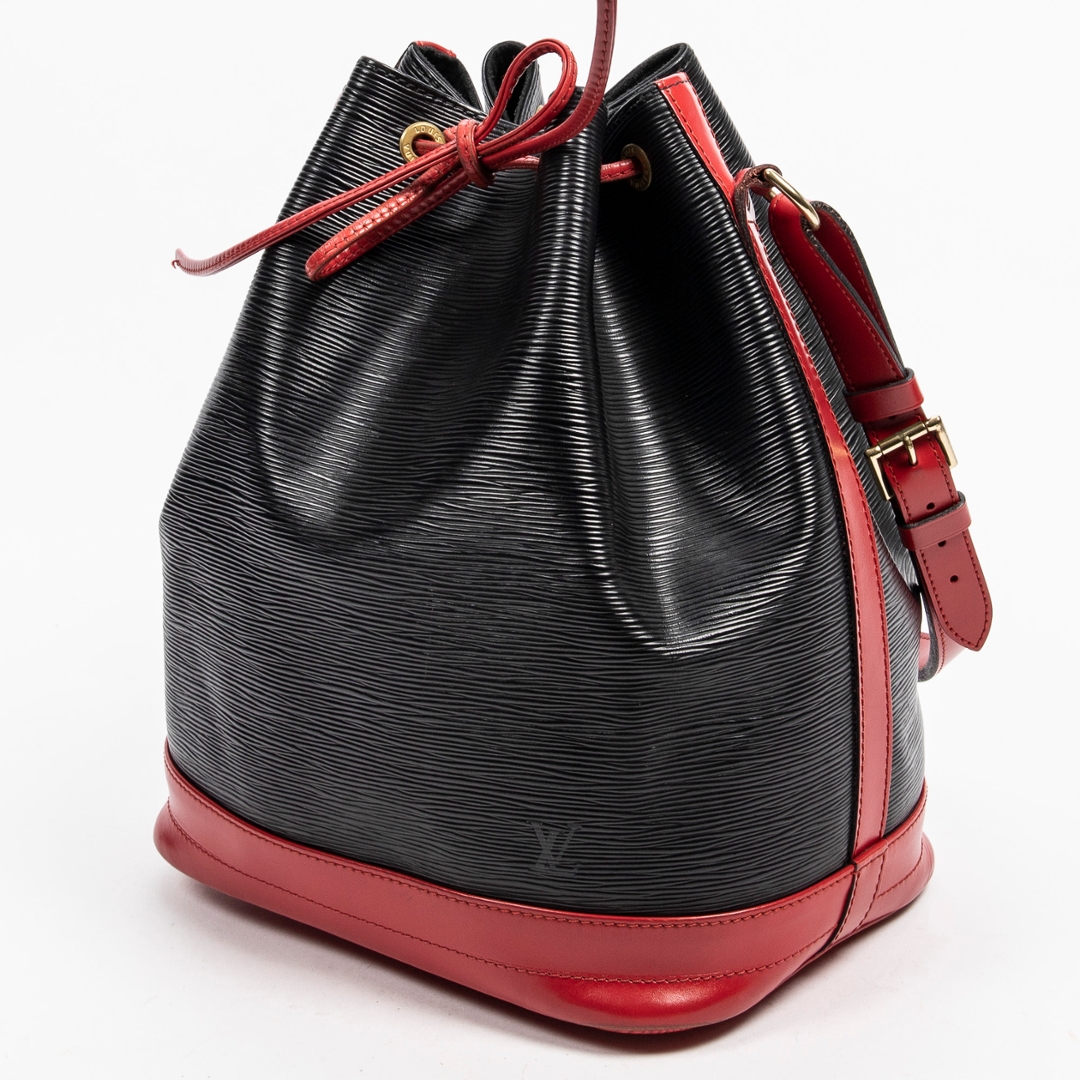 A vintage Louis Vuitton black/red calf leather Noe Bicolor bag with a certificate of authenticity. Approximately 34cm height, 27cm width.