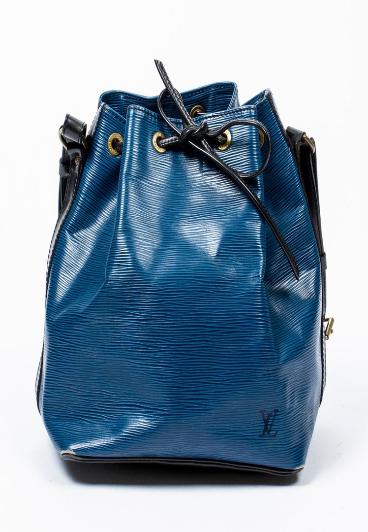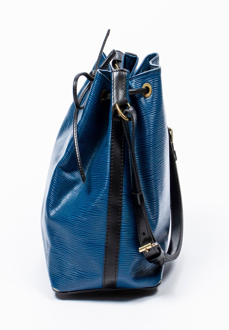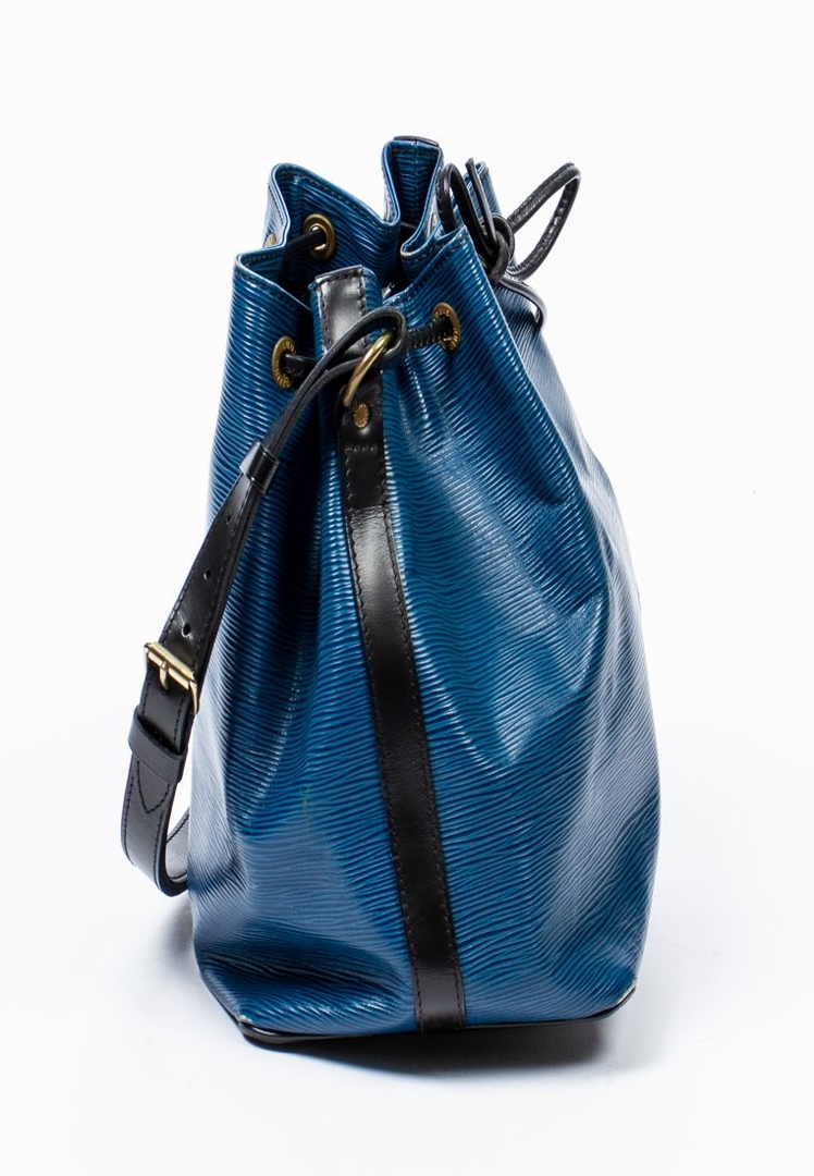 A vintage Louis Vuitton blue/black calf leather Noe Bicolor bag with a certificate of authenticity. Approximately 26cm height, 24cm width.