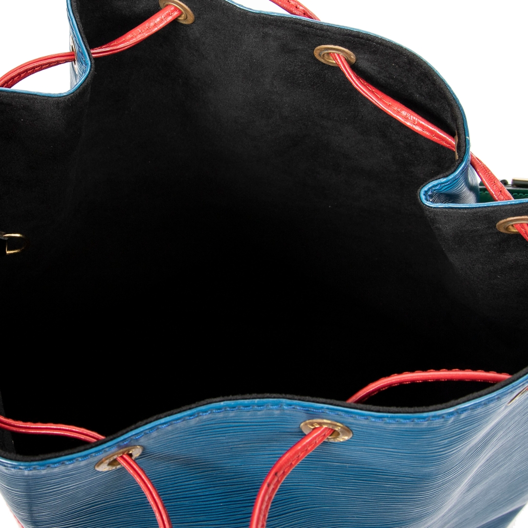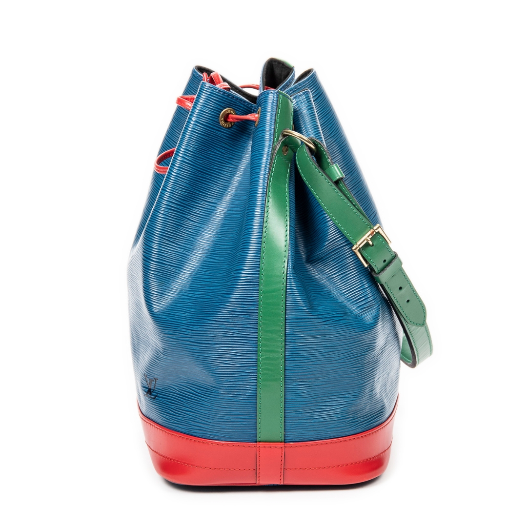 A vintage Louis Vuitton blue red & green calf leather Noe Tricolorbag with a certificate of authenticity. Approximately 34cm height, 27cm width.