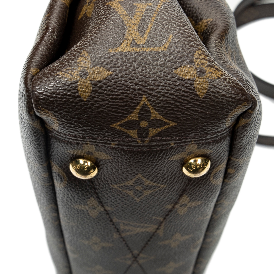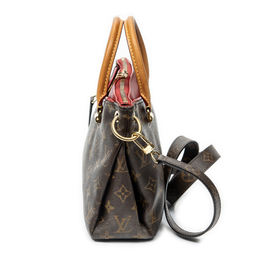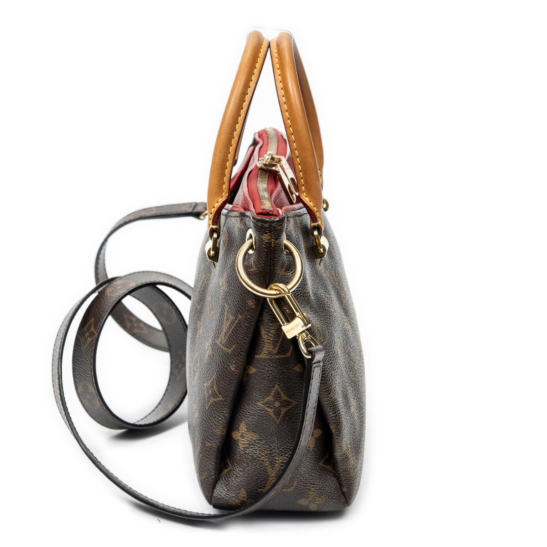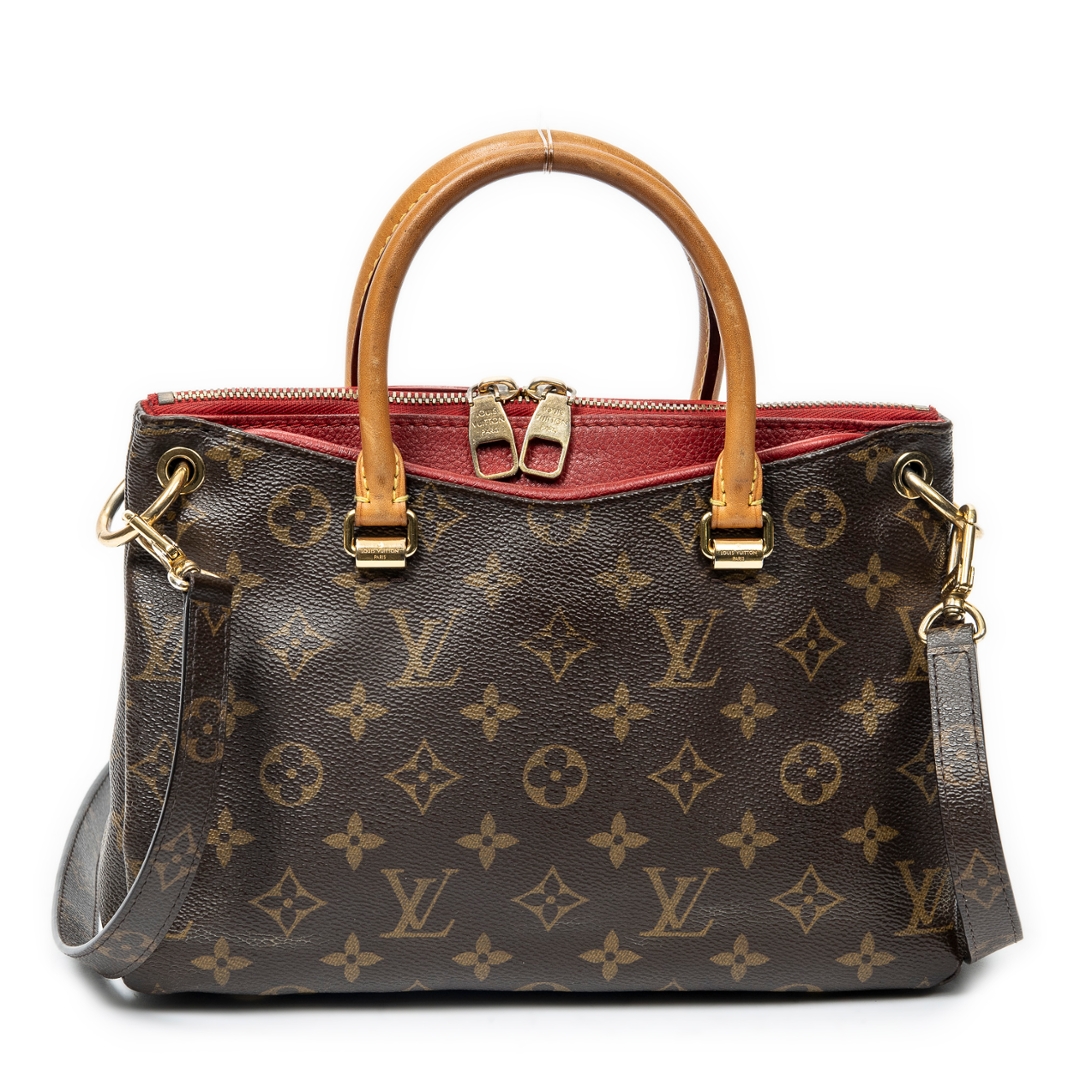 A vintage Louis Vuitton brown/red coated canvas Pallas bag with a certificate of authenticity. Approximately 18cm height, 26cm width.