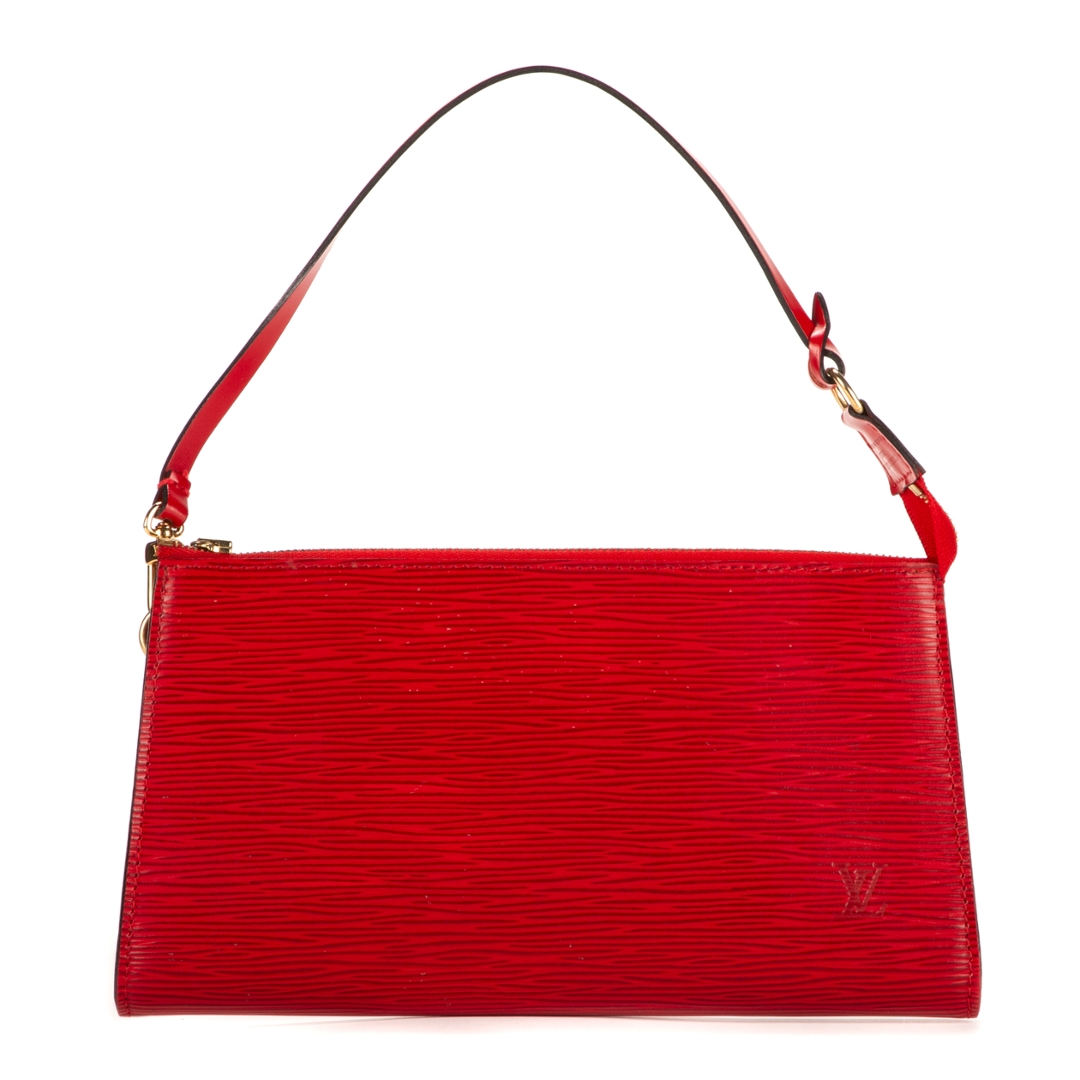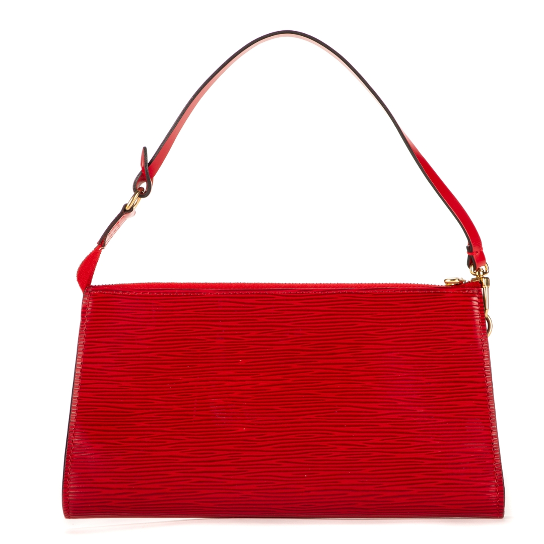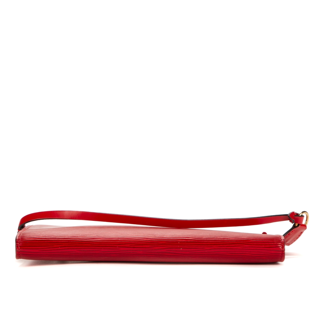 A vintage Louis Vuitton red calf leather Pochette Accessoires bag with a certificate of authenticity. Approximately 13cm height, 24cm width.