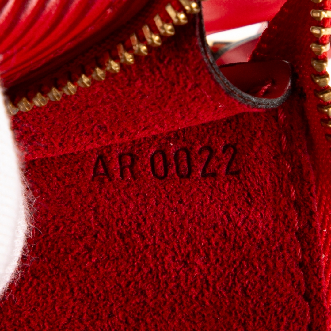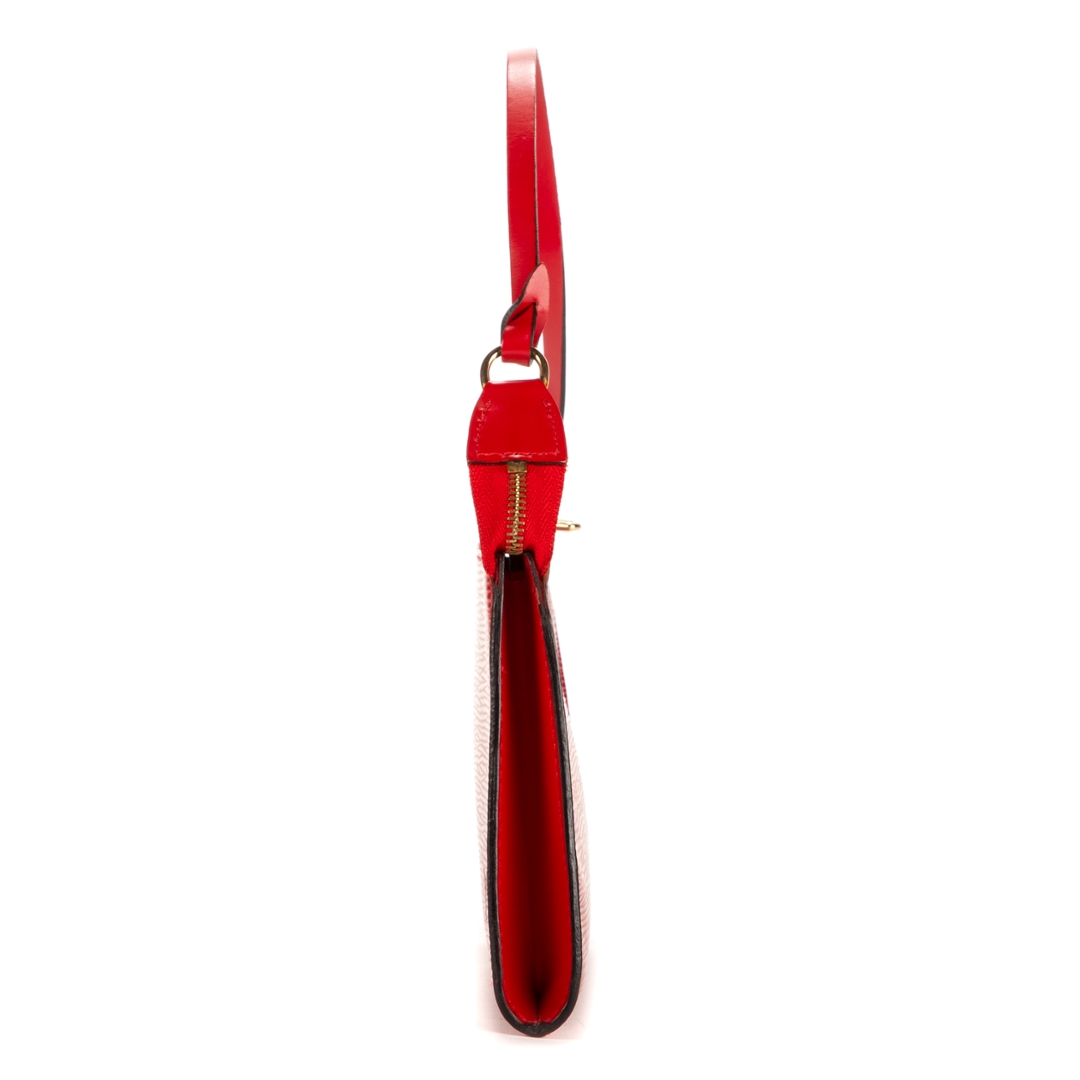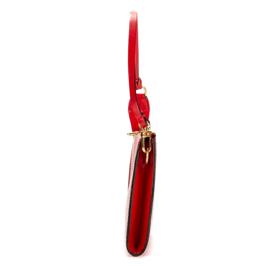 A vintage Louis Vuitton red calf leather Pochette Accessoires bag with a certificate of authenticity. Approximately 13cm height, 24cm width.