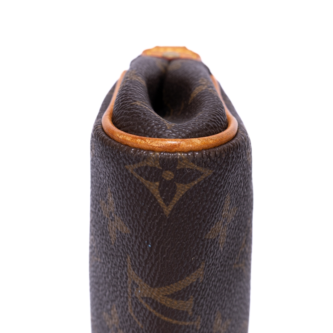 A vintage Louis Vuitton Pochette Eva bag crafted in the house’s iconic monogram coated canvas, enhanced by natural leather trim and elegant gold-tone hardware. This refined and compact design is distinguished by its sleek profile and signature front plaque, offering a timeless yet contemporary appeal.
