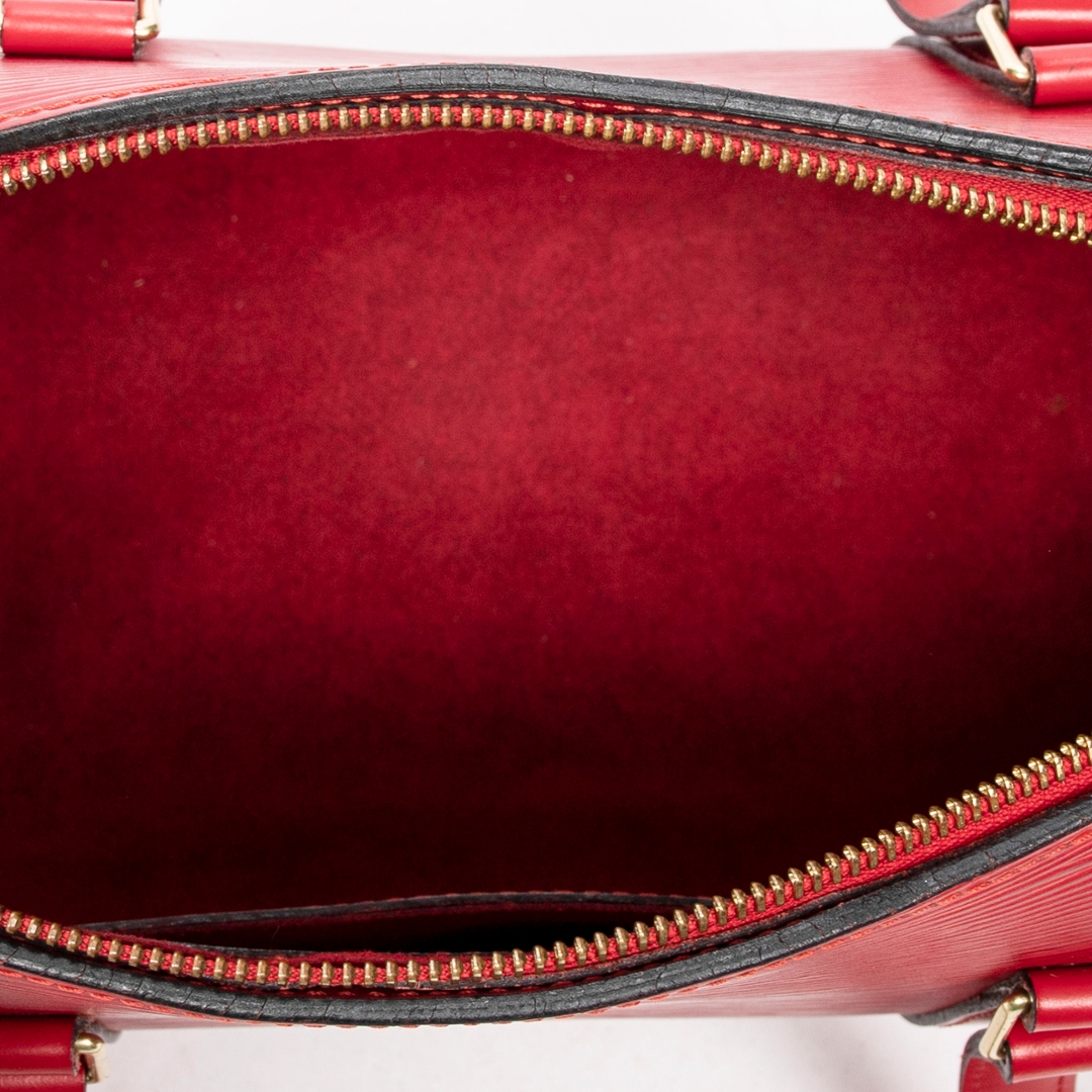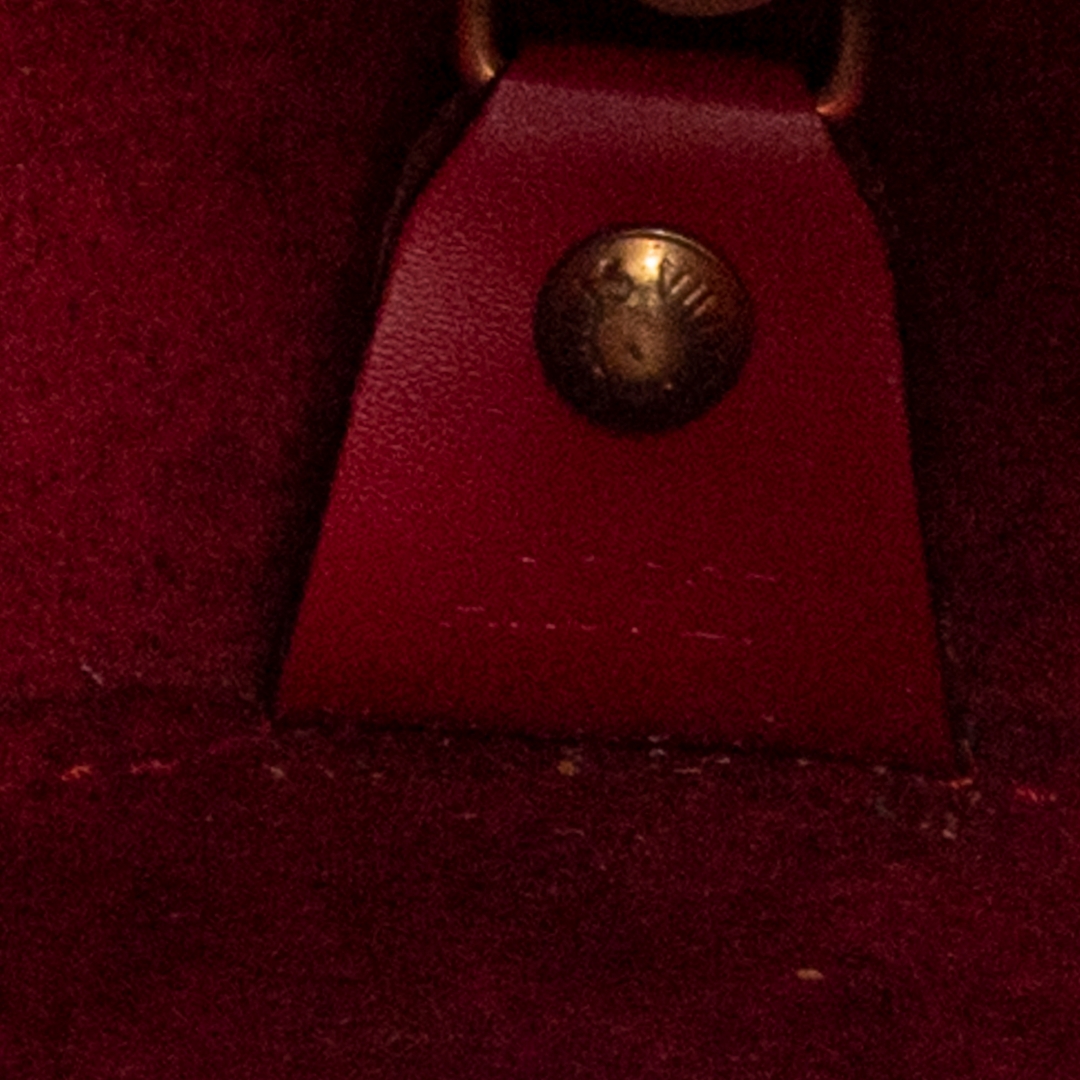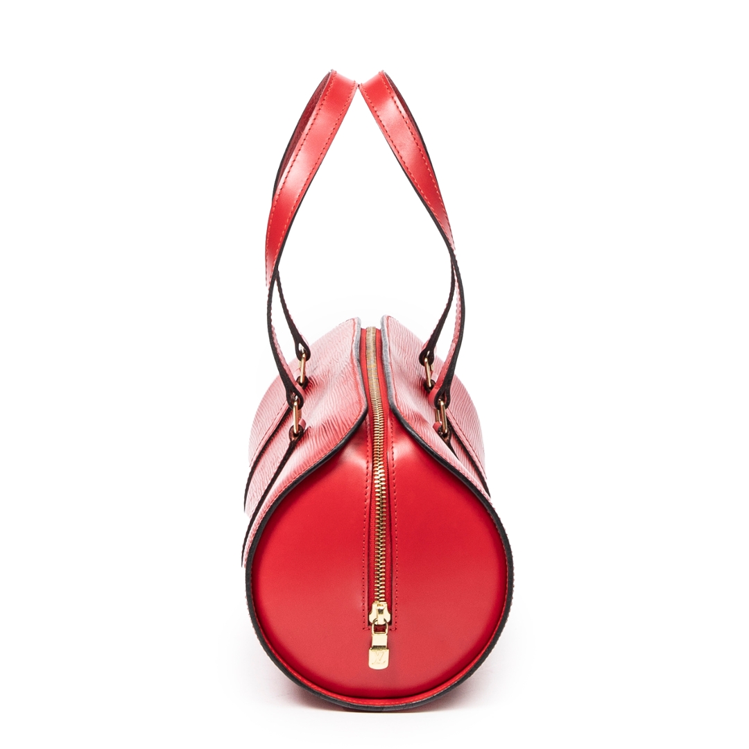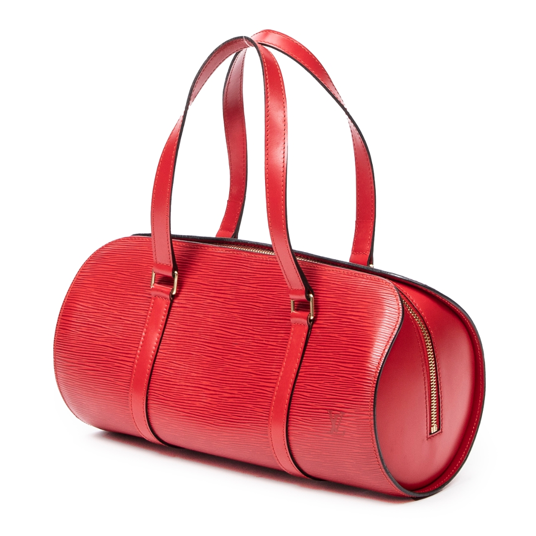A vintage Louis Vuitton Soufflot bag crafted in striking red calf leather with the house’s signature textured finish, offering a bold yet refined interpretation of a classic cylindrical silhouette. The structured form is complemented by matching leather handles and subtle LV embossing, delivering a clean and elegant aesthetic that stands out effortlessly.