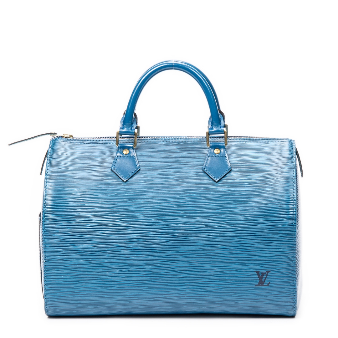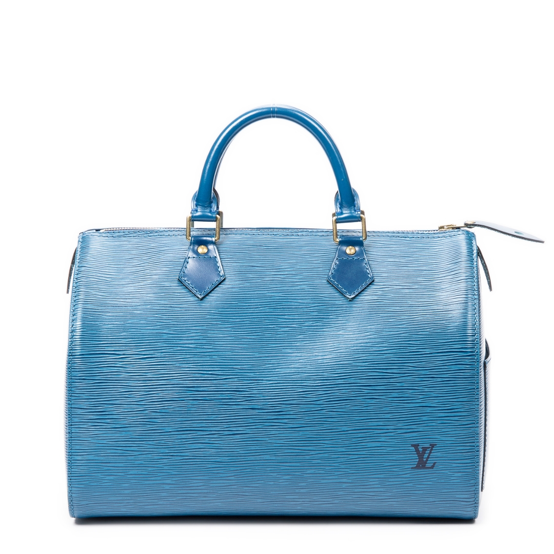 A vintage Louis Vuitton blue calf leather Speedy bag with a certificate of authenticity. Approximately 22cm height, 32cm width.