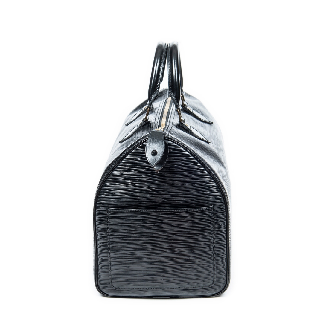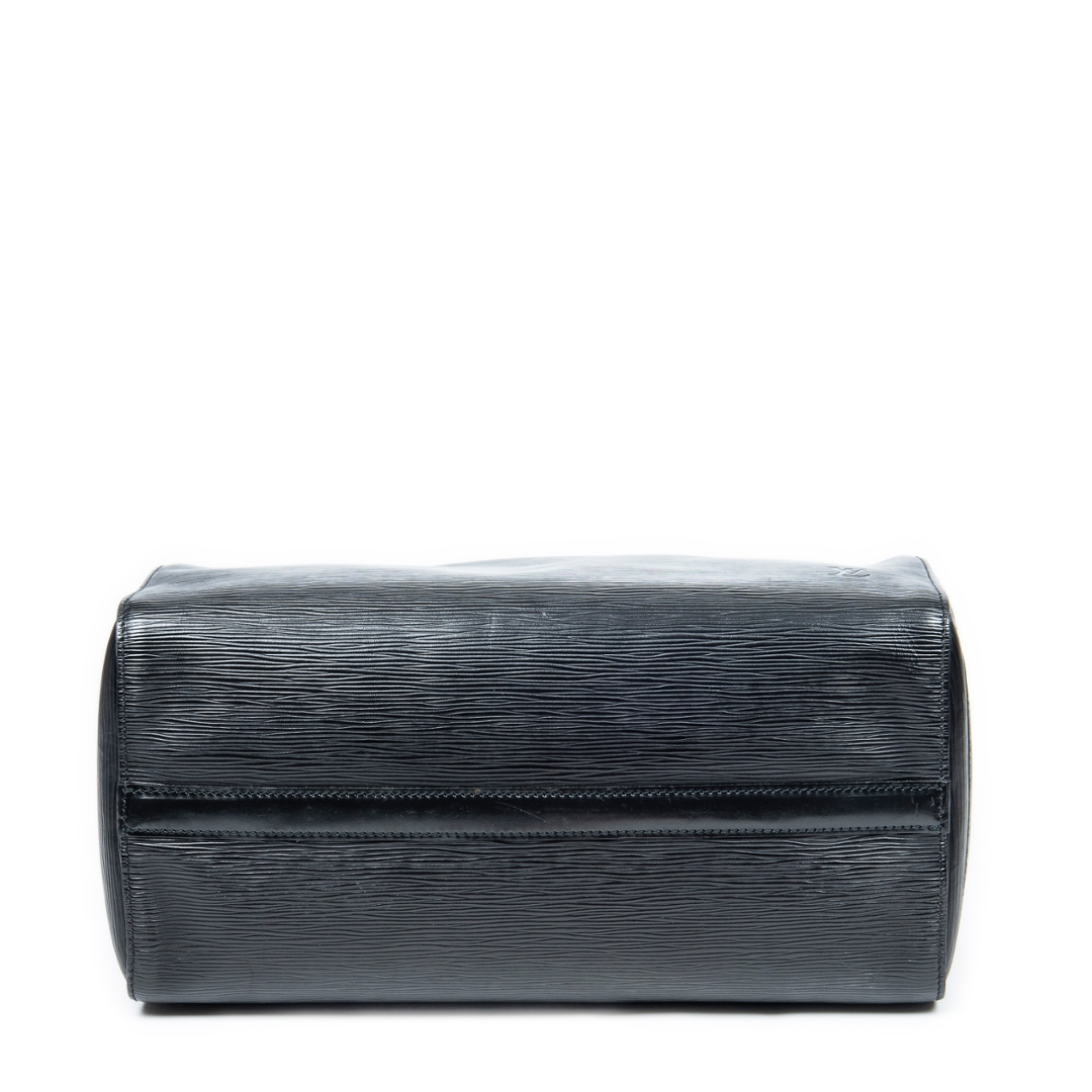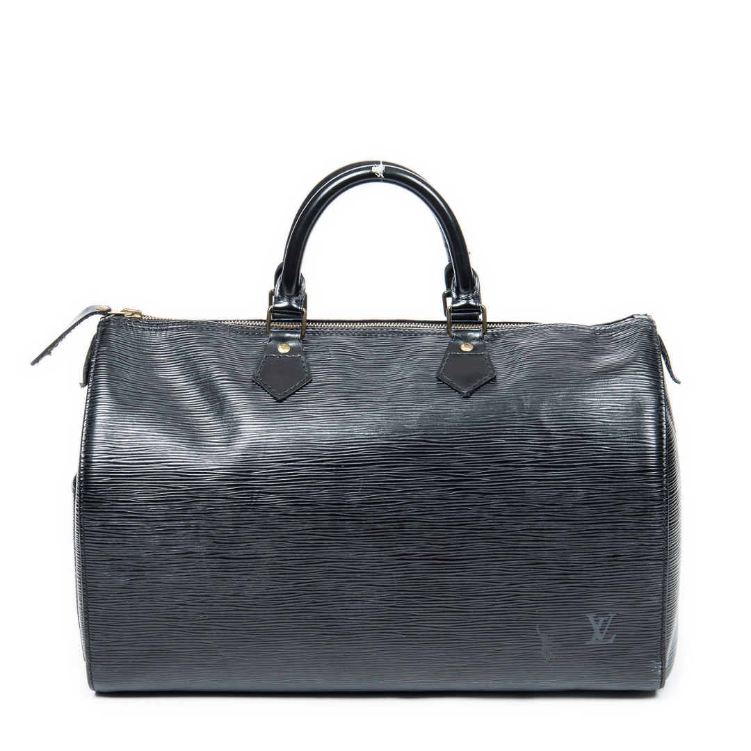 A vintage Louis Vuitton black calf leather Speedy bag with a certificate of authenticity, Approximately 24cm height, 37cm width.