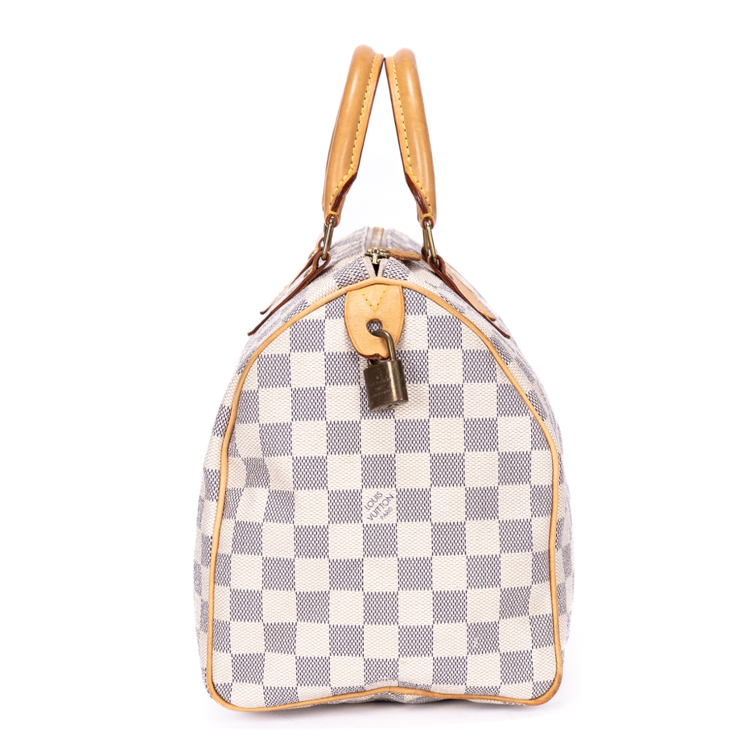 A vintage Louis Vuitton white coated canvas Speedy bag with a certificate of authenticity. Approximately 22cm height, 31cm width.