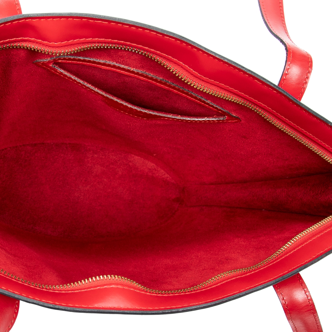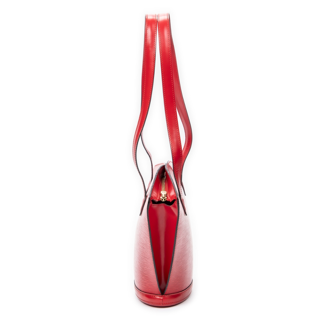 A vintage Louis Vuitton red calf leather St-Jacques Long Straps bag with a certificate of authenticity. Approximately 24cm height, 23cm width.
