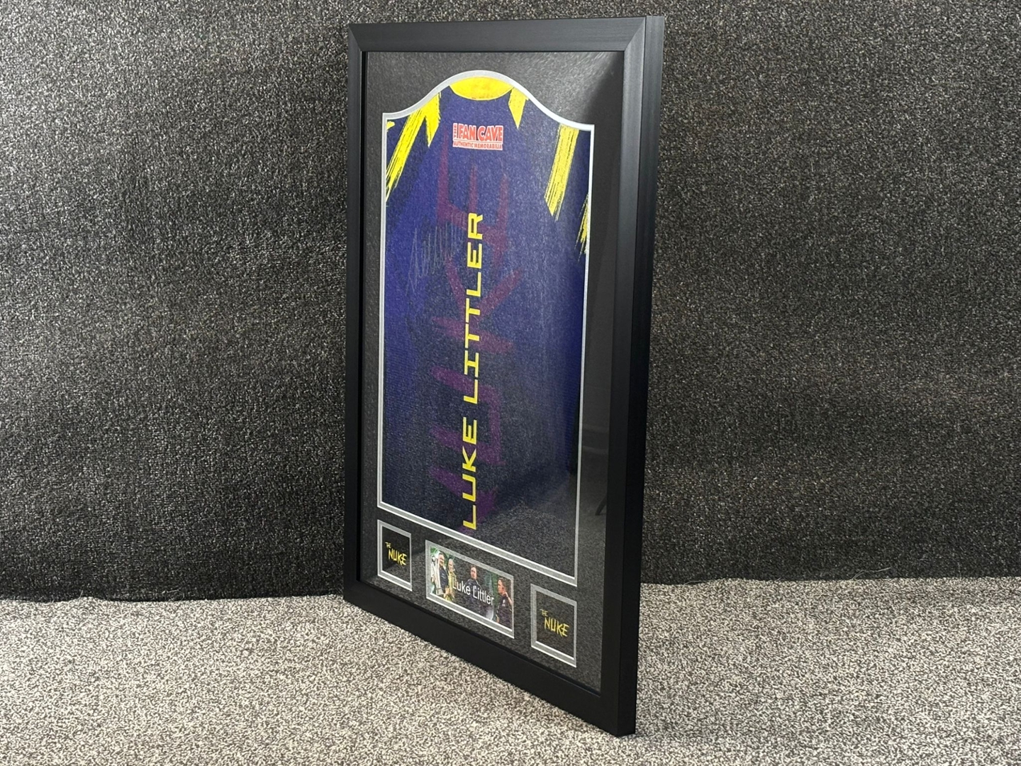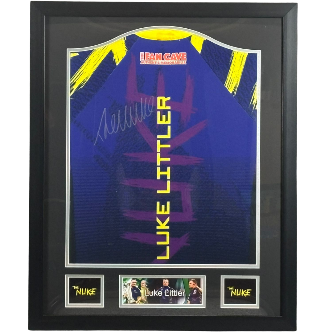 A signed and authenticated Luke Littler Shirt in a presentation frame. Approx 86cm height, 68cm width.