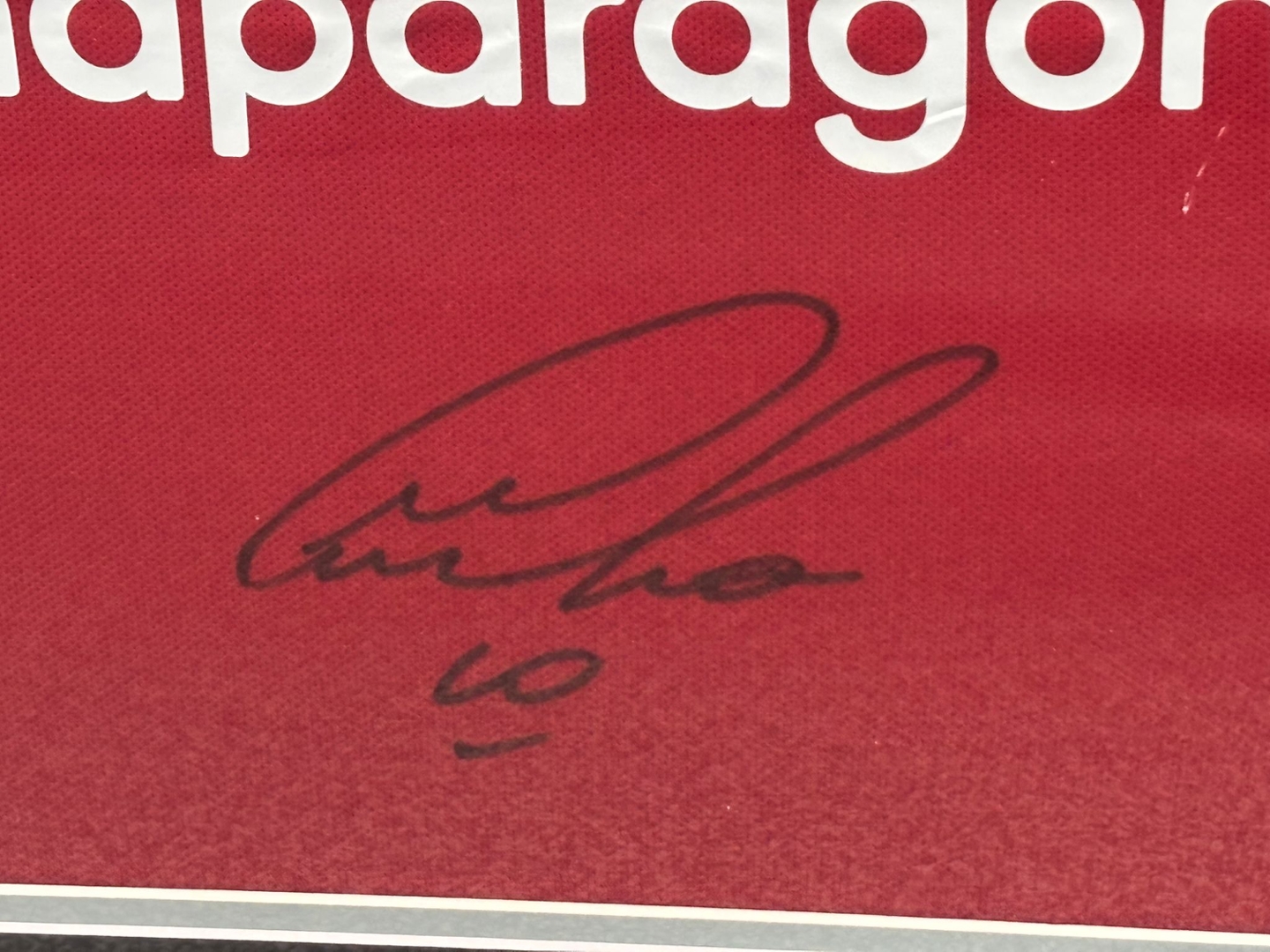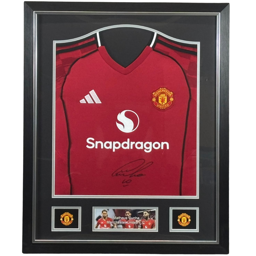 A signed and authenticated Matheus Cunha Man United Football Shirt in a presentation frame. Approx 83cm height, 68cm width.