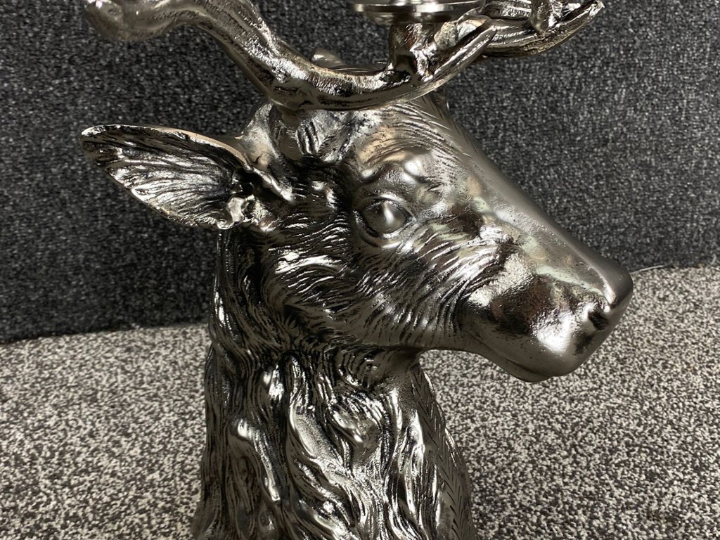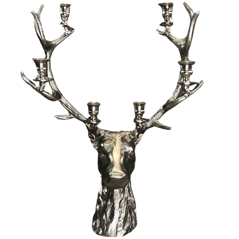 This unique candle holder seamlessly blends modern elegance with a rustic, nature-inspired aesthetic, making it a perfect centrepiece for dining rooms, living spaces, or special events. The shiny silver finish adds a touch of sophistication, while the stag's detailed features evoke a sense of wilderness and natural beauty. Ideal for creating an ambient glow, this piece not only serves as a practical candle holder but also as an artistic statement that adds charm and warmth to any space.
