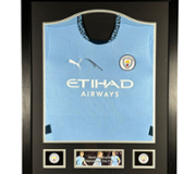 The centrepiece of this display features a rare signed photograph of Tyson cradling one of his famed tigers, showcasing his raw yet charismatic personality. Surrounding it are dynamic action shots from his electrifying boxing matches, alongside a commanding portrait of Tyson, highlighting his powerful physique and fierce demeanour in the ring. The bold typography and sleek silver frame further enhance the piece’s visual appeal, making it a standout addition to any collection.